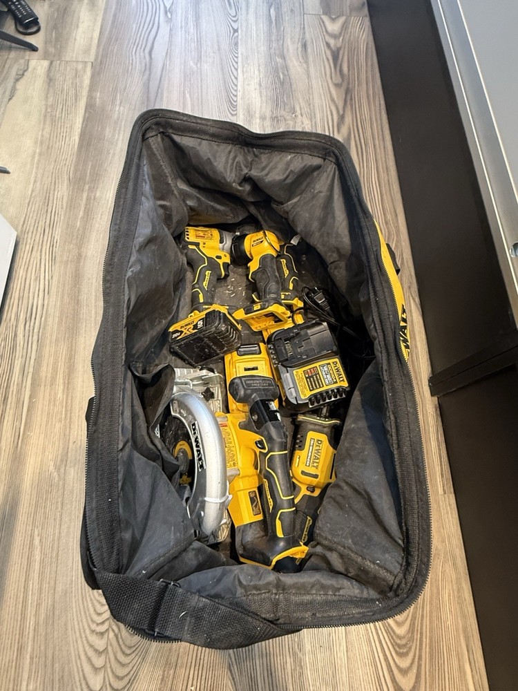 5 Piece Dewalt Tool Set With 3 Batteries, Charger, and Bag DCF809- Atomic 1/4" Impact Driver, Brushless- Good Condition with normal signs of use/wear, including peeling label, shown in photos. Tested, Works Great DCD794- Atomic 1/2" Drill Driver, Brushless- Fair Condition, Definite signs of use/wear, including scuffs/scrapes to chuck, Shown in photos. Tested, Works Great DCL040- LED Work Light, Great Condition with minimal signs of use/wear, including scratches to light cover, does not affect function. Tested, Works Great DCS369- Atomic Reciprocating Saw, Brushless- Good Condition, Definite Signs of use/wear, including scuffs to shoe, shown in photos. Tested, Works Great. DCS565- 6.5" Sidewinder Style Circular Saw, Brushless. Great Condition with normal signs of use/wear. Tested, Works Great. DCB1104- 4 Amp Battery Charger- Great Condition with minimal signs of use/wear. Tested, Works DCB2108- 8AH Battery, 20V MAX XR PowerPack, Great Condition with normal sign of use/wear. Tested and works. DCB205- 5AH Battery, 20V MAX Premium, Fair Condition with definite signs of use/wear, shown in photos. Tested, Works DCB203- 2AH Battery, 20V MAX. Good Condition with minimal signs of use/wear. Tested, works Also included, Large Dewalt tool bag, Good Condition with definite signs of use/wear, shoulder strap pad is torn, shown in photos. Bag is sturdy and fully functional.