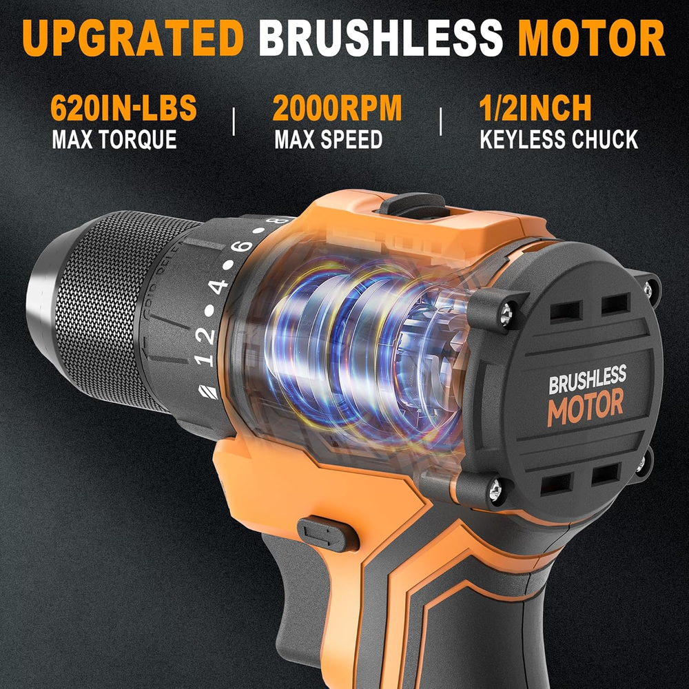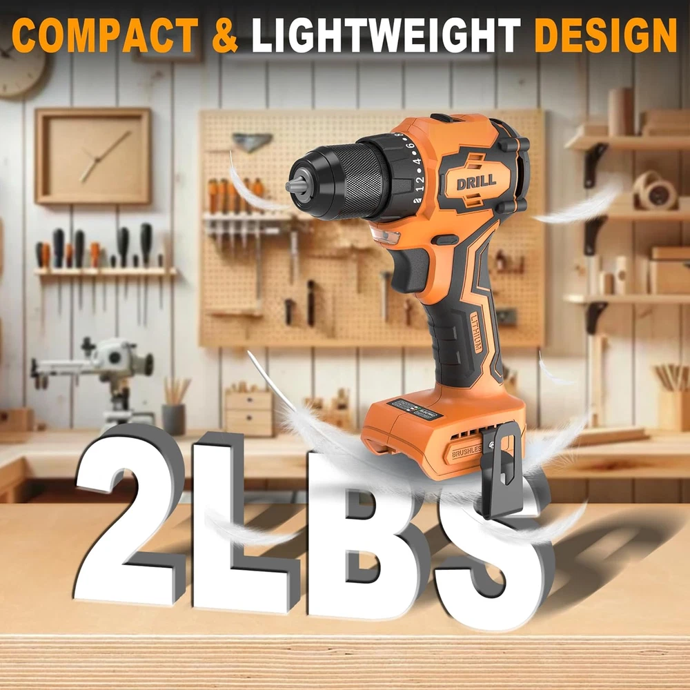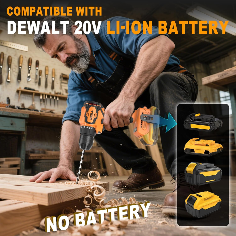 NOTE: Product color and logo may vary randomly due to inventory batch differences, but functionality and quality remain consistent. Rest assured! TIP: Cordless drill does π‘π’π§ ππ‘πππ¨ππ πππ§π§ππ₯π¬ ππ‘π ππππ₯πππ₯, π§π’π’π π’π‘ππ¬.. Compatible with DeWALT 20V MAX battery. POWERFUL BRUSHLESS MOTOR: Equipped with a high-efficiency brushless motor, the cordless drill delivers 620 In-lbs of torque and 2,000 RPM speed, ensuring precise performance in wood, metal, and delicate materials. COMPACT AND FLEXIBLE: The cordless drill adopts a compact design, making it nearly 15% smaller than similar models. Its lightweight and portable build allows easy operation in tight spaces, reduces operator fatigue, and enhances job site flexibility. 2 SPEEDS, WIDE APPLICATION: With a dual-speed configuration (0-500/0-2,000 RPM), the drill intelligently adapts to material needsβlow speed for controlled torque and high speed for rapid drillingβensuring tasks from delicate DIY crafts to rugged construction operate at their ideal pace. SAFETY ASSURED: The brushless drill integrates a high-brightness LED light to illuminate dark workspaces, improving visibility for safer operations and professional-grade precision. USER-FRIENDLY FEATURES: Designed for convenience, the drill includes a belt clip for easy carrying, a magnetic bit holder for secure tool retention, and a 1/2-inch chuck for quick bit changesβall enhancing your workflow efficiency. ERGONOMIC HANDLE: Ergonomically designed, the drillβs contoured handle minimizes hand strain during extended use, offering a comfortable grip for a more enjoyable working experience. Product Description