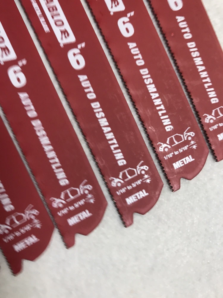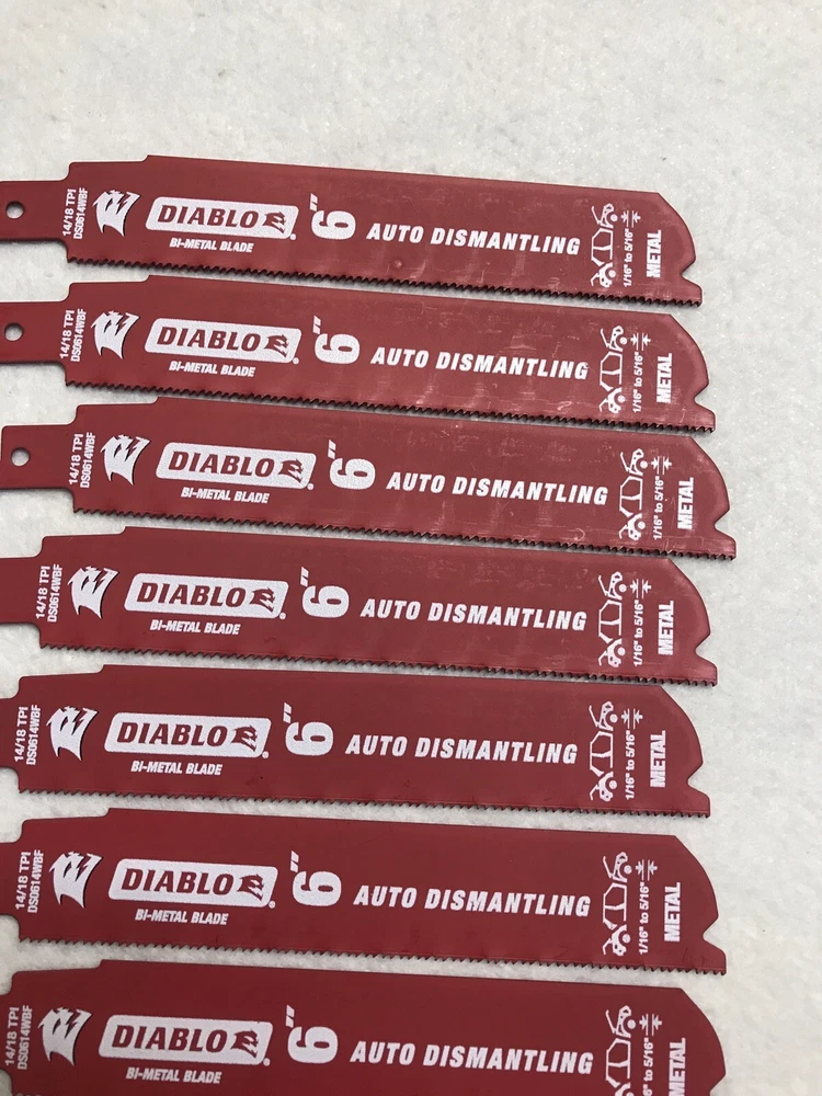 50 Pack Diablo 6” Reciprocating Sawzall Saw Blades 14/18 TPI Auto Dismantling Diablo next generation Steel Demon reciprocating saw blades are specifically designed for maximum performance in metal cutting applications. • Dual Tooth design features a double tooth configuration with small gullets for faster material removal and extra durability. • Perma-shield coating protects the blade from heat, gumming and corrosion • 1 in. Demolition body for straighter cuts with less vibration. Features: • Diablo Steel Demon • Bi-Metal Cobalt • 6-inch • 14/18 Teeth per Inch • 3/32-inch to 5/16-inch • Fire and Rescue Auto-Dismantling • Swiss Made