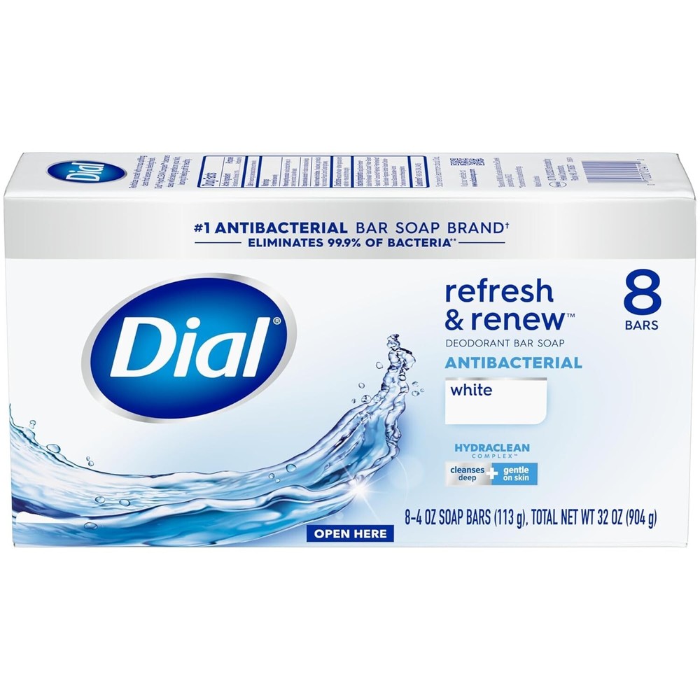 Dial Antibacterial Bar Soap, Refresh & Renew, White, 4 oz, 32 Bars new with tags Description Size: 4 Ounce (Pack of 32) Brand Dial Item Weight 128 Ounces Scent White Age Range (Description) Adult Skin Type All About this item Feels deeply cleansing but is gentle on skin for an ultimate shower experience. Eliminates 99.9% of bacteria encountered in household settings. Leaves skin feeling clean, moisturized, and healthy. Refreshing White fragrance. Contains (8) four ounce bar soap. Dermatologist tested & approved under the Leaping Bunny cruelty free program. Free From: Parabens Phthalates Silicones Sulfated Surfactants Packaging may vary SHIPPING MANAGED BY SELLER DELIVERD AT YOUR DOOR STEP IN TO 5 TO 6 BUSINESS DAYS
