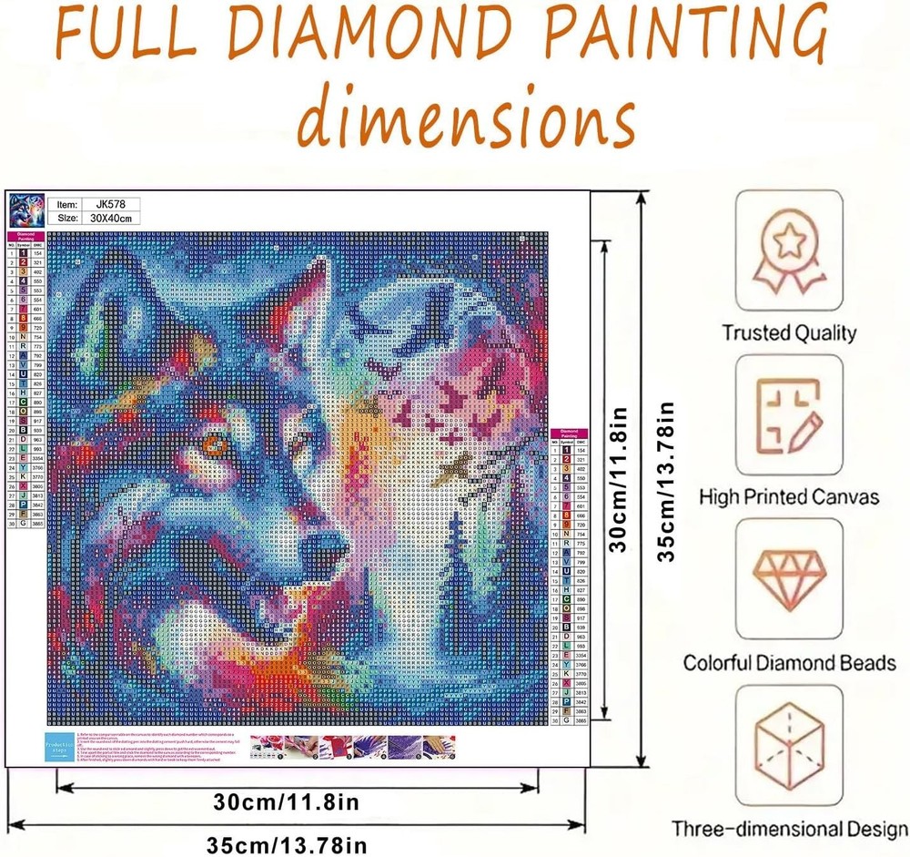 Diamond Art Painting Kits for Adults, Wolf 5D Diamond Painting Dots Art Kits for About this item 【Diamond Painting Kits for Adults 】This wolf diamond art painting is suitable for any teenager and adult. You can fill in the corresponding diamond according to the numbers on the canvas to create very beautiful and artistic gem painting, the adult diamond painting kits are simple to operate and easy to use. Just enjoy creating a stunning work of art, everyone could be a good artist. 【Shining Diamond Painting】 Our 5D DIY diamond painting kits for adults is meticulously crafted to deliver unparalleled quality. Round diamonds cover the whole picture, making the picture more shiny and realistic, and the Diamond art kits come as a canvas with a sticky background that is protected by a plastic covering, the background is clear, the letter symbols are clear and easy to read. 【Relax and Fun】Diamond art painting is a great way to relax and adjust emotionally. It’s funny and easy, you can complete this creative gem painting with your family, which not only enhances the feelings between your family, but also gains the sense of accomplishment of completing the artwork. 【Great Souvenirs and Home Decor】 The finished diamond art painting looks like a professional artwork, an excellent decoration for your home. 5d diamond painting can be used as a great and meaningful souvenir to give to your family or friends on birthdays, Thanksgiving, Christmas, Father's Day and other festivals. At the same time, dot art for adults are very suitable for hanging in your bedroom, living room or office. When people see your DIY art works, they will definitely be full of praise.
