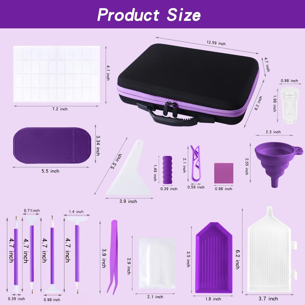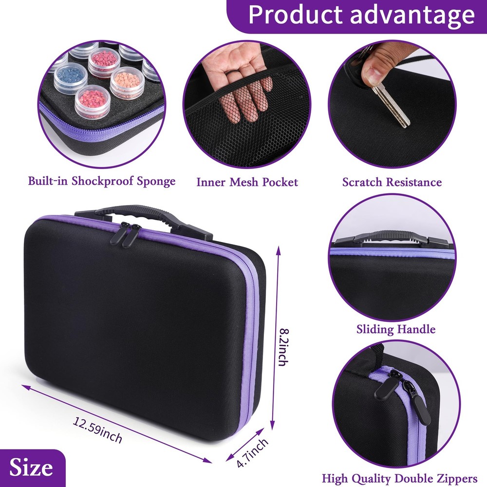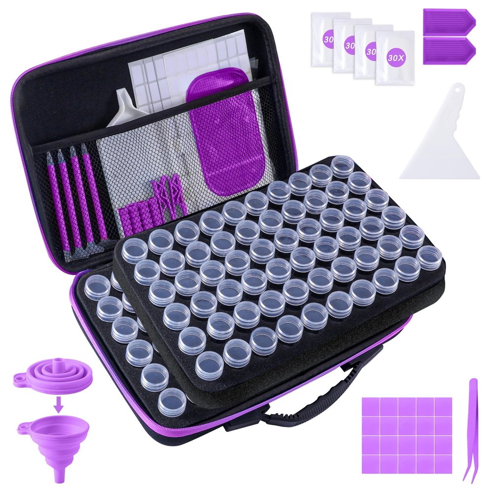 Diamond Art Storage Containers LARGE CAPACITY AND MULTIFUNCTIONAL: There are 120 slots diamond storage bottles for packing diamonds and painting different colours and models of beads. It can also store many small items such as rings, necklaces, sequins and so on DIAMOND PAINTING STORAGE: The mesh bag can hold all the diamond painting accessories, and the bottom foam provides shockproof protection for the diamond container. Make sure everything is neat and tidy, say goodbye to cluttered workspace DURABLE AND EASY TO CARRY: The diamond art storage box is sturdy in quality and designed with a double zip handbag to withstand frequent use. Equipped with sturdy handles to make your travelling and carrying more convenient PERFECT GIFT: The tool can be used by 2-3 people at the same time. You can complete the diamond painting with your kids to promote parent-child relationship and their hands-on ability. It can also be used as a birthday or holiday gift for your relatives and friends PACKAGE INCLUDES:he diamond painting kit includes Diamond Painting Storage Box、120 Slot Diamond Storage Bottle、Blank Sticker Sheet、4 Diamond Pens、Diamond Corrector、20 Pieces of Glue、120 bags、Iron Tweezer、4 Anti-skid pen sleeves、Anti-skid pad、Folding Funnel、3 Diamond Trays、4 Canvas Clips
