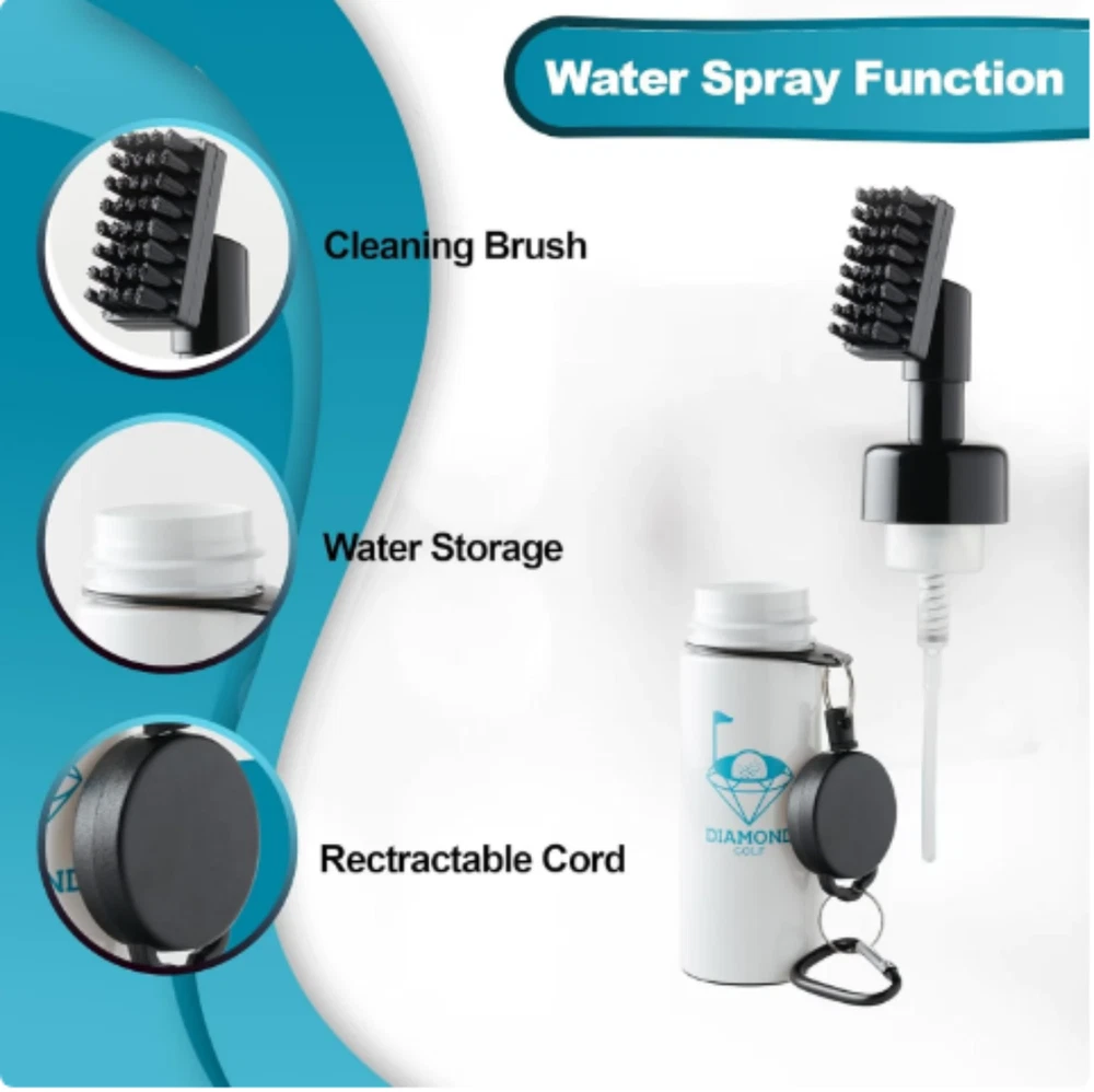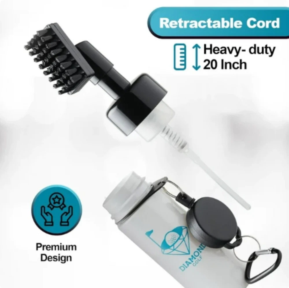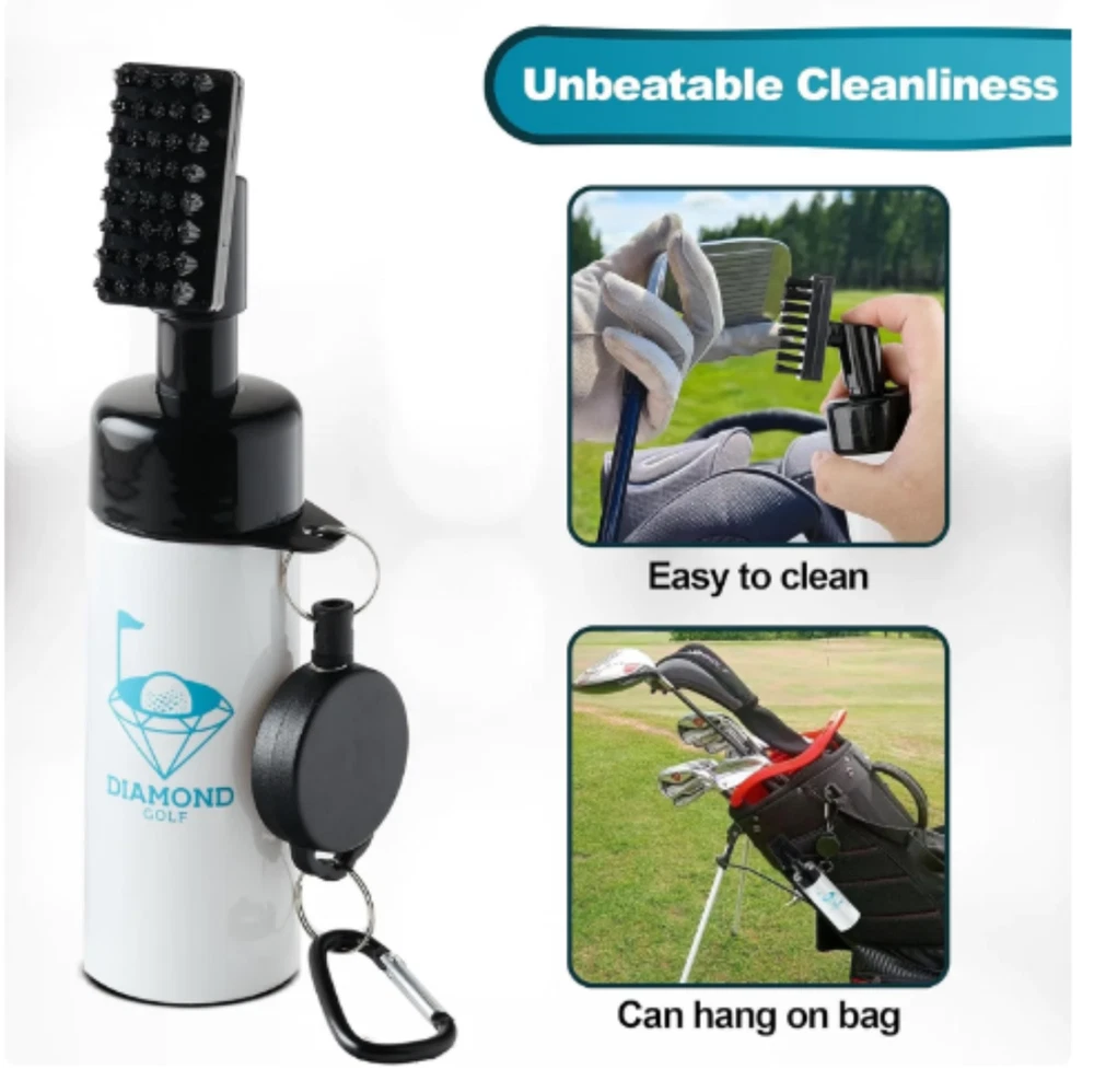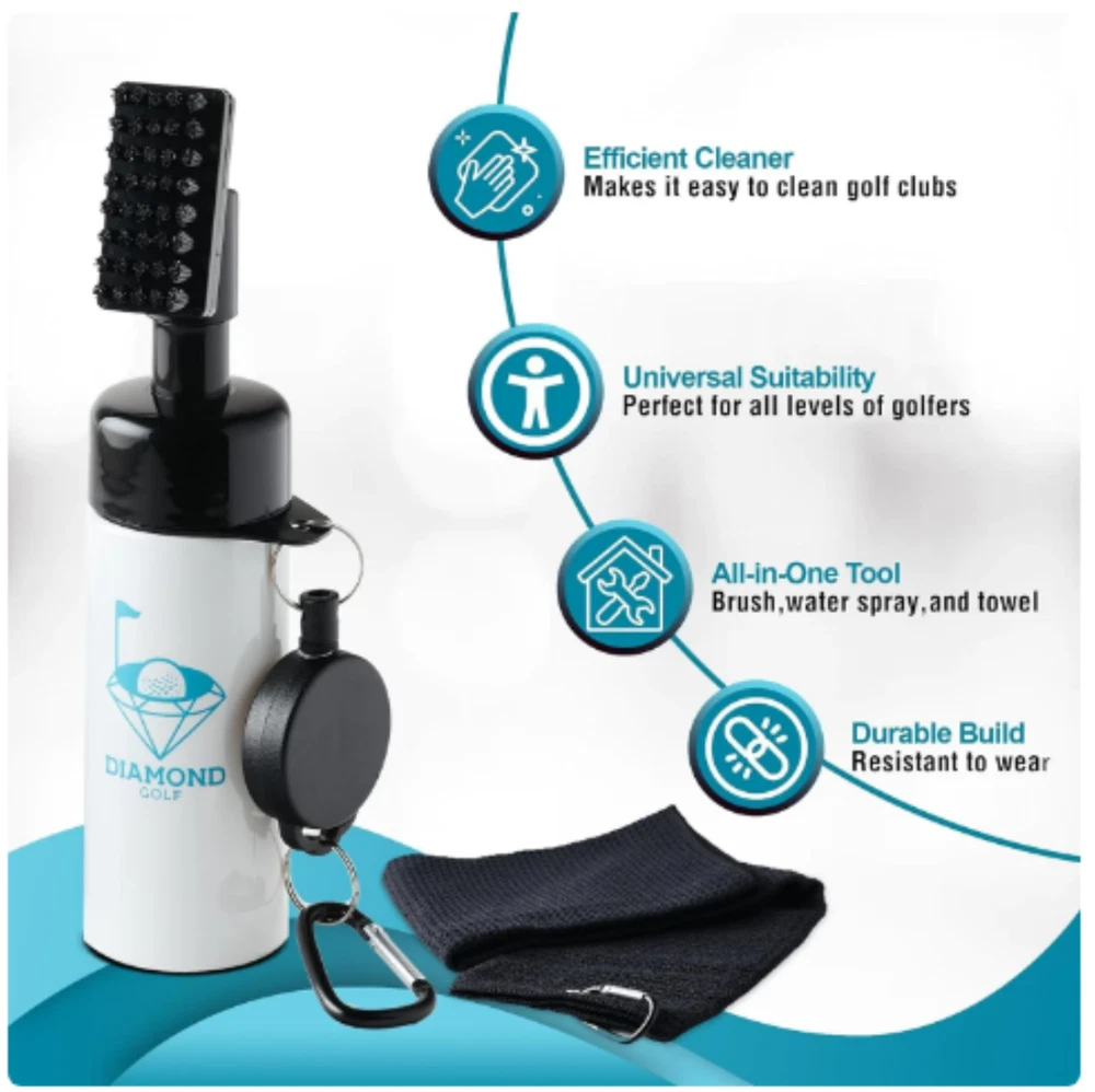 Diamond Golf Club Brush with Water - Premium Golf Brush and Towel Set - Durable Golf Cleaning Brush and Groove Tool with Sprayer Product Details Unbeatable Cleanliness - Diamond Golf's dual-action brush head and water spray technology scrub off even the toughest grime so you regain the optimum spin and control you need in your game. Quality You Can Trust - Built from high-grade materials, our golf club brush is tougher than a 200-yard bunker shot. This bad boy's bristles won't bail on you like your flakey golf buddy. Complete Cleaning Kit - Includes a luxurious 16x24-inch golf towel. Fitted with a carabiner, the towel easily attaches to your bag, putting everything you need for pristine clubs within arm's reach. Secure & Convenient - Our robust retainer clip grips your Diamond Golf brush like a pro holds onto the lead in the final round. Focus on your swing, not on finding your cleaning tools. A Diamond Guarantee - Our golf brush set offers great value and comes with a 30-day money-back guarantee, providing you with high-quality golf accessories that make your life easier, and risk-free.