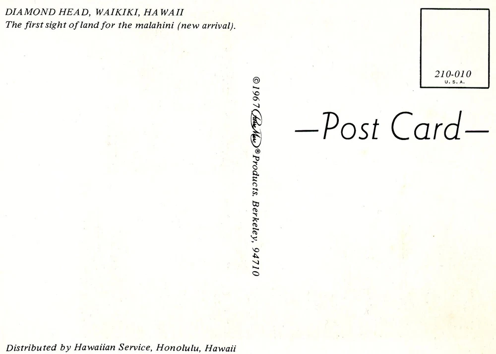 Diamond Head, Waikiki, Hawaii, 1967 --POSTCARD Unused postcard in Very Good Condition 6" x 4" Chrome (c. 1939-present) (210-010) Excellent Condition: Like mint in appearance with no bends or creases, or rounded or blunt corners. May be postally used or unused and may have writing and postmark only on the address side. A clean, fresh card on the picture side. Very Good Condition: Corners may be just a bit blunt or rounded. Almost undetectable crease or ben that does not detract from overall appearance of the picture side. May have writing or postal use on address side. A very collectible card