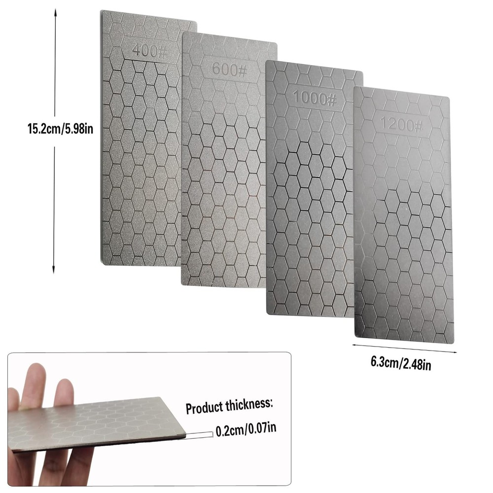 Compared with traditional grindstones, the advantages of these sharpening stones are that the grinding surface remains absolutely flat and will not form grooves over time Features: - High appearance, delicate and practical - Small and light, very suitable for carrying - This kind of diamond sharpening stone is suitable for tableware at home, especially the kitchen - This is essential in order to provide consistent straight edges on precision cutting tools such as wood chisels and plane irons Specification: Material: Diamond Sand Color: Silver Sharpening Stone: 400#, 600#, 1000#, 1200# Size: 15.2 x 6.3 cm/5.98 x 2.48 inch Thickness: 2mm Package Included: 4 x sharpening stones Warm Tips: - Do not put the sharpening stone in the dishwasher - Due to manual measurement, display brightness, lighting effects, etc., there may be slight differences in color and size between the photo and the actual object MATERIAL -- This kind of diamond sharping stone uses diamond as the abrasive, which is the hardest grinding medium at present HONEYCOMB DESIGN -- The unique honeycomb design ensures that the dust generated during the grinding process will not affect the sharpening effect COARSE GRINDING & FINE GRINDING -- Rough grinding first, then fine grinding. You can use 400# or 600# diamond grindstone to grind off the rust, and use 1000# or 1200# to make the blade sharper WIDE APPLICATION -- Suitable for kitchen tool sharpening, such as Cutlery, Scissors, Hunting pocket knives and Blades. This sharpening stone also works for Carving Knives, Gardening Tools etc VALUE PACKAGE -- 4 x diamond sharpening stones (400#, 600#, 1000#, 1200#); Size: 15.2 x 6.3 cm/5.98 x 2.48 inch; Thickness: 2mm; Weight: 79g. small and light, very suitable for carrying