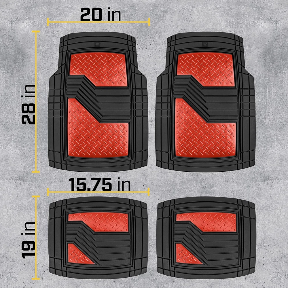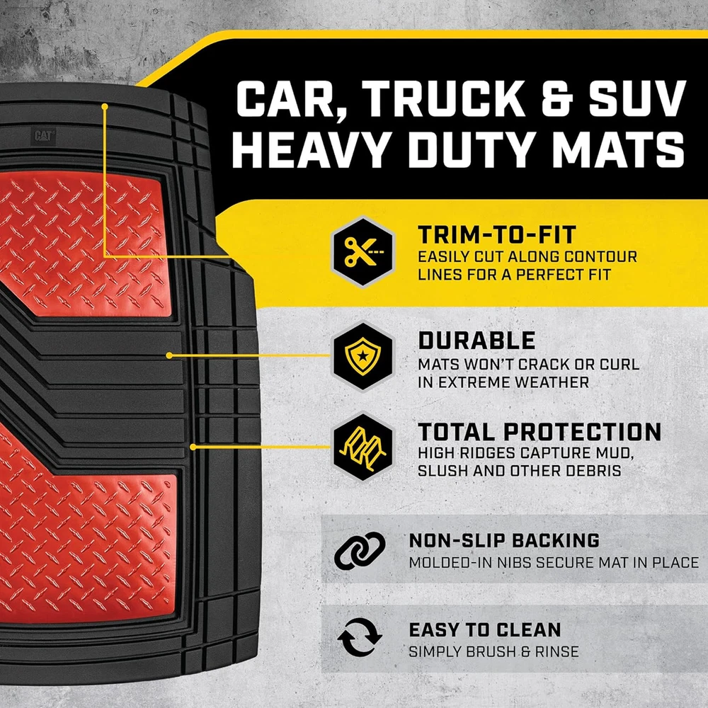Store New Arrivals Add to Favorite View Feedback Contact ® Diamondshield™ Rubber Floor Mats for Cars Trucks Suvs, All Weather Protection Front & Rear Car Mats Set, Heel Pad & Anti-Slip Backing, Universal Fit Trim-To-Fit Rubber Floor Mats for Car, Red Description Item model number CAMT-2314-BK/RD Auto Part Position Front Inside, Rear Inside Fit Type Universal Fit Product Dimensions 28"L x 20"W x 1"Th Material Rubber Vehicle Service Type Passenger Car, Van, SUV, Truck Color Black/Red Country of Origin China Manufacturer Part Number CAMT-2314-BK/RD Item Weight 8 pounds OEM Part Number CAMT-2314-BK/RD Automotive Fit Type Universal Fit Special Features Custom Trimmable Gridlines, All Weather, Anti-Slip Nibs, Stain Protection, Universal Fitment Model CAMT-2314-BK/RD Built for Protection - Guard Against Spills, or Debris - Built to Last through Rain, Snow, Mud and More. Dimensions: Front: 28" x 20" in / Rear: 19" x 15.75" in No-Slip Grip - Rubberized Nibs on the Bottom so the Mat Does not Move - Ergonomic Grooves on Top to Give your Foot Traction & Comfort Simple Installation - Place the Mats on the Floor of your Vehicle - Easily Remove and Clean the Mats of any Dirt & Spills Designed for Compatibility - Made to be Trimmable to Fit your Vehicle’s Floor Contours with only a Pair of Scissors Our Advanced Performance Rubber Polymers are Tested for Extreme Conditions to Ensure they Don't Crack, Split or Deform BDK CAT® Heavy Duty All-Weather Tough Rubber Car Floor Mats with Metallic Design Protect and enhance your vehicle’s interior with the BDK CAT® Heavy Duty All-Weather Tough Rubber Car Floor Mats. Perfect for cars, trucks, SUVs, vans, and sedans, this 4-piece set includes front and rear floor mats along with a universal trim-to-fit trunk cargo mat liner for complete all-weather protection. Designed to handle mud, dirt, spills, and everyday wear, these durable rubber mats safeguard your vehicle’s floors while adding a sleek metallic design for a modern touch. Constructed from high-quality, heavy-duty rubber, these mats are engineered to provide lasting durability under the toughest conditions. Their deep grooves and textured surface trap dirt and debris, preventing messes from spreading and making cleanup a breeze. The anti-slip backing keeps the mats securely in place during sharp turns and sudden stops, offering both safety and convenience. With a customizable trim-to-fit design, these mats can be tailored to perfectly fit your vehicle, ensuring maximum coverage and protection. Designed for practicality and style, these mats are easy to clean—simply remove, rinse, and reinstall for a fresh, clean look. The addition of the universal cargo mat liner offers extra coverage for your trunk, protecting it from heavy loads, spills, and dirt. Whether you’re dealing with harsh weather conditions or everyday messes, the BDK CAT® Heavy Duty Rubber Floor Mats deliver reliable performance and an upgraded interior look. Ideal for those seeking all-weather, trim-to-fit car mats that combine durability, style, and protection, this set is a must-have for any vehicle. ABOUT US We offer the best prices around on high quality products. Our E-store includes media such as books, movies, music and games while offering electronics, toys, sporting apparel, clothing, tools, general home, garden items and more. SHIPPING We are always working hard to ensure your package arrives as soon as possible. Please understand that some factors like weather, high postal traffic, and the performance of shipping companies are outside of our control. We offer free shipping to the lower 48 states and ship within 2 business days of payment, usually sooner. We do not accept P.O. Boxes. Please provide a physical address. For shipping outside of the continental USA, we only use eBay's Global Shipping Program.The item is shipped to KY and then sent to the rest of the world. International customers are responsible for all duties and taxes. Continue to check out in order to calculate costs for shipping the item to your country. Messages regarding eBay's Global Shipping Program MUST be directed at eBay EXCLUSIVELY. RETURNS We offer a 30-Day Return Policy on items which you are not completely satisfied with. You have the option for a full-refund or an exchange of the item. No returns are available on items shipped outside of the USA. PAYMENT We accept PayPal. CONTACT US This page content is yet to come Please ad us to your favorite seller and visit again later Thank You CUSTOMER SATISFACTION We try our very best to make sure every customer is completely satisfied. If there's a problem, message us! We're happy to help. WE ACCEPT Copyright © 2021 AutoDS. | All Rights Reserved
