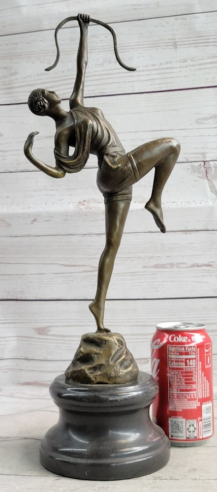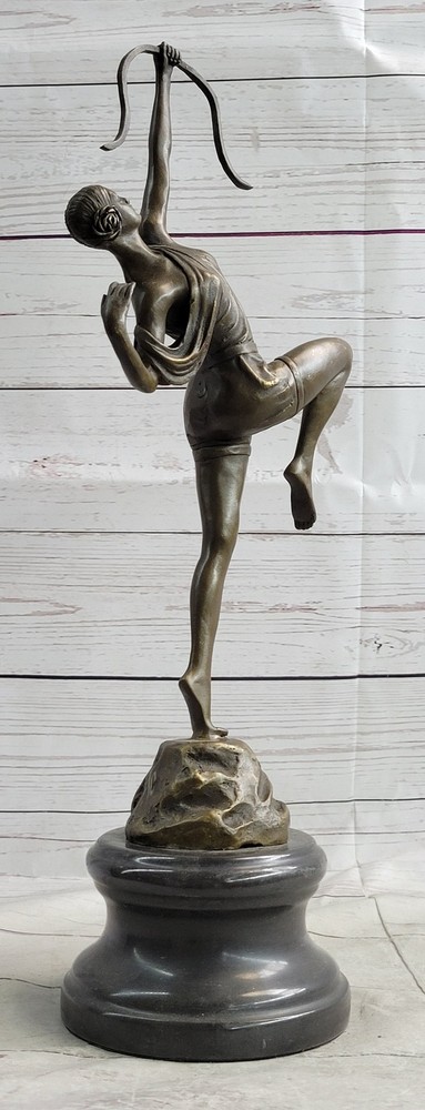 Condition : This sculpture is in perfect condition Bronze Dimensions with Marble Base: Height 17.5" X Width 7" Marble Dimensions: Diameter 5.5" Height without base:14" Weight:9 LBS Inventory:93YRD12434139 Dive into the rich artistic portrayal of the Greek goddess Diana with this intricately detailed sculpture by American artisan Fisher. Diana, a prominent figure in Roman mythology, embodies the spirit of the hunt, symbolizing a profound connection to the wilderness, wildlife, and the lunar sphere. Initially revered as the goddess of hunting, Diana was often accompanied by her youthful and graceful attendants, who joined her in the pursuit of prey. Over time, the Romans equated Diana with the Greek goddess Artemis, expanding her divine attributes to include those of a Moon goddess, complementing the domain of Luna. Honored in ancient Roman religion and revered in contemporary Religio Romana Neopaganism and Stregheria, Diana's influence remains significant, with dedicated shrines in Capua and Aricia, near Rome, serving as testaments to her enduring legacy. Regarded as the twin sister of the god Apollo, Diana is the daughter of Jupiter and Latona, exemplifying a formidable and respected deity within the Roman pantheon. Crafted with meticulous attention to detail, this stunning sculpture captures the essence of the legendary Diana, bringing to life the goddess's strength and grace. With a keen focus on artistic precision, the sculpture embodies the spirit of the hunt, showcasing Diana's connection to the untamed wilderness and her role as the protector of the woodlands. The intricate craftsmanship of the piece reflects the timeless allure and significance of Diana in Roman mythology, depicting her surrounded by the captivating energy of the hunt and the profound reverence for the natural world. As a powerful representation of divine femininity, Diana's portrayal in this sculpture is a testament to her enduring influence and cultural significance throughout history. Elevate your appreciation for classical mythology with this exquisite sculpture, a homage to the revered Greek goddess Diana. Crafted with the utmost dedication to artistic detail by American artisan Fisher, this masterpiece captures the essence of Diana's multifaceted persona, embodying her role as the goddess of the hunt, the protector of wildlife, and the revered lunar figure. The sculpture's intricate design and lifelike representation convey Diana's prowess and elegance, highlighting her influence over the natural world and her significance within ancient Roman mythology. With every meticulously sculpted detail, the sculpture pays homage to Diana's enduring legacy and her lasting impact on the realms of nature and the divine. Artemis Diana the Huntress Archer w/ Bow Bronze Sculpture Statue Figure YRD-1243nbsp; Video will open in a new window Using the eBay App? Paste link into a browser window: [isdntekvideo]