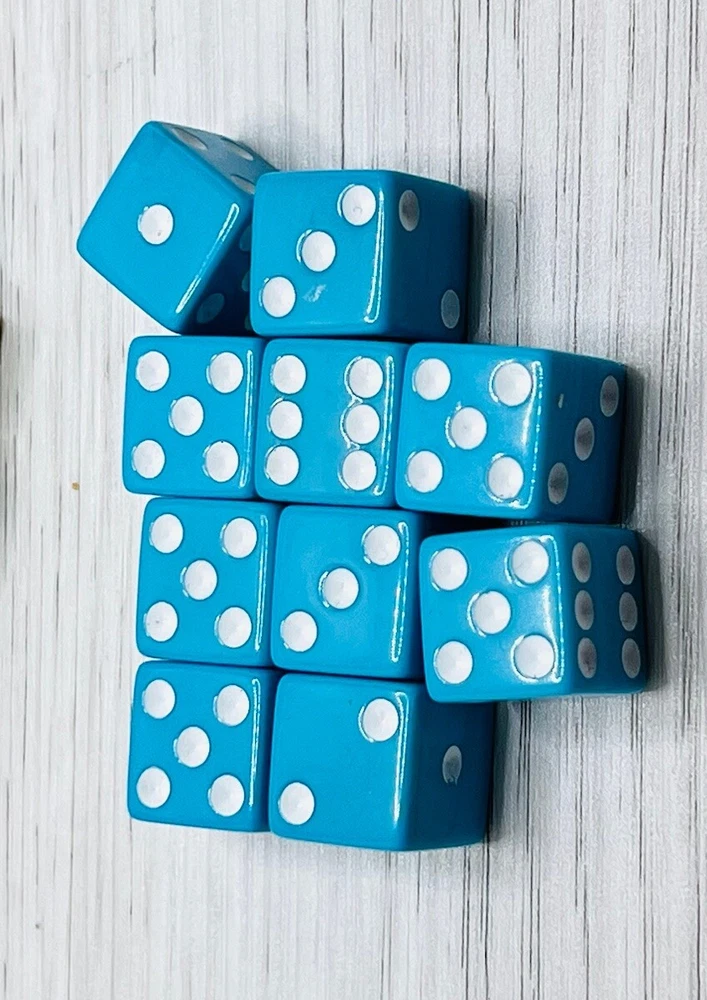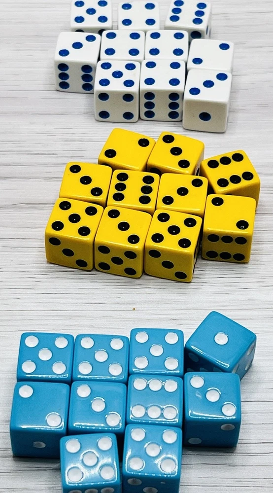 This is a lot of dice. 30 dice total. 10 yellow blk, 10 blue white and 10 white blue 30 total. They are Standard size and weight dice. Replacement dice for board games or role-playing games craps CeeLo multipurpose. Exact items in the photos are the exact items you receive. These items are in great condition. Please visit our store a few more items like these.