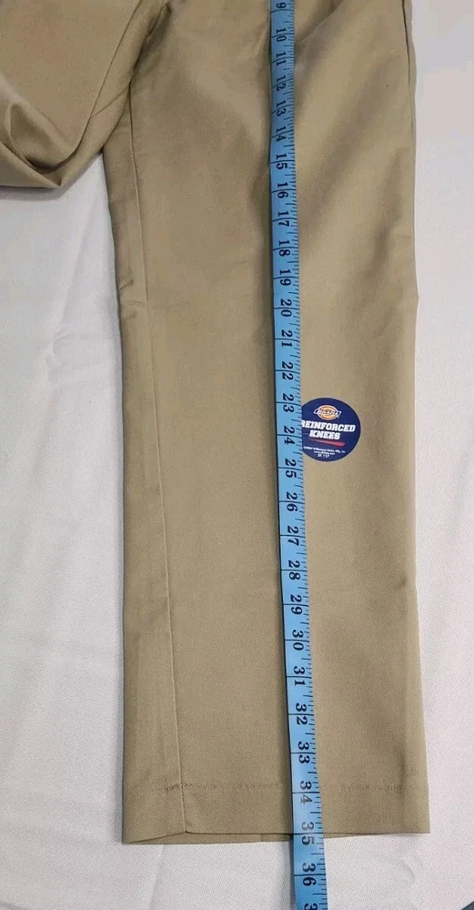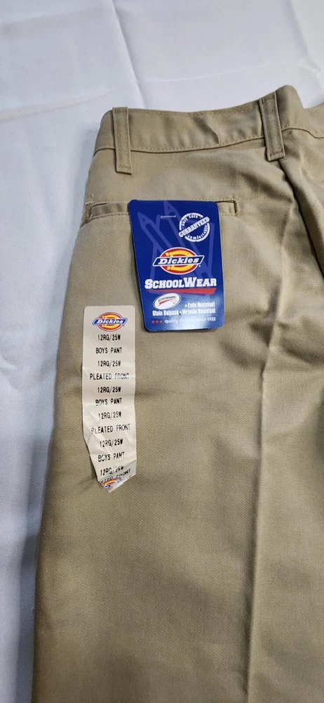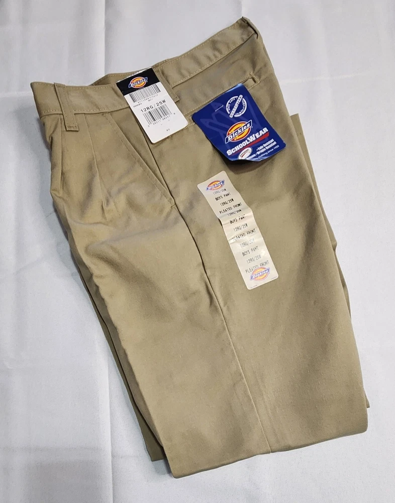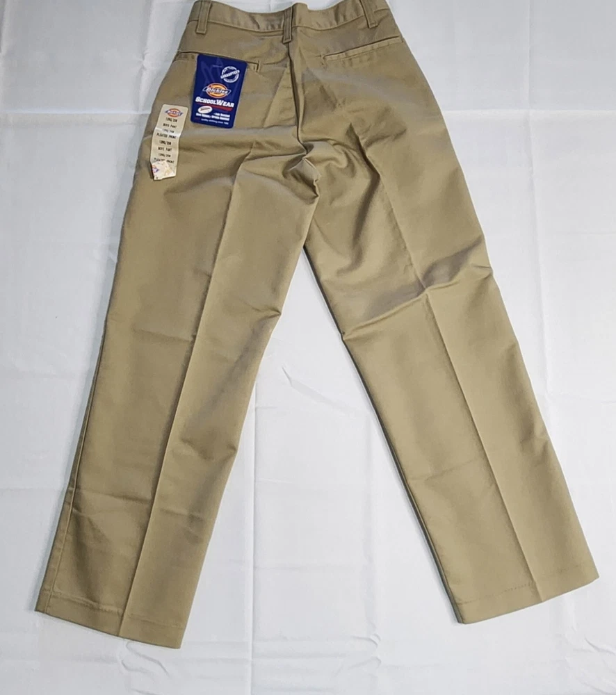 This pair of Dickies pants is perfect for any young boy's school or work uniform. The khaki color and classic fit make them versatile for any occasion. The pants feature a zip and hook & eye closure, as well as pockets for added convenience. Made from a blend of polyester and cotton, these pants are easy to care for and comfortable to wear. They have a 26-inch inseam and are machine washable. Whether your child is playing, walking, or attending school, these pants are sure to be a durable and stylish choice.