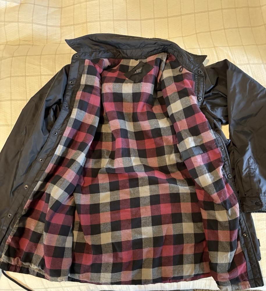 The Dickies Flannel Lined Men’s XL Jacket is a stylish and practical windbreaker perfect for casual or workwear occasions. With a durable nylon outer shell and cozy polyester lining, this jacket offers both protection and comfort. The button-down front and snap button accents add a touch of style to this classic black jacket, which is machine washable for easy care. The XL size and regular fit make it suitable for outdoor activities in the winter, fall, and spring seasons, such as walking and hiking. With the Dickies brand quality and outdoor theme, this jacket is a reliable and versatile choice for men.
