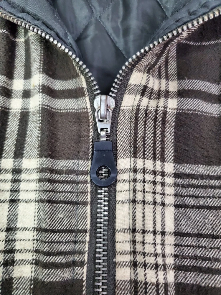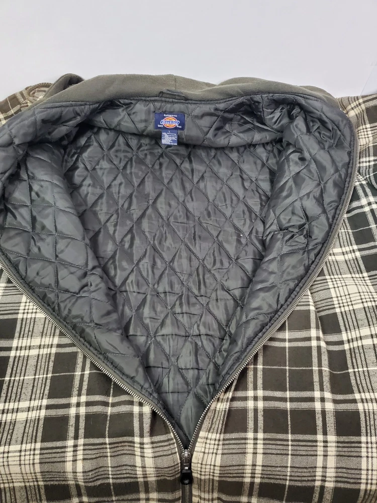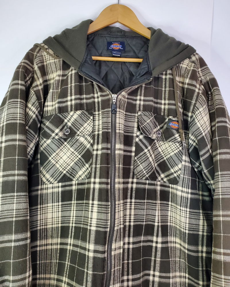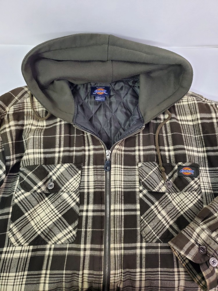 The Dickies Jacket for men in size Large is a stylish and practical outerwear option. Made with a durable cotton outer shell and lined with cozy polyester flannel, this jacket features a quilted lining for added warmth. The brown plaid pattern and hooded full zip design make it versatile for various occasions, including casual outings, workwear, and outdoor activities like walking, hunting, hiking, or skateboarding. With its mid-length fit and regular cut, this jacket offers both style and functionality for the cooler seasons of winter, fall, and spring.