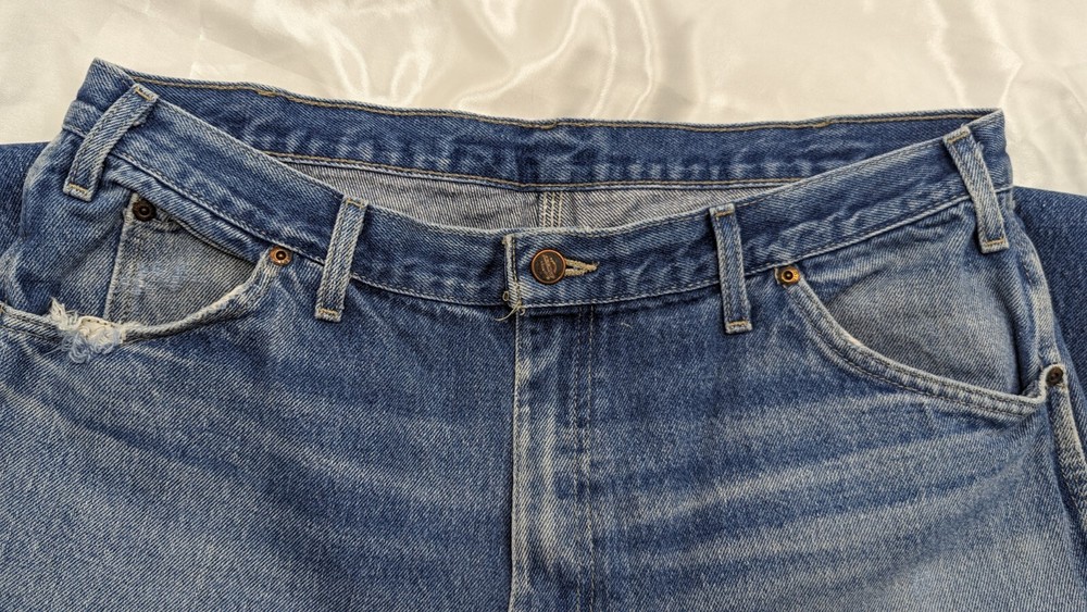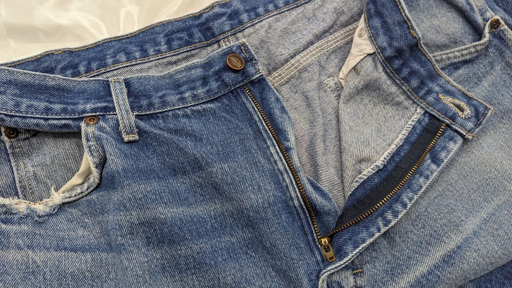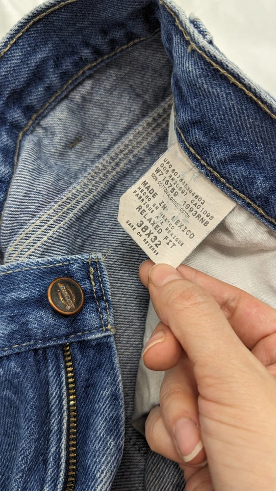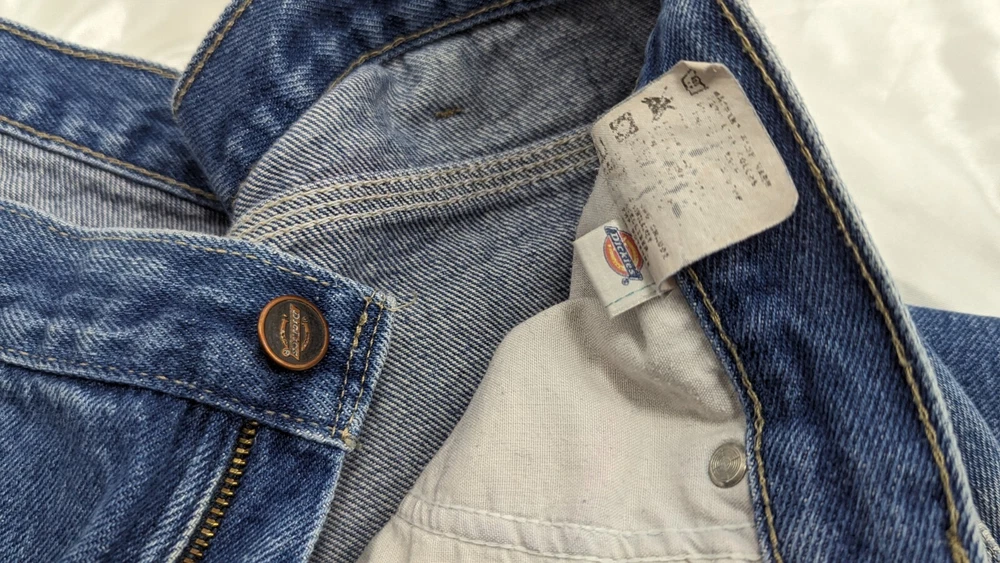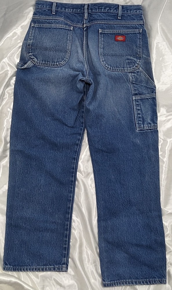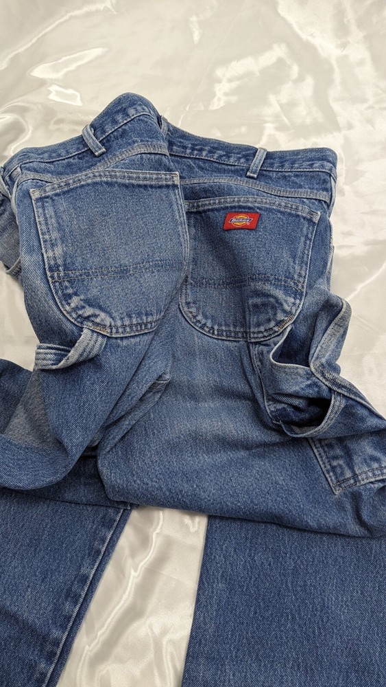Preowned; excellent condition with some obvious fade & light fraying in some areas. I'm pretty sure the side fabric loop has a manufacture defect , with the loop being twisted one too many times before being stitched in Tagged a men's US 38x32 (please refer to measurements/photos for correct inseam), or XL according to their size chart, with a regular/relaxed straight leg fit -Measurements- Waist: 38" Hip: 47" Length: 42" Front Rise: 12 ½" Back Rise: 17" Inseam: 31" Leg Opening: 19" around • Medium wash blue denim shade • Cargo pocket design • Classic "Dickies" embroidered patch on back pocket and branded into buttons • Thick material, 1 side fabric loop, durable belt loops & 2 extra back pockets -Care Instructions- • 100% Cotton • Machine wash warm relevant style terms: boys carpenter jeans, vintage fashion, mens bottoms, frayed, distressed, y2k, biker pants, durable fabric, everyday casual streetwear, unisex, heavyweight, 90s, mid high rise