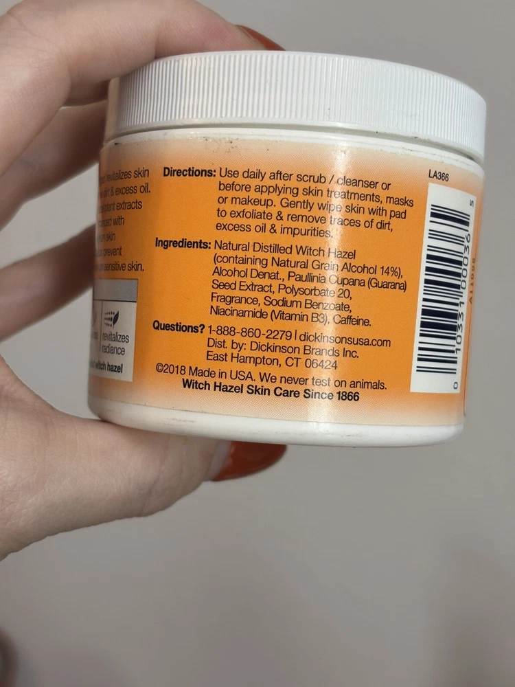 Main Purpose: Clogged Pores, Excessive Oil gtin13: 010331000365 Volume: 60 Wet Pads Features: Paraben-Free, with Caffeine, Vitamin B3 Size: Regular UPC: 010331000365 Formulation: Wet Pad Ingredients: Witch Hazel Type: Exfoliant Brand: Dickinson's Department: Unisex Skin Type: All Skin Types Active Ingredients: Witch Hazel Body Area: Face
