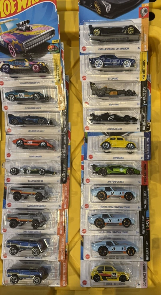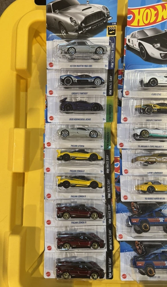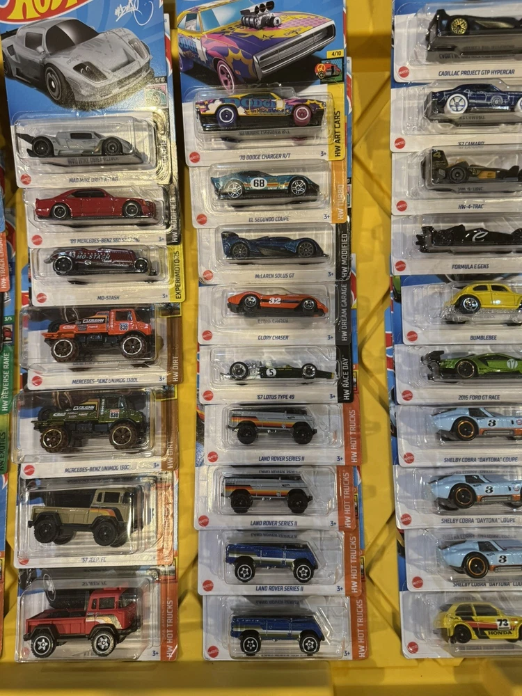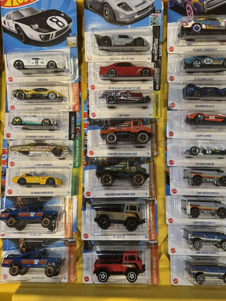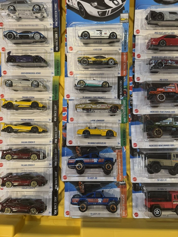 BRAND NEW 42 Hotwheels cars and trucks. PAGANI ZONDA R PAGANI UTOPIA KOENIGSEGG GROUP C FANTASY ASTON MARTIN JEEP J10 DODGE VIPER LAYIN LOWRIDER FORD GT 40 JEEP FC JEEP EL MERCEDES UNIMOG 1300L MERCEDES 560 SEC AMG MO STASH MAD MIKE DRIFT ATTACK LAND ROVER SERIES ll LOTUS TYPE 49 GLORY CHASER MCLAREN SOLUS GT DODGE CHARGER R/T EL SEGUNDO COUPE SHELBY COBRA DAYTONA FORD GT HONDA BUMBLEBEE FORMULA E HW 4 TRAC CAMARO CADILLAC GTP