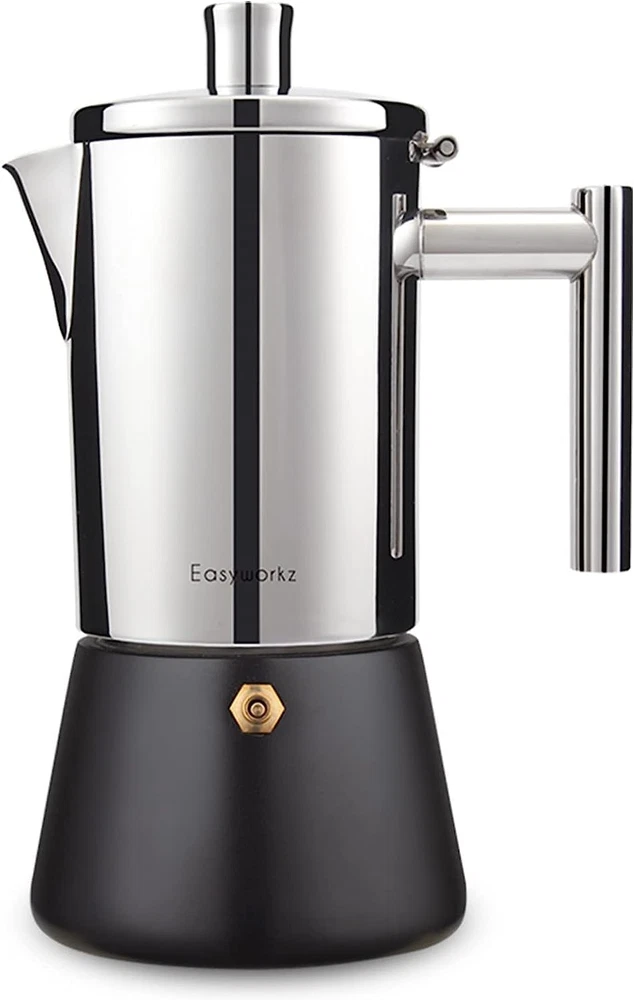 [Elegant and Heat Resistant Design] Used the latest manufacturing technology and combined aesthetics to design this elegant espresso coffee pot. The heat resistant hollow insulated lid and handle grip make it convenient to use. Base is non-stick high temperatured black hard-wearing coating, ensuring its long life time at high temperatured heat resource. [Premium Quality 18/8 Stainless Steel Moka Coffee Pot] Made of 18/8 Stainless Steel with high mirror polishing processed. The ability of anti-rust and corrosion is also the best. Can be used for all kinds of heat resource, such as gas stove , induction burner , electric cooktop.Easy to clean and disassemble. Dishwasher safe. [12 Cups of Espresso ] Could brew 12 full espresso cups (17.5 fl.oz/520ml). Brew with our coffee maker, your coffee will be extra strong ,rich and aromatous. We suggest brew with 40g fine grinding coffee and water for its best tasting. [Reducer&Safe Valve Included] With this coffee reducer, you could make less espresso one time to meet your unique taste. Takes less than 5 minutes to brew on heat and designed with the valve for the double safety. [Well made and Inspected in Own Factory] Made and quality inspected in own factory. Over 10 years' coffee maker manufacturing experience ensures its great quality and we provide 24 months quality guranteed after sale service. Product Description Easyworkz has created this high grade stovetop espresso maker with modern manufacturing technology and crafted to meet the top standards in this industry. Featuring a heavy gauge 18/8 stainless steel construction with high mirror polishing,induction base and fit for all stove tops. It is our Diego Coffee maker! Fresh espresso,classically brewed in a nice and elegant espresso maker. Our Diego espresso maker has an elegant classy design and will be your lifetime moka pot. Enjoy your coffee and have fun everyday with Our Diego coffee maker. Dishwasher safe - Easy to brew and clean stovetop espresso moka coffee pot Tip 1 **For safety, there will be residual water in the boiler to prevent over burning.** If you wish to make less espresso, fit the boiler half way to the safety valve with water and insert the reducer into the funnel. Add your ground coffee on the top of the reducer. Allow the moka pot to cool down before open it to wash. For the best results, always wash your espresso maker by hand. For the best tasting, brew with Fine grinding coffee and filtered water. Tip 2 **The boiler of the espresso maker is generally rustproof.** To keep it that way, we ask you kindly to: Use medium heat during brewing, do not overheating. Clean the boiler after each use. Dry it completely with a soft towel or air-dry. Design Elegant and timeless design of stainless steel with non-stick high temperatured black hard-wearing coating. Suitable for induction Suitable for all common types of cookers, like induction, gas, Ceramic and electric cooktop. Quality Made of stainless steel with Italian Safety valve. Dishwasher safe. Easy to clean Easy to disassemble and install. Step 1,Fill with water Unscrew the water container and fill cold water into it and not up to the MAX line. Step 2,Add coffee powder Fill the funnel with the ground coffee powder,smoothen the level gently and place it on the water container.Then screw the upper and lower parts together tightly. Step 3,Making coffee Place the espresso maker on a source of heat.Boil the coffee over medium to high heat so it doesn't burn and taste bitter. Step 4,Enjoy your coffee Take the pot straight off the stove as soon as the coffee continues to pour into the upper part.Pour your freshly brewed espresso coffee into a cup and enjoy it. Fill with water Add coffee powder Making coffee Enjoy your coffee