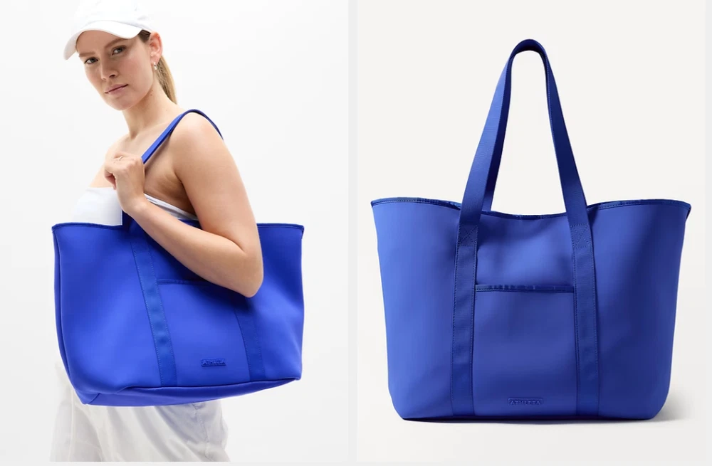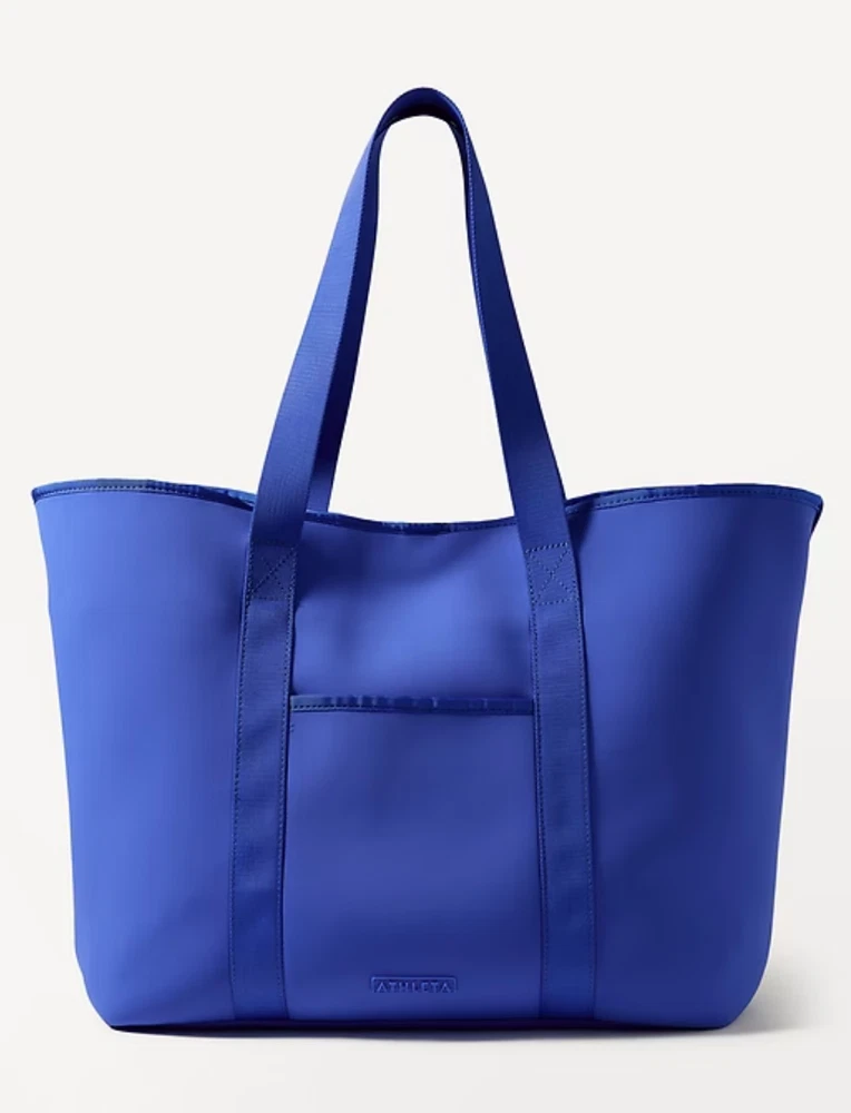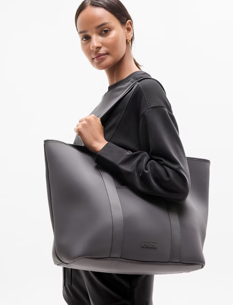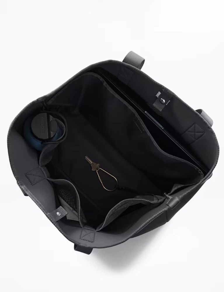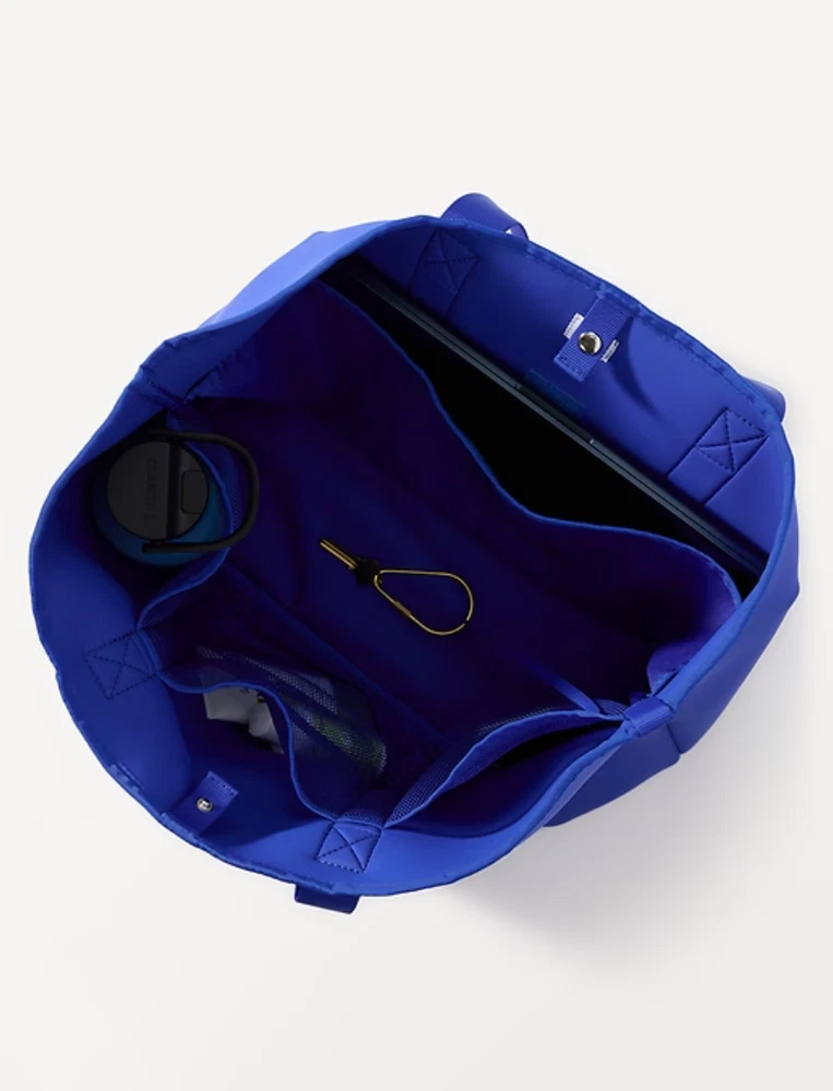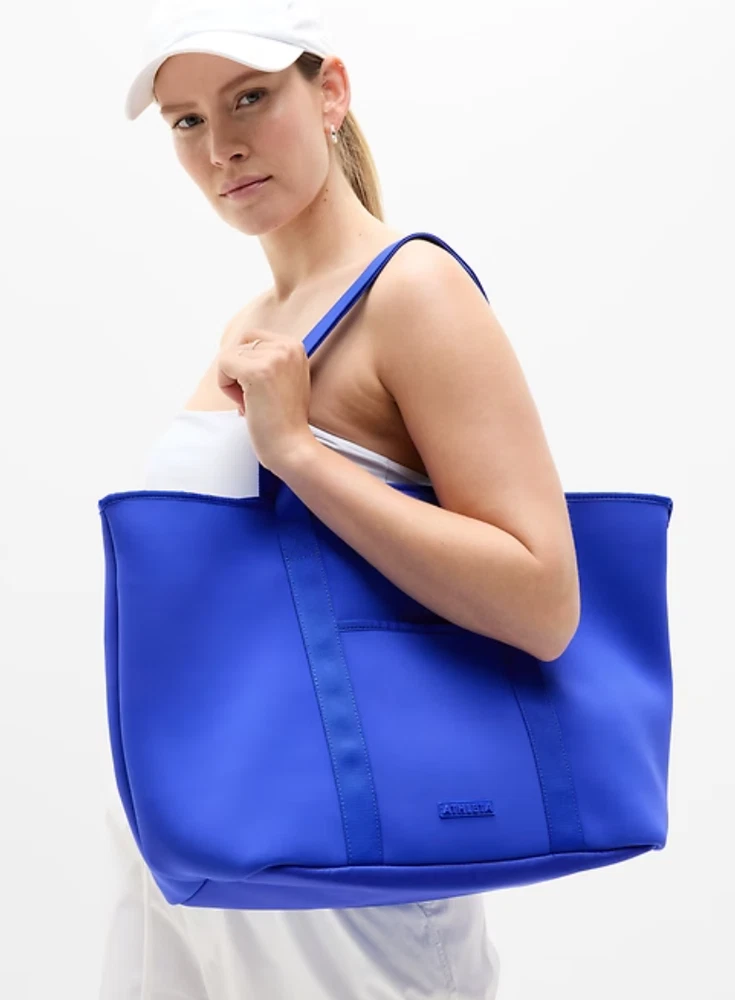 FOR: Doing your phone-wallet-keys check in one quick, easy step FEEL: Peak-sleek neoprene bounces wear, tear, and water away effortlessly FAVE: Interior mesh pocket plus a pouch clasp help keep your stuff organized Comfort-first, wide strap is sturdily stitched in place to support heavier loads #599174 Fit + Sizing Dimensions: 15" x 14" fabric + care Face: 82% Nylon/18% Spandex Interlayer: 100% Neoprene Wipe clean. Imported.