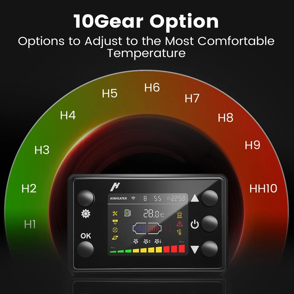 Similar Items Description Features: 【RAPID HEATING】Aluminum diesel heater allow you to feel the heat in less than 1 second. Our heaters put out 5500-18000 BTU's of heat, heating 20-27 square meters in 10 minutes and getting warm fast. 【ENERGY SAVING】The fuel consumption of diesel heater is 0.15 L/h - 0.44 L/h, compared with the heater with fuel consumption of 0.28 L/h - 0.65 L/h, the range has been greatly improved.5L large-capacity tank can be heated continuously for 10 hours, and the driving time is 12-33 hours, ensuring continuous heating. 【WIDE APPLICATION AREA】Our diesel heater 12V is configured with highland mode, 5500M above sea level, which can be automatically adjusted to different altitudes and warms up quickly. 12v & 24V portable diesel air heater is suitable for any use in RVs, carpentry houses, camping, vans and so on. 【Comprehensive Coverage of Different Voltages】 Equipped with 2 wiring options: 110V US PLUG Adapter and DC12V/24V plug external wiring, plug-and-play design, allowing you to flexibly switch wiring according to location/vehicle, suitable for use in US standard sockets, DV12/24V vehicle batteries, outdoor storage batteries 【3 CONTROL METHODS】Our heater has three control methods: bluetooth control, remote control and LCD panel control; smart app also provides timer function, thermostat control, temperature adjustment, voice announcement, etc., which provides you with continuous heating and saves time. 【Bluetooth connection】Download the "QR code" App(From the instruction manual), available for iOS and Android devices, which enables user to remotely control the heater via Bluetooth 【SAFETY PROTECTIONS】The heater's main board provides short circuit protection, reverse connection protection, overvoltage protection, overheat protection (≥270 °C/518 °F) and more. It allows you to use it safely in a variety of environments, such as cars, RVs, boats and indoors. Specifications: Name Diesel air heater all in one Material metal + plastic Color White Voltage 12V/24V& 110V Power 5KW-8KW Fuel Diesel Complete burn rate 100% Consumption 0.15 - 0.44 L/h Remote controlled effective distance 50m-100m Working temperature -40 °c ~ 50 °c Package Included: 1 x Air Heater Host with LCD Display 1 x LCD Remote control 1 x Air Outlet pipe 1 x Exhaust pipe 1 x Filter 1x Silencer 1x L-type exhaust pipe bracket 4 x Connection holder 1 set Fixture Accessories set 1 x AC power adapter(US Plug) 1 x DC battery power cable 1 X switch extension cord 1 x User manual Note: 1. Please allow 0.5-1cm differences due to manual measurement. 2. Due to the light and screen difference, the item's color may be slightly different from the pictures. #divSKUDetail2 Detail Image #divImageDetail Payment 1.We accept Payoneer、PayPal、Mastercard、VISA、Google Pay 、American Express etc. 2.All major credit cards are accepted through secure payment processor. 3.Payment must be received within 7 business days of auction closing. 4.We ship to your eBay or payment address. Please make sure your eBay and payment address is correct before you pay. Shipping 1.We ship to your eBay or Paypal address. Please make sure your eBay and Paypal address is correct before you pay. 2.Items will be shipped within 1-3 business day when we received payment. 3.Delivery time depends on destination and other factors;