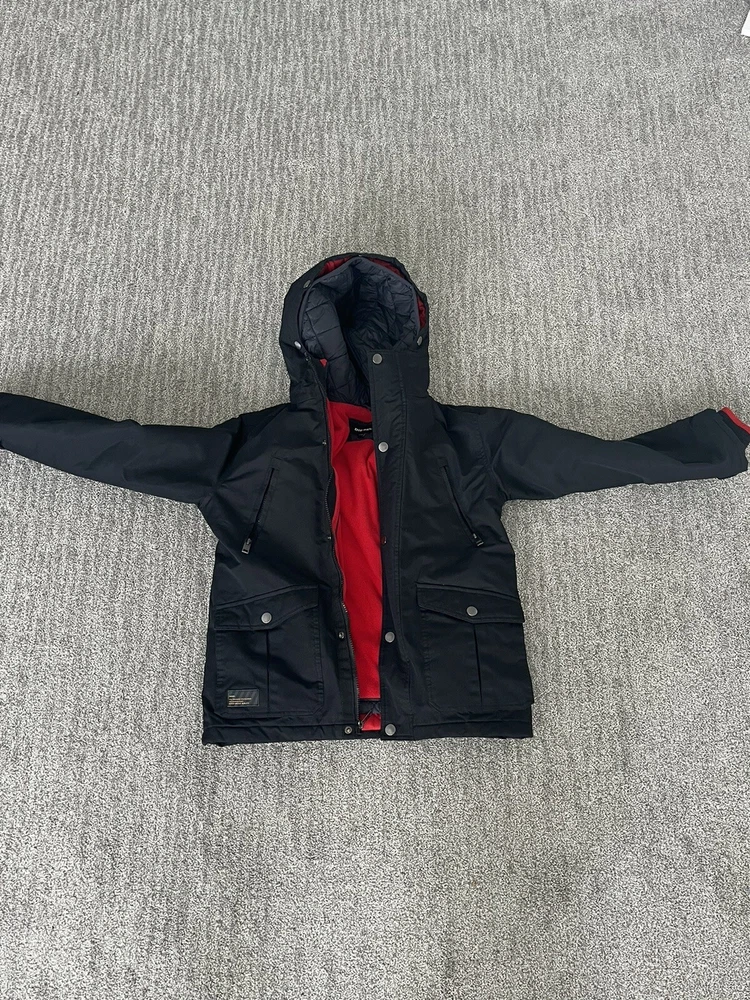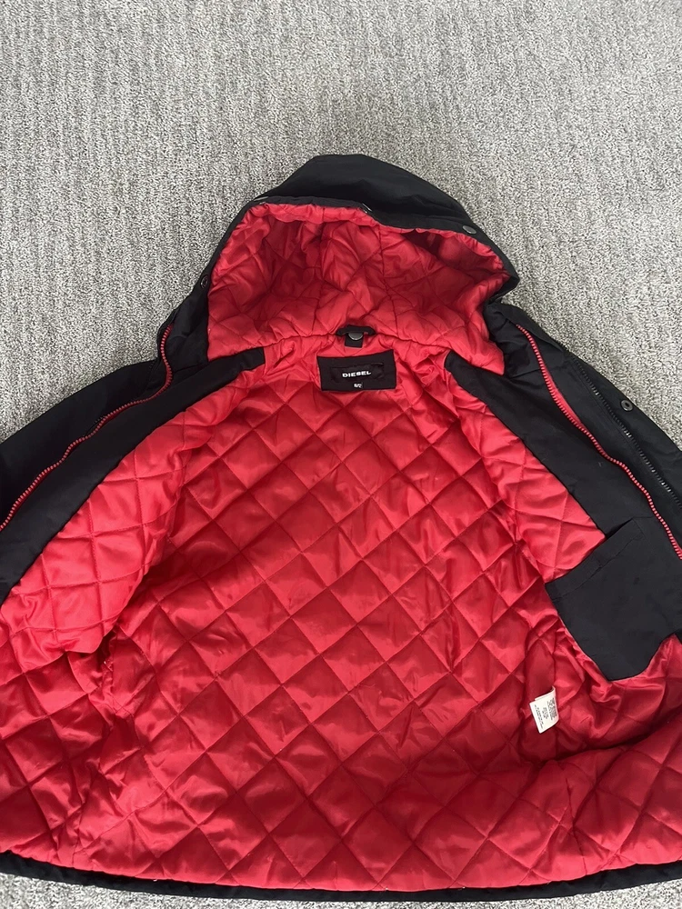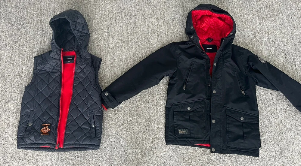 Stay warm during the winter season with this stylish 2 in 1 jacket from Diesel. The black jacket features a button-down collar and a full zip closure. Made of 100% cotton, the jacket is perfect for formal occasions and is designed for boys aged 10-12 years. The mid-length jacket has long sleeves and is fully lined with 100% polyester for added comfort and warmth. The solid pattern and accents add a touch of style to the jacket, making it perfect for any occasion. The jacket is easy to care for and should be dry cleaned only. It is a 2 in 1 perfect for any occasion. The vest even comes off and can be worn on its own.