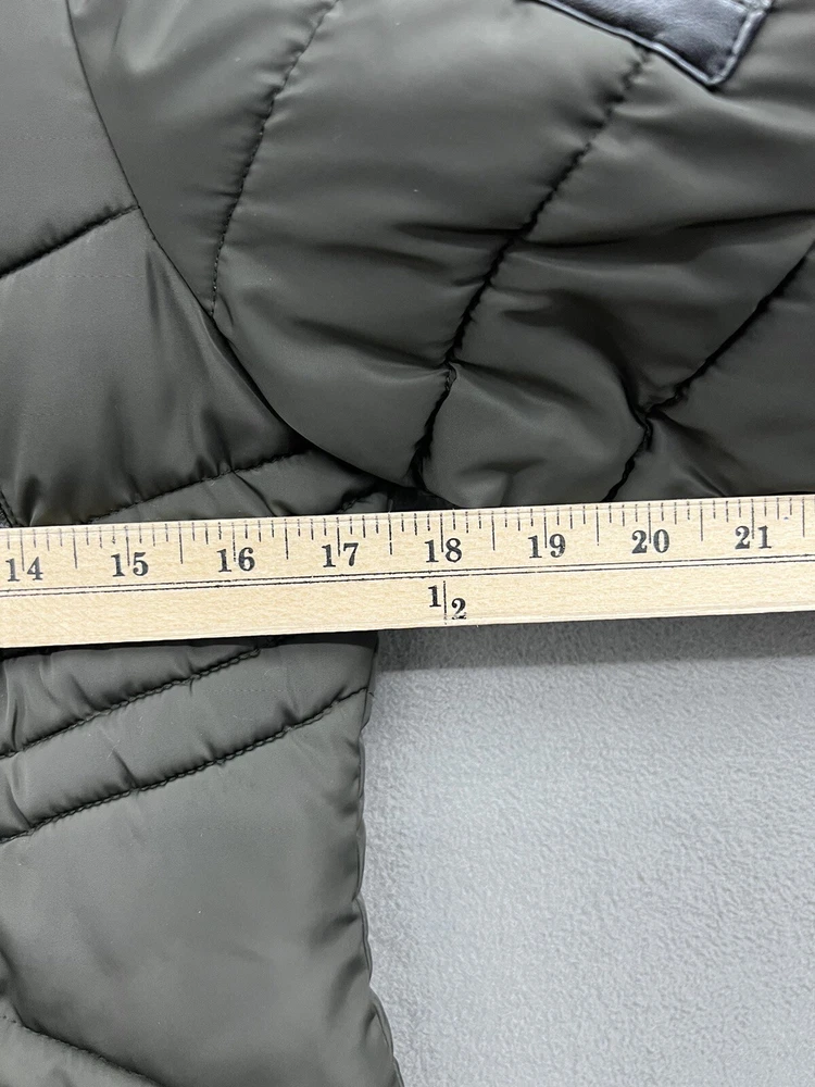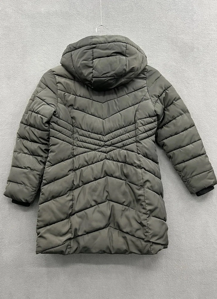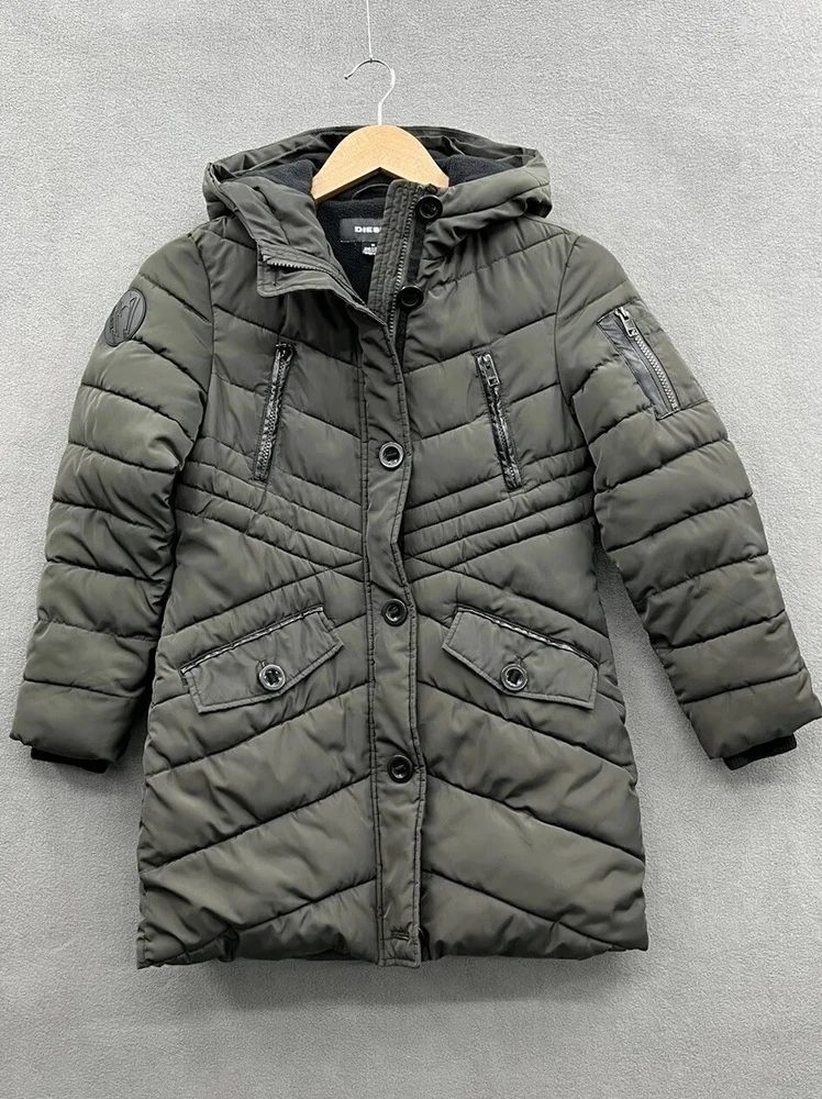 This DIESEL girls' puffer jacket in size 10 is perfect for winter and fall. The long sleeve, solid green coat is made with a nylon outer shell material and a polyester lining material to keep your little girl warm and comfortable. It features a hood, zip closure, and pockets for added convenience. The quilted accents and army theme add a stylish touch to this casual jacket, which is ideal for everyday wear. The slim fit and jacket/coat length make it a great addition to any girl's wardrobe. Get your hands on this Olive brand puffer jacket and keep your little girl cozy this winter!