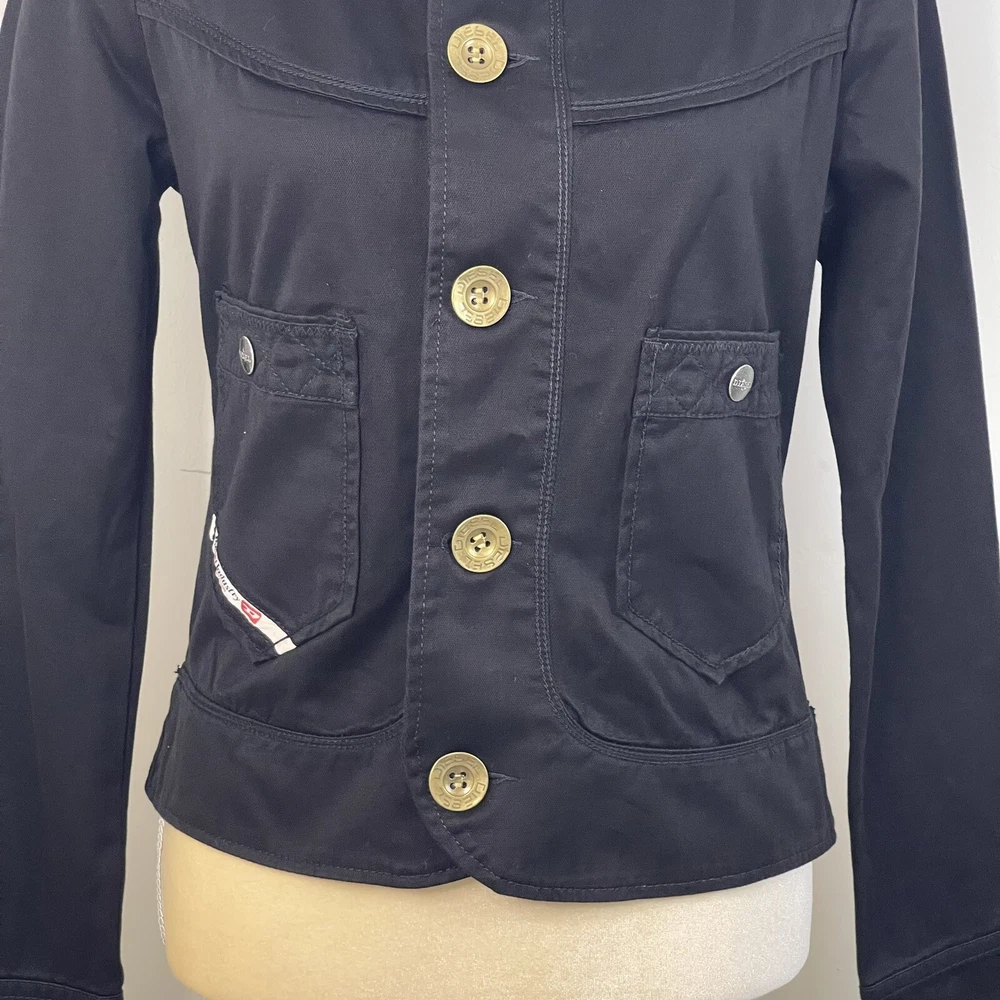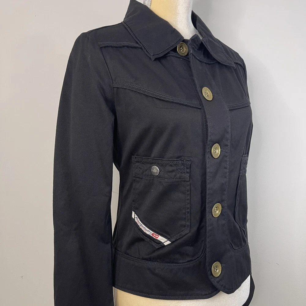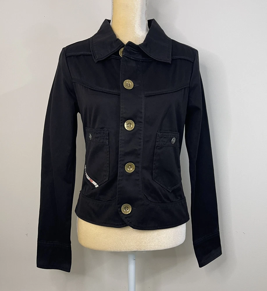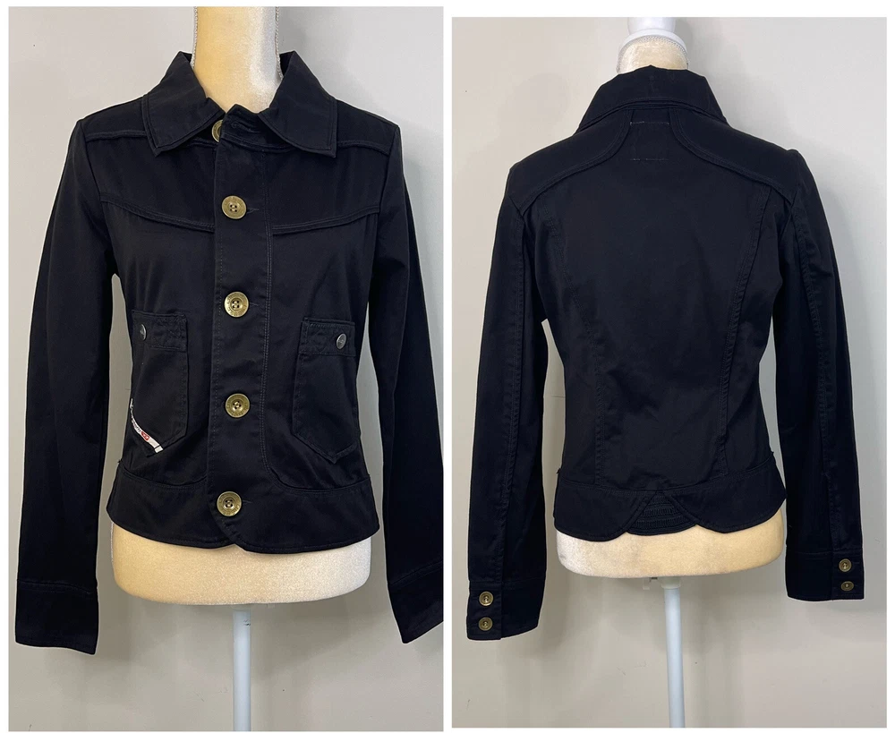 Outer Shell Material: Cotton Brand: Diesel Features: Pockets, Collared, Unlined Seller Notes: “(Please see pictures)” Size Type: Regular Style: Motorcycle Jacket Type: Jacket Color: Black Fabric Type: Denim Size: S Jacket/Coat Length: Short Department: Women Closure: Button Pattern: Solid Accents: Button, Logo