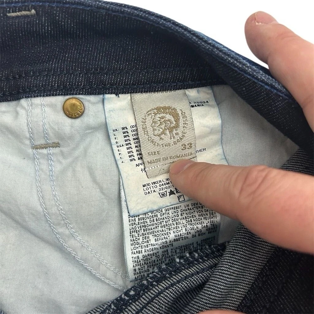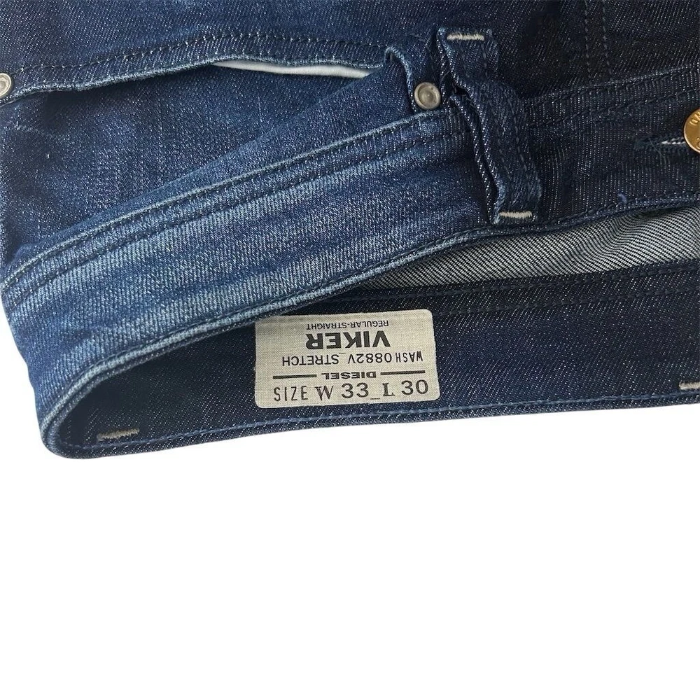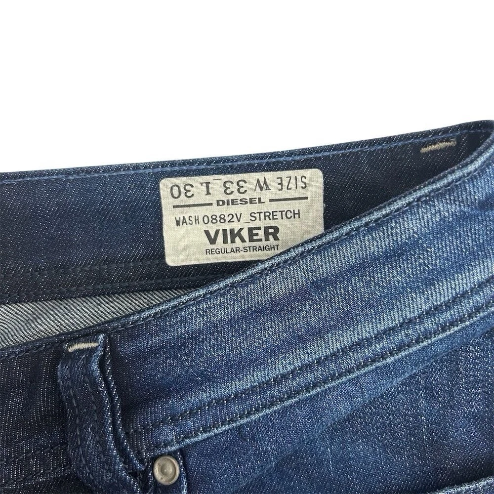 These are Diesel Men's Jeans in size 33 x 30, made of blue denim with a medium wash. They feature a classic fit, straight style, and a 5-pocket design. The jeans have a distressed look with stretch material for comfort. They have a mid-rise and button closure, suitable for all seasons. The brand is Diesel, and the model is Viker, offering a Y2K theme.