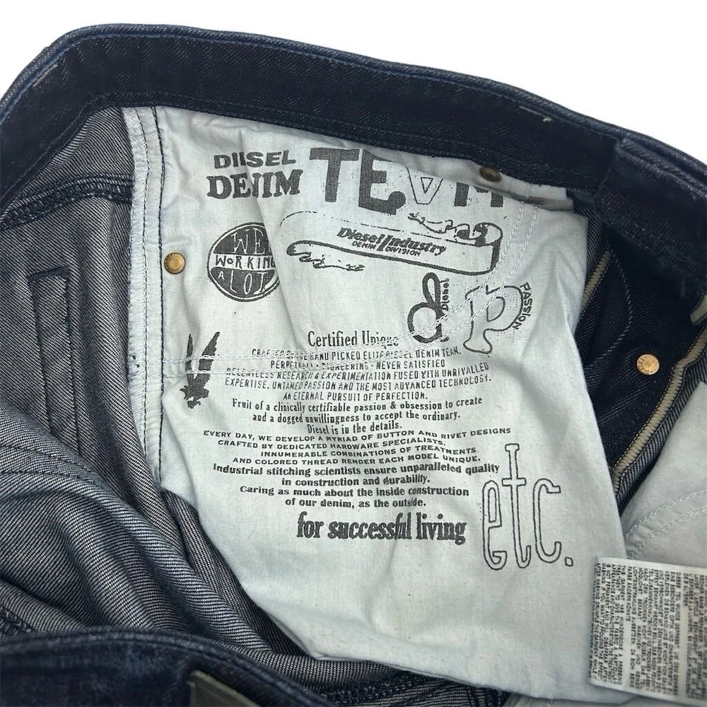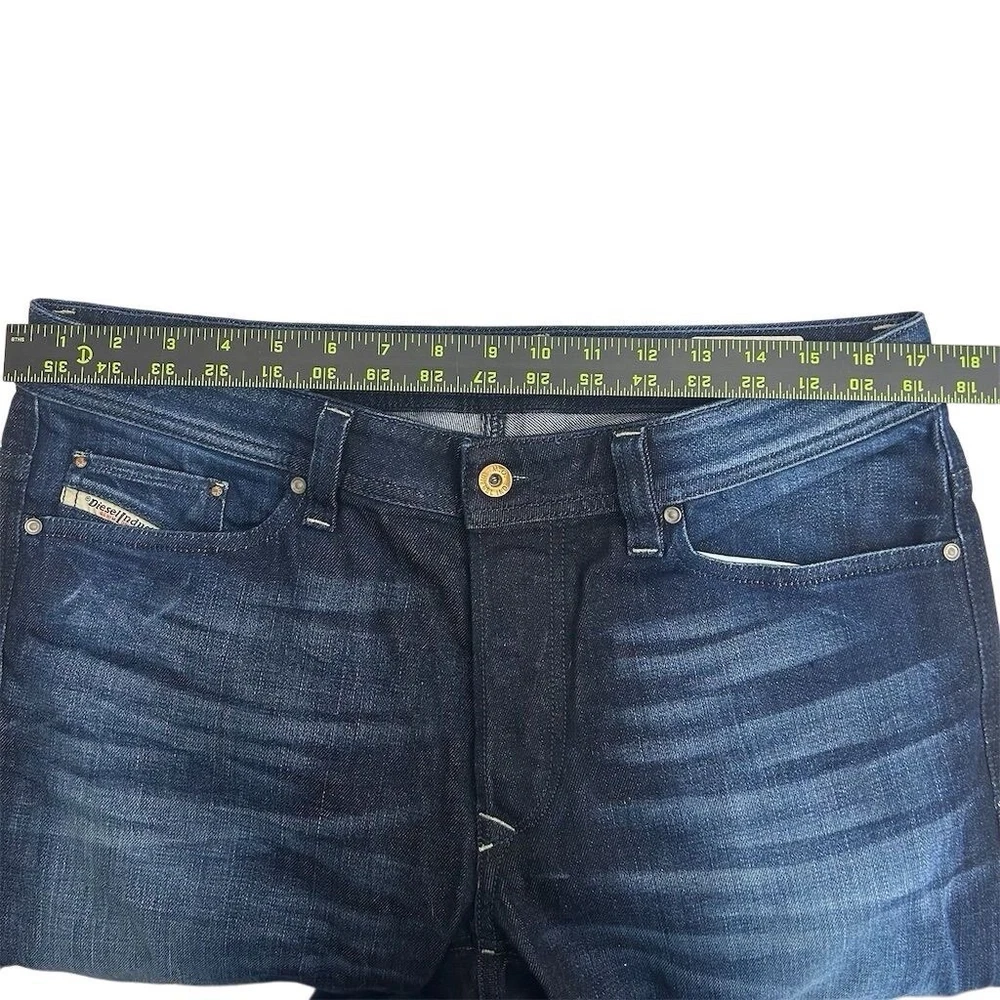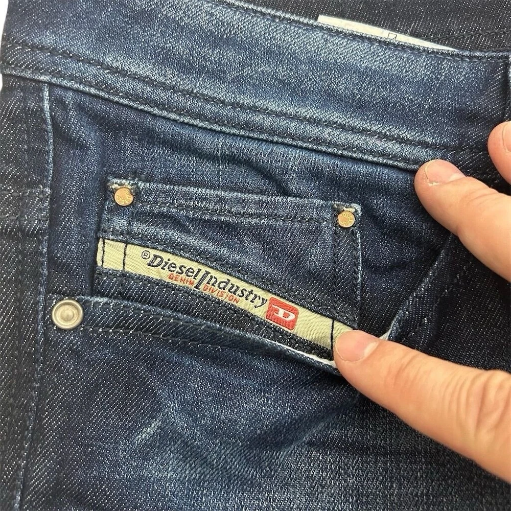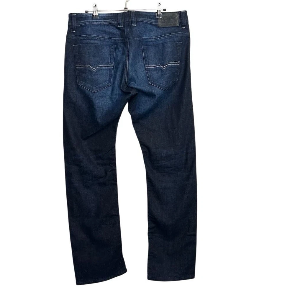 These are Diesel Men's Jeans in size 33 x 30, made of blue denim with a medium wash. They feature a classic fit, straight style, and a 5-pocket design. The jeans have a distressed look with stretch material for comfort. They have a mid-rise and button closure, suitable for all seasons. The brand is Diesel, and the model is Viker, offering a Y2K theme.