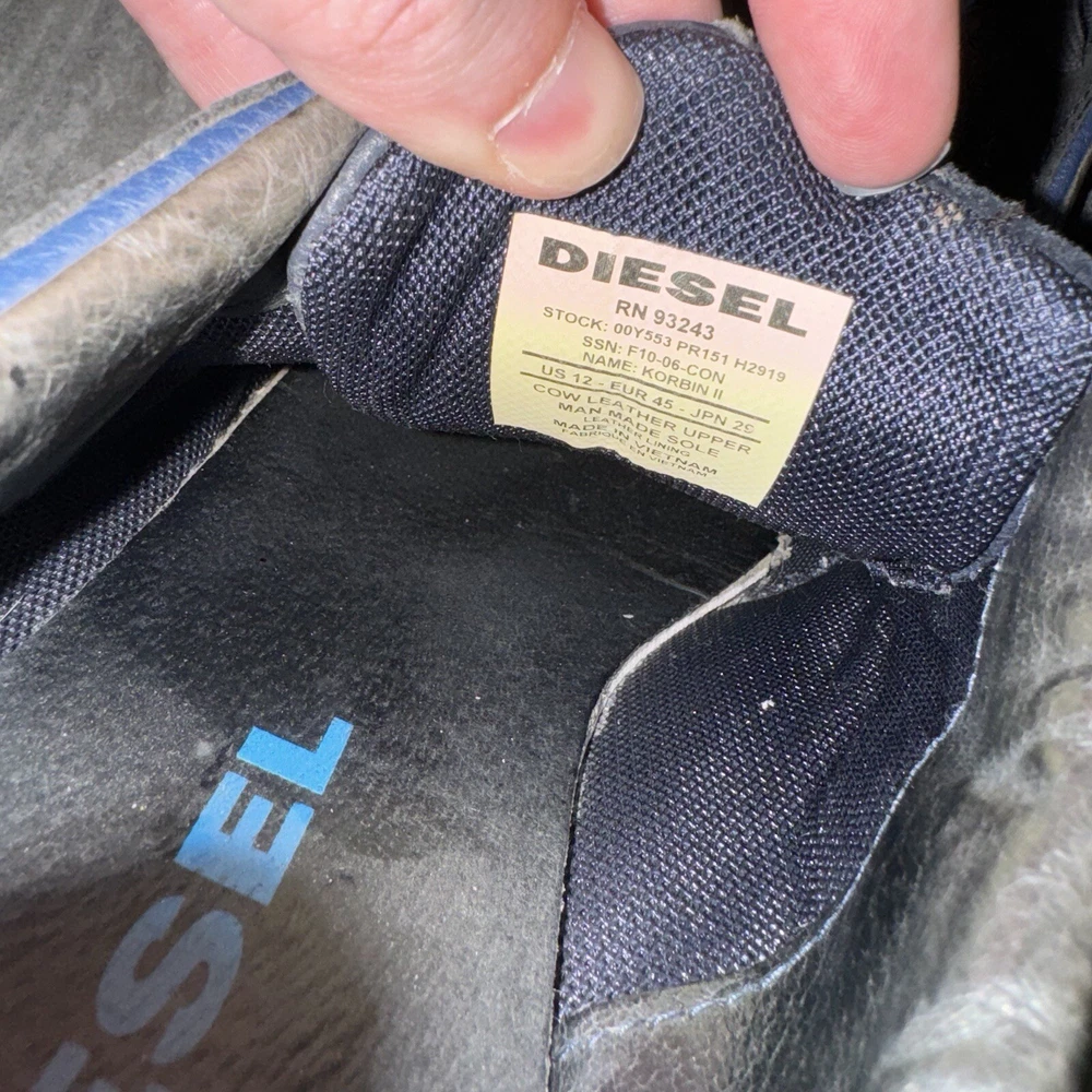 Closure: Lace Up Season: Fall, Spring, Summer, Winter Department: Men Outsole Material: Rubber Brand: Diesel Vintage: No Accents: Logo Features: Breathable, Comfort, Lightweight Style: Sneaker Upper Material: Leather Customized: No Shoe Width: Standard Toe Shape: Round Toe Pattern: Solid Insole Material: Foam Country/Region of Manufacture: Vietnam Model: Diesel Korbin II Theme: Cow Lining Material: Leather Product Line: Diesel Korbin US Shoe Size: 12 Occasion: Casual, Travel Color: Multicolor Type: Casual EU Shoe Size: 45