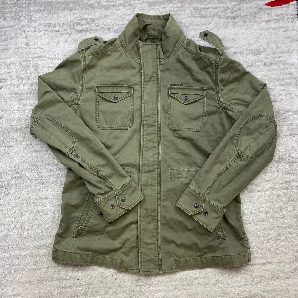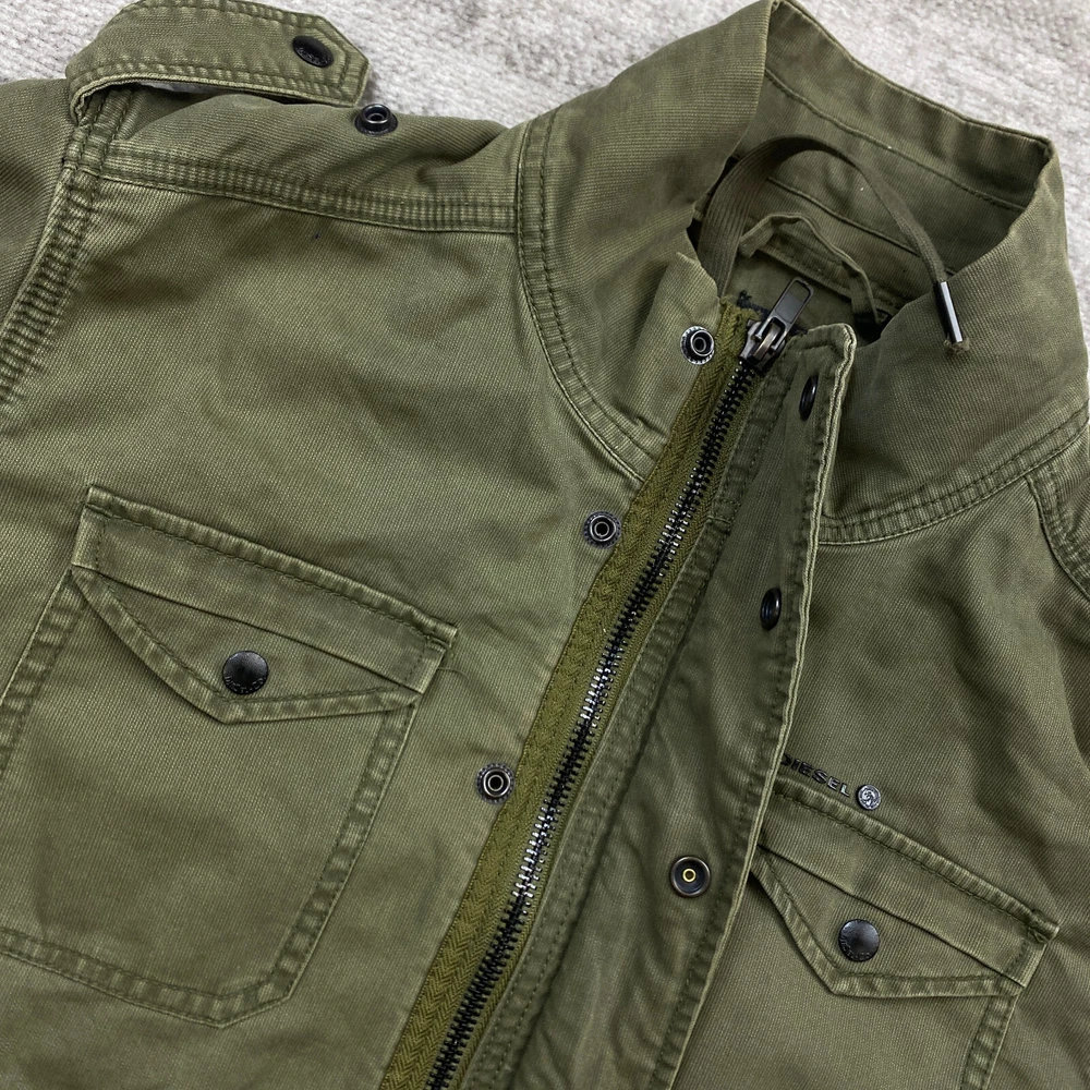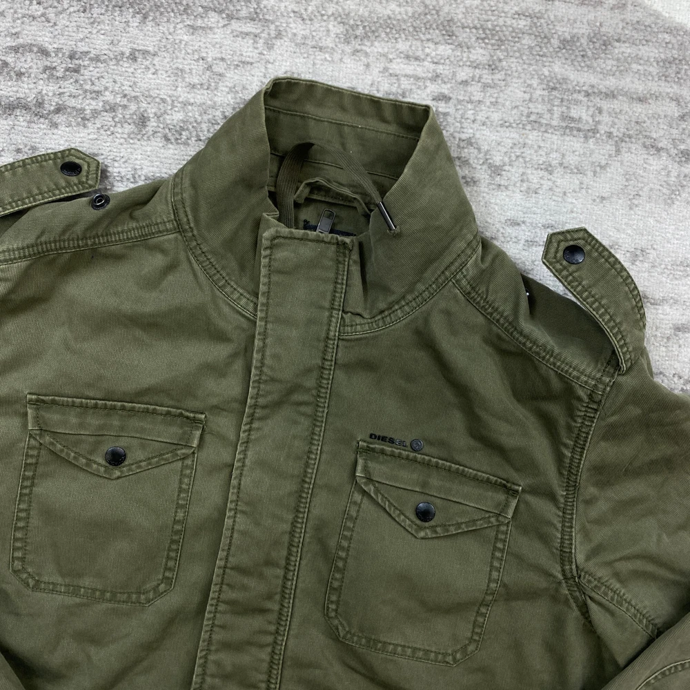 Style: Military Jacket Size Type: Regular Lining Material: Cotton Type: Jacket Outer Shell Material: Cotton Season: Fall, Spring, Summer, Winter Country/Region of Manufacture: Albania Size: XL Features: All Seasons, Breathable, Full Zip, Hooded Closure: Button Accents: Logo Fabric Type: Knit Occasion: Business, Casual, Formal, Party/Cocktail, Travel, Workwear Color: Green Theme: Preppy Department: Women Brand: Diesel Sleeve Length: Long Sleeve Pattern: Solid Vintage: Yes Fit: Regular