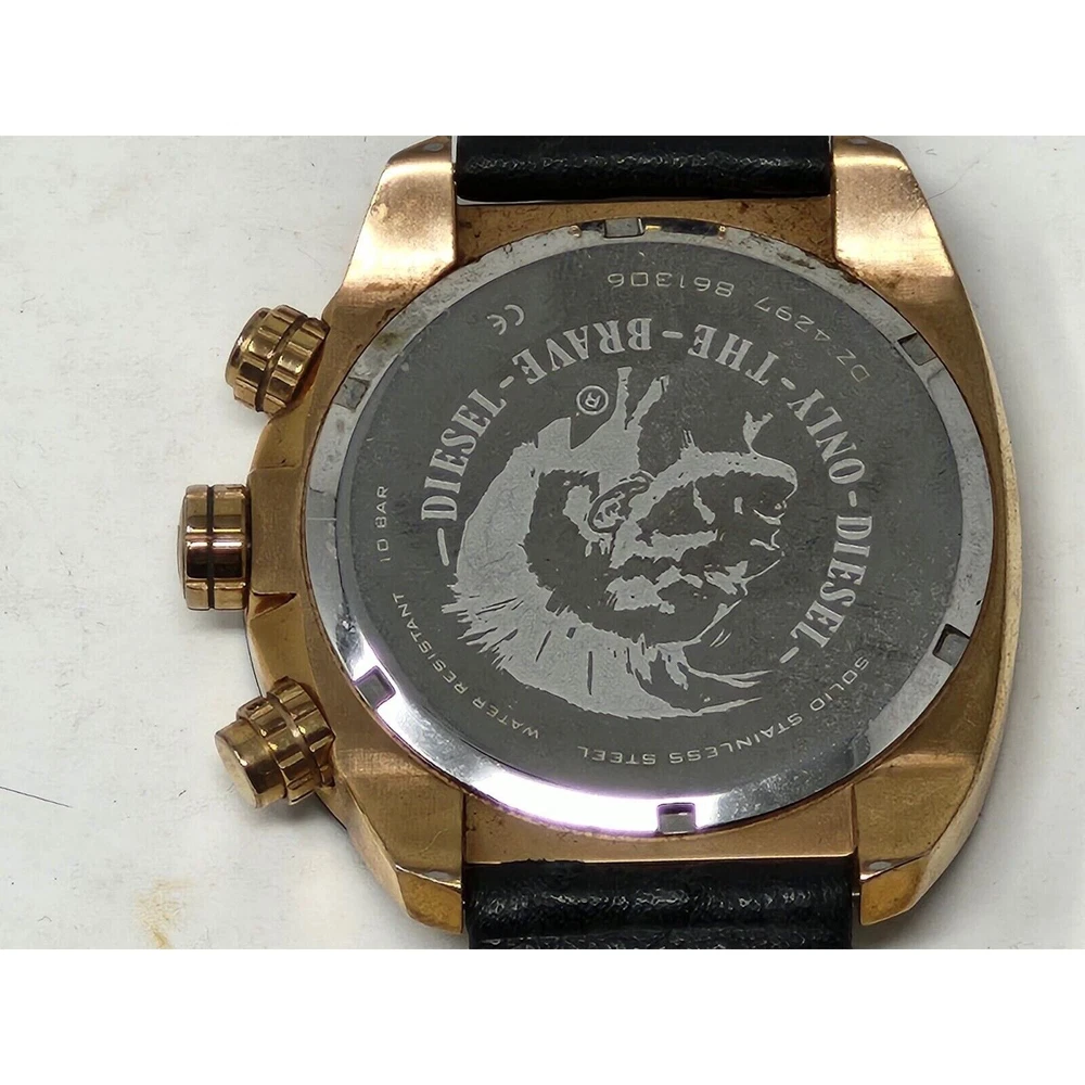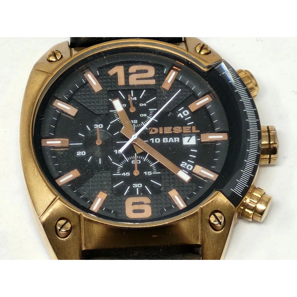 Brand: Diesel Bezel Color: Gold, Black Color: Black Band Color: Pink Dial Color: Black Model: Diesel Overflow Type: Wristwatch Department: Men Case Color: Pink