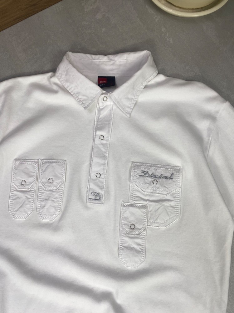 Original Diesel white polo shirt with a rare utilitarian/military-inspired design from the Y2K era. Features: High-quality cotton material Embroidered Diesel logo on chest pocket Four unique flap-style buttoned pockets on front Polo collar with button-up placket Classic short sleeve cut Slim fit silhouette