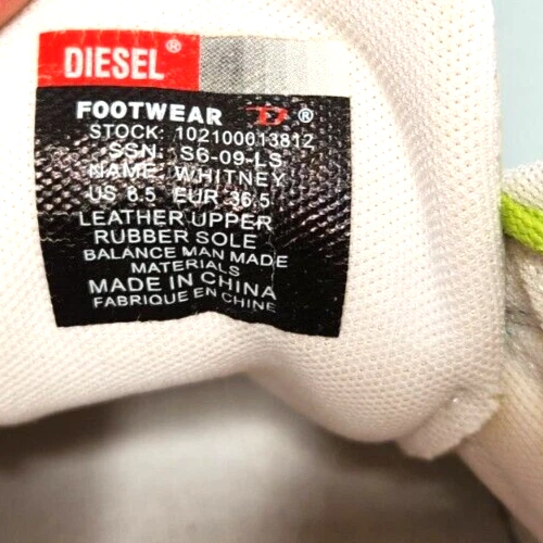 Brand: Diesel Color: Multicolor Department: Women US Shoe Size: 6.5 gtin13: n/a UPC: n/a Type: Athletic Style: Sneaker UK Shoe Size: n/a Style Code: low top sneakers Seller Notes: “very good preowned condition” Customized: No