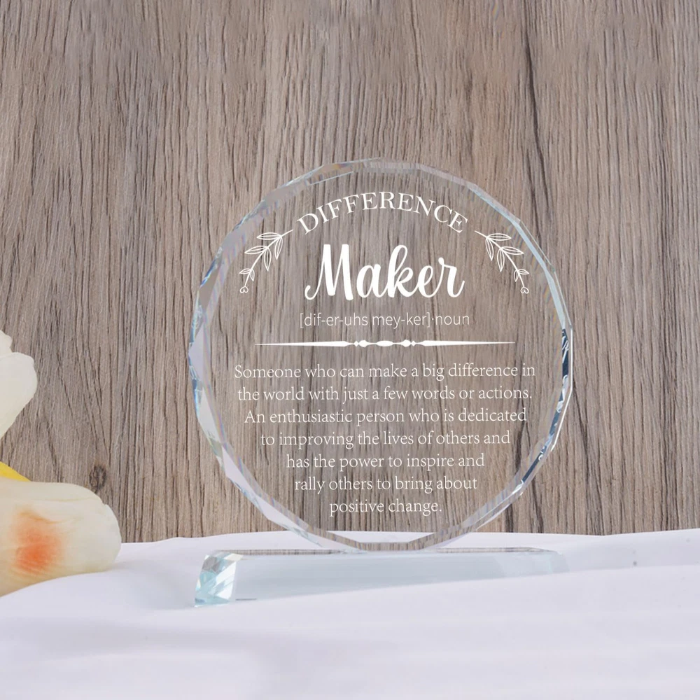 🎁 Appreciation gifts: Funny difference maker acrylic desk decorative is designed with nonagon shape in clear color, well printed with beautiful flowers and meaningful sentences. Simple and creative products bring people visual enjoyments, the sign makes an impressive and heartwarming gift a perfect thank you gift. 🎁 Thank you gifts: It's a heartfelt thank you gifts, Christmas gifts, retirement gifts, appreciation gifts, Promotion gifts for supervisor, funny boss gifts for men, celebration gifts for mentor, leaving job gift for boss, farewell gifts for coworker, appreciation gifts for teacher, director, professor, physical therapist gift ideas, work gifts, office gifts, colleague gifts, empath gifts, leaving gifts, friendship gifts, inspirational gifts for women sisters coworkers colleagues friends employees men. 🎁 Engraving the words inside the crystal - The inspirational crystal is made of high-grade crystal, the surface is very smooth and has a sense of luxury. The text is carved inside the crystal and the clear printing remains for years to come, and your regard will last forever. 🎁 Desk/office decorations - Whoever receives this decorative plaque will be delighted to display it on a table or other flat surface with its modern and creative design! A wonderful gift that can be placed in his/her office or classroom, making him/her feel proud and happy from the bottom of his/her heart. πŸ’• Attentive service - We guarantee high-quality products and satisfactory service. The crystal plaque will be packaged in a durable box, and we will ensure safe arrival. If you have any questions, please feel free to contact us! Product Description UNIQUILLING Difference Maker Gifts Engraved Crystal Difference Maker Gifts Thank You Gifts for Leader Boss Best Mom Mentor Coach Boss Manager Coworker Teacher Appreciation Gifts Specification: Material Crystal Color as the picture shown Dimensions 5.7'' x 5.3'' x 1'' Gift box packaging Difference Maker Crystal Plaque Material and Process The inspirational crystal is made of high-grade crystal, the surface is very smooth and has a sense of luxury. The text is carved inside the crystal and the clear printing remains for years to come, and your regard will last forever. Meaningful desk decorations Whoever receives this decorative plaque will be delighted to display it on a table or other flat surface with its modern and creative design! A wonderful gift that can be placed in his/her office or classroom, making him/her feel proud and happy from the bottom of his/her heart. Gift box packaging What better gift to show your respect and appreciation for them? This unique engraved crystal decoration is your best choice. Best gift for difference maker. It's also an ideal gift idea for their birthday, retirement, going out, Thanksgiving, and Christmas.