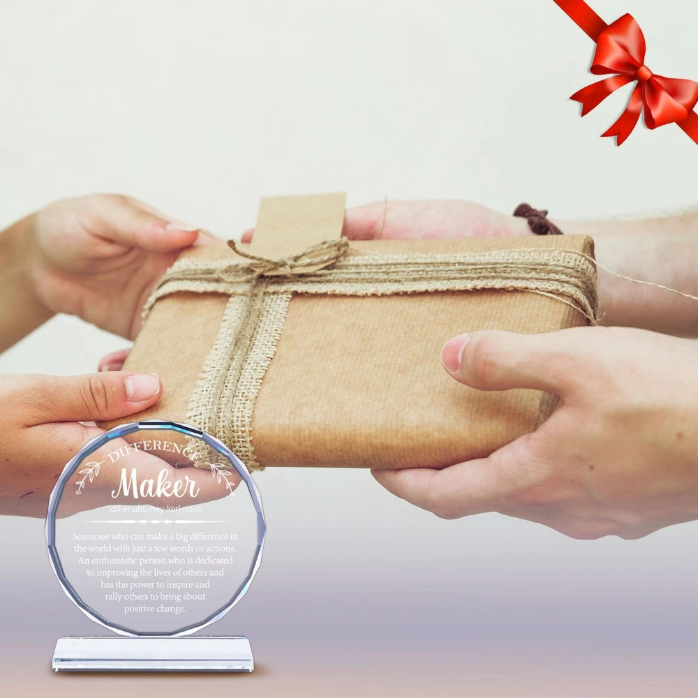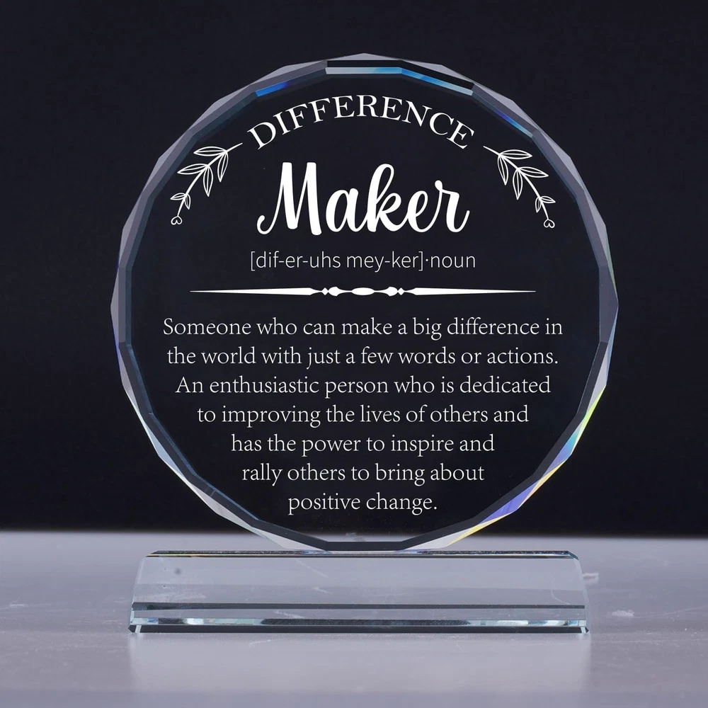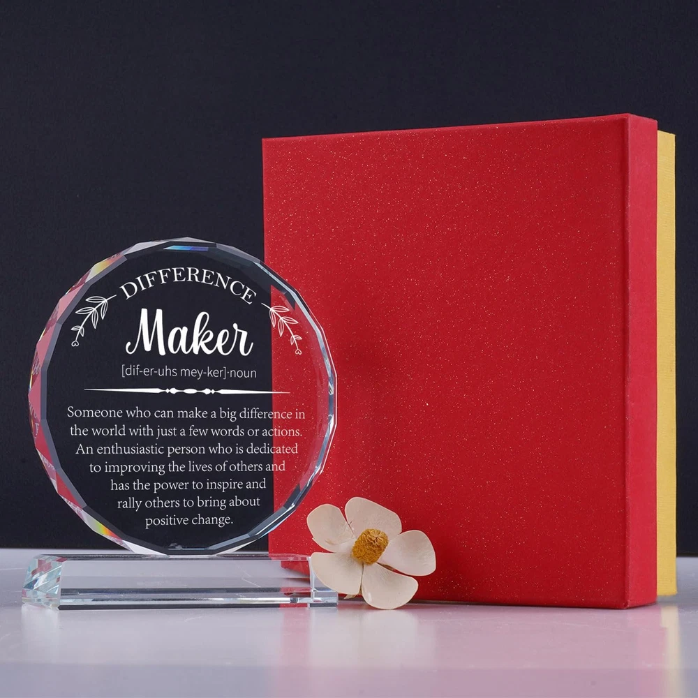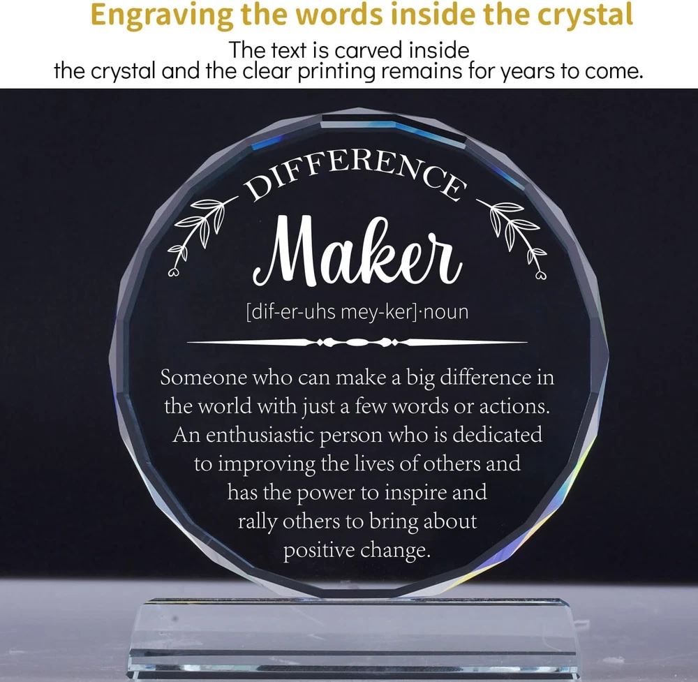 Theme: Words & Quotes gtin13: 313018045018 Shape: Polygon Color: Does not apply Recommended Uses For Product: Appreciation gifts, thank you gifts, office decorations Style Name: Difference Maker Gifts Material Type: Crystal Brand: Does not apply Mounting Type: Tabletop Material: Crystal Item Thickness: 1 Inches Style: Difference Maker Gifts Type: Does not apply UPC: 313018045018 Item Dimensions L x W: 5.7"L x 5.3"W