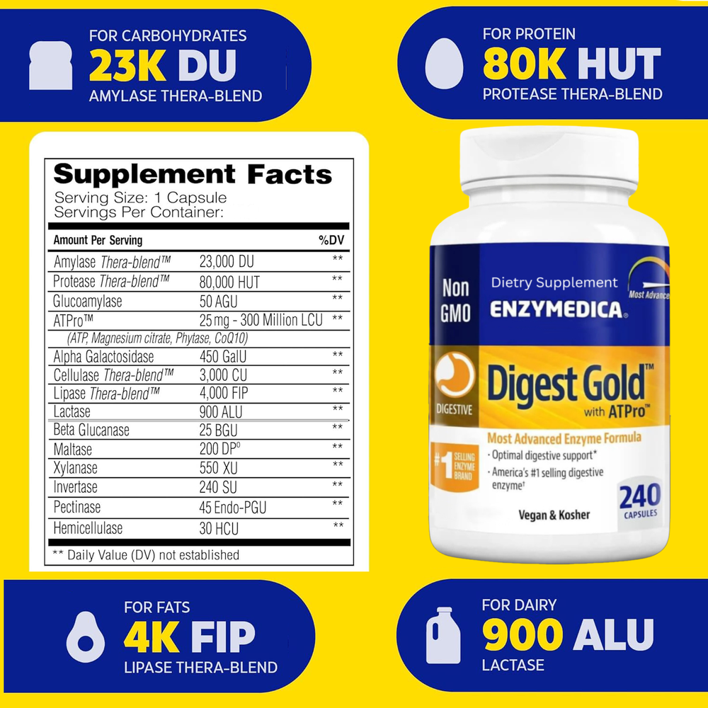 Enzyme-dica Digest Gold + ATPro, Maximum Strength, Fast-Acting, Helps Digest Large Meals, Prevents Bloating and Gas, 240 Count About this item For Food Lovers: Enjoy your favorite meals without discomfort. This supplement contains strong digestive enzymes that help break down large meals, reducing bloating and occasional indigestion. ATPro Blend: Feel energized after meals. The unique ATPro formula includes ATP, Magnesium Citrate, Phytase, and CoQ10, which support your body's energy production and help digest food more effectively. Effective All the Way Through: The special Thera-blend enzymes are designed to work throughout your digestive system, ensuring fast relief and maximum digestive support.