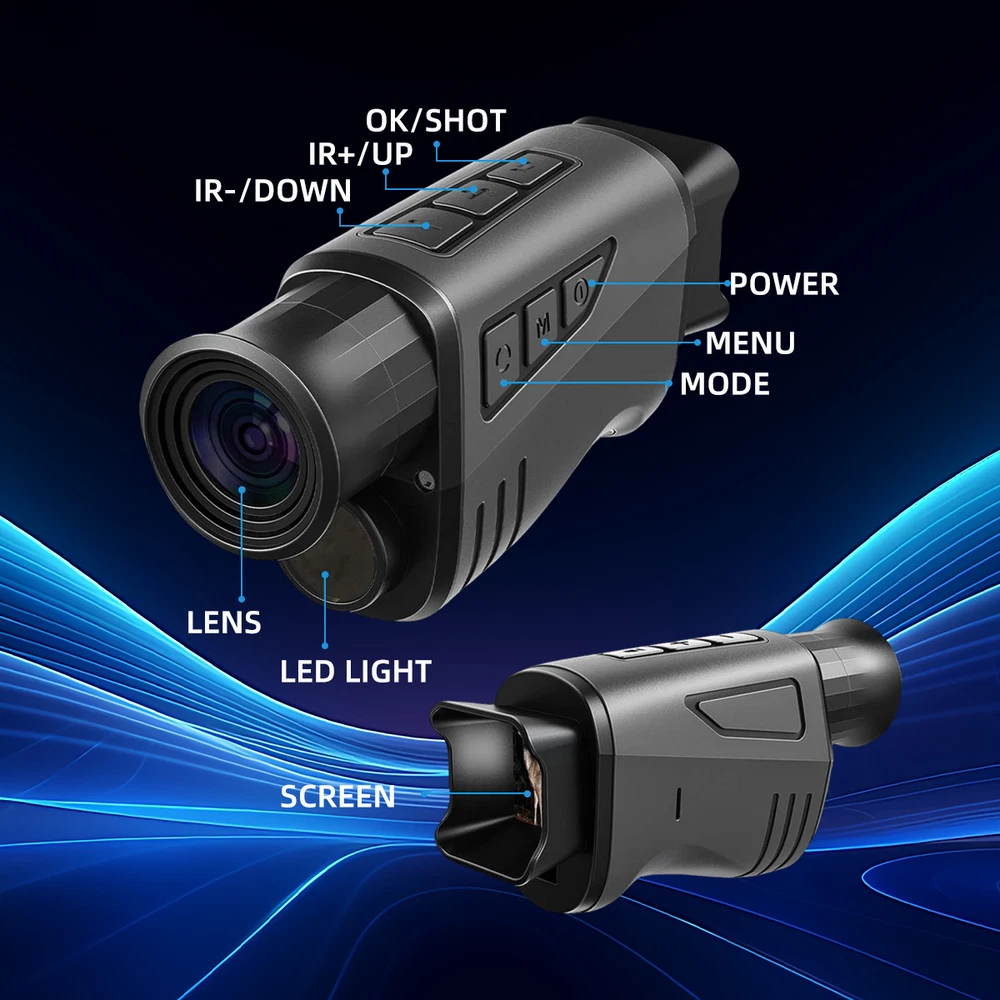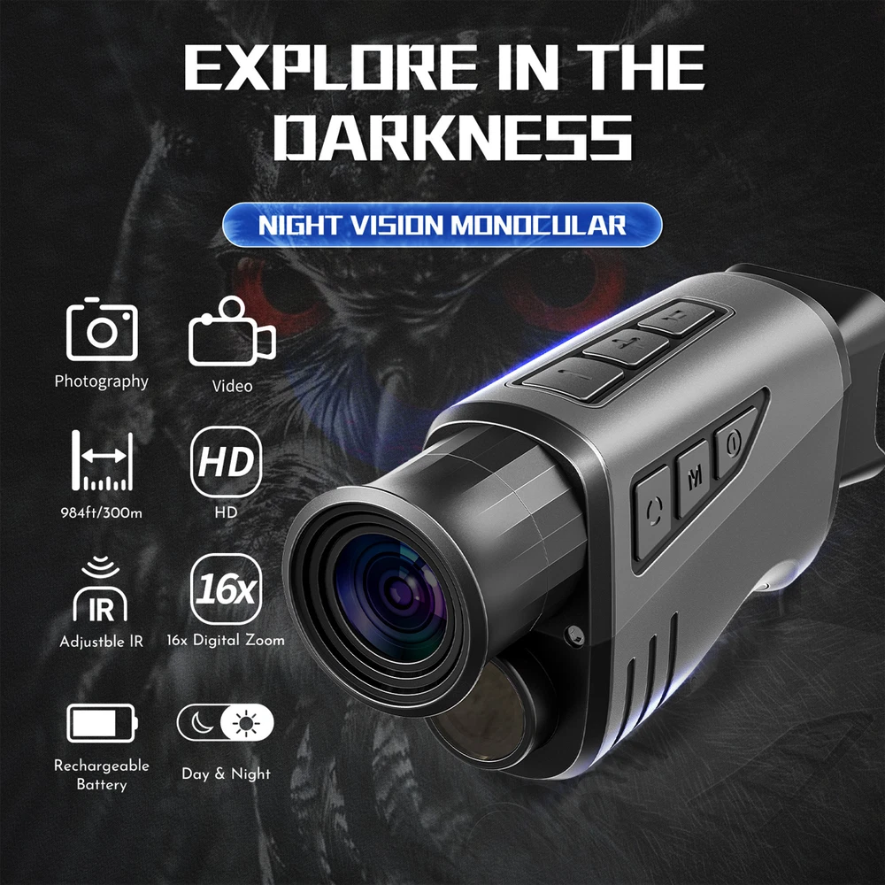 Features: 1.1080P & 12MP HD Clarity for Outdoor Exploration: Enhance your adventures with the night vision monocular, perfect for activities like wildlife observation, camping, or nighttime exploration. Capture every moment in HD video and photos, ensuring sharp, high-quality visuals even in the dark. Whether you're tracking animals in the wild or navigating a campsite, this monocular delivers the detail you need. 2.Clearly See in Darkness: The night vision goggles can take photos, record a video and playback, you can capture high definition photos & videos with its outstanding optical clarity in the daytime, low light, or night time. 3.16X Digital Zoom: The monocular night vision features a fully multi-coated 25mm objective lens technology, enhance 16X digital zoom to help focus distant objects quickly; Designed for hunters and wildlife enthusiasts, this monocular offers unmatched versatility. 4.1.54" Viewing Screen with Video Recording: The digital night vision infraed monocular supports real-time photographing, video recording (without sound records) and playback function. Video / pictures can be transmitted to the computer through the data cable or TF card to view and share! 5.Rechargeable Lithium Battery: Built-in a Li-ion rechargeable cell of 3000mAh. The Infrared high-tech night vision binoculars feature an 850 NM infrared illuminator which allows you to view animals in pitch dark for hours. 6.Highly Portable & Multifunctional: Compared with the bulky night vision googles or binoculars, this night vision monocular is highly portable, helps you focus on your target quickly and accurately with one hand; It supports installation on the tripod, compatible with Bushnell, firefield, sionyx and sightmark tripods. Specification: Image Size: 12MP/10MP/8MP/5MP/3MP Video Size: 1080P(1920X1080)/720P(1280X720) Aperture: 1/2.9 f=25mm Lens Angle: FOV=10°, diameter 25mm Display Screen: 1.54 inch IPS LCD Digital Zoom: 16X Storage Media: TF card, up to 32/64 GB Viewing Distance in full dark: 0.5M-300M Viewing Distance in weak light: 3M to Infinity IR LED: 3W/850nm USB Port: Type-C USB Power Source: 3000mah Built-In Lithium battery Operating Temperature: -10℃ to +60℃ Storage Temperature: -20℃ to +60℃ Mic/Speak: included Tripod compatible: Yes Dimension: approx.150*70*50mm Weight: approx.165g Package included:(Decide on your choice, thank you) 1X Night Vision Goggles 1X USB Cable 1X Cloth Bag 1X User Manual OR +/or 1x32GB TF card