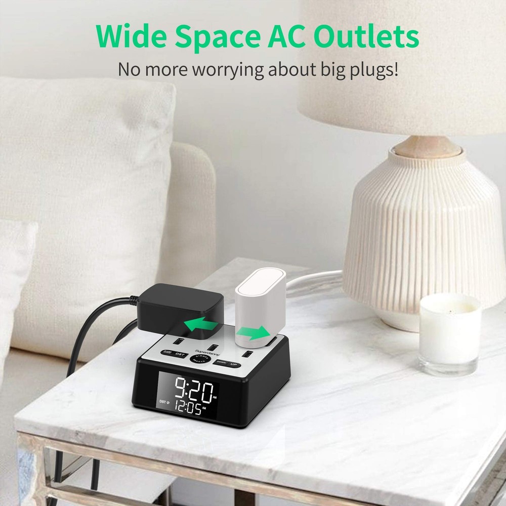 Digital Alarm Clock with 3 USB Charger, SUPERDANNY Desk Charging Station 2 AC. 【3 Function in 1】Combining Alarm, Digital Clock, 2 AC Outlets, and 3 USB Ports in one, save your desktop or nightstand from looking messy with multiple devices. 【Adjustable Brightness】4 level of brightness available, adjust as you like. Find your comfort brightness and make it visible but disturbing your sleep. 【7-Fold Safety Protection】Fire-resistant material ABS+PC (1382℉, rating: UL94 V-0), surge protection (1700J), overload/short-circuit, USB over-voltage, over-current, over-heat protection, make it safe and functional. 【Multi-Plug Outlet Extender】With 2 widely spaced built-in outlets to accommodate bulky plug or adapter, and 3 smart USB ports to intelligently detect your iPhone, iPad, tablet, earbuds, and other electric devices and deliver them the fastest possible yet safe charging current up to 2.4A per port, 3.2A in total, who needs more outlets on the wall? 【Battery Backup】 With 2*AAA backup batteries (Not included) installed, it memorizes time and alarm settings even during power outages, no need to reset time again and again. (Like most electronics, this alarm clock needs to be reset once every few months for its accuracy.) SUPERDANNY Alarm Clock Charger Power Strip Surge Protector Charging Station with 2 AC Outlets 3 USB Ports 6.5ft Extension Cord for iPhone iPad Samsung Computer Laptop Home Dorm Hotel Bedside Shipping We offer FREE shipping on all orders! We ship within Three business days of payment, usually sooner. We use a selection of shipping services such as UPS, FedEx, USPS etc. We only ship to the lower 48 states, no APO/FPO addresses or PO Boxes allowed. Local pickups and combined shipping options are not provided at this time. Return You can return a product for up to 30 days from the date you purchased it. Any product you return must be in the same condition you received it and in the original packaging. Please keep the receipt. Payment We accept payment by any of the following methods: PayPal Please pay as soon as possible after winning an auction, as that will allow us to post your item to you sooner! Feedback Customer satisfaction is very important to us. If you have any problem with your order, please contact us and we will do our best to make you satisfied. Contact Us If you have any queries, please contact us via ebay. We usually respond within 24 hours on weekdays. Please visit our eBay store to check out other items for sale! Thank you for shopping at our store.