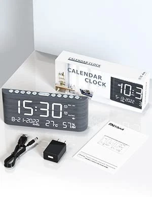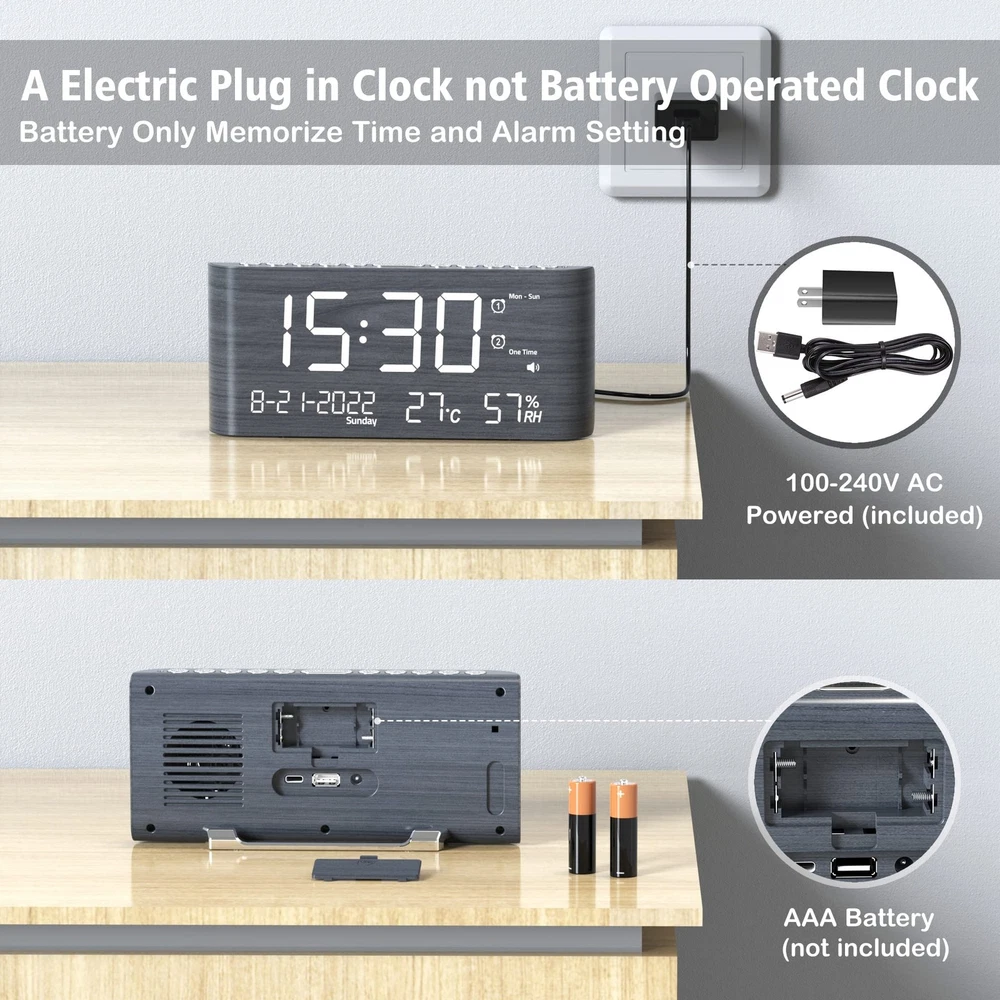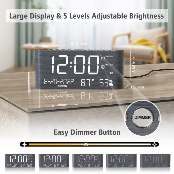 Digital Wooden Alarm Clock with Dual Alarm,Weekday /Weekend Mode,120DB Volume,Humidity & Temperature Detect,2-100% Dimmer,12/24H,Snooze,2 USB Chargers,Battery Backup,Ultra Loud Alarm Clock for Bedroom,Kids, Elderly, Heavy Sleeper Description digital calendar clock is a beautiful and clear large clock that displays the day, week, month, year, time, and indoor temperature & humidity. Knowing your home’s temperature and humidity level is essential to improving indoor air quality and the overall health and comfort of you and your families. To ensure your home’s air quality, proper indoor temperature, and relative humidity (RH) levels to reduce the effects of many unwanted conditions associated with poor indoor air quality. Feature Loud Digital Clock Large LED Screen Dual Alarm Weekday /Weekend Mode Temperature(F/C) & Humidity Monitor Calendar Clock with Accurate Date and Time 5 Levels Adjustable Volume 5 Levels Dimmer 120DB Volume 12 or 24-hour Time Format 2 USB Charging Port 9-min Snooze DST Electric Powered Alarm Clock Battery Backup Easy Operated Stylish Wooden Design for Decor Warranty Guarantee Parameter Adjustable Volume:65-120db 5 Levels Dimmer:2%-100% Snooze:9 Mins Power Source: 100V-240V AC Power Adapter (included) USB Charging Output :5V,1A DST :manually hold press the SET TIME button to activate the DST 2 * AAA Battery(not included) is required to backup Time and Alarm setting in case of power failure Size:8.11 x 1.69 x 3.62 in Weight:220g Material:ABS Package Include 1* Wooden Digital Alarm Clock 1* US AC Power Adapter 1*Charging cable 1* Paper manual 1* Warranty card 【Calendar Clock with Large Display】8.7" large screen clearly displays the time, date and day of week. Press the top button to select the 12/24 hour time frame. 【Digital Clock with Temperature and Humidity】It can assist you in creating a better living environment by monitoring the temperature and humidity in your room, thus protecting you and your family's health. 【Loud Alarm Clock with 9 minutes snooze 】The digital alarm clock for bedroom can be set from 65dB - 120dB as a person's preference. Needless to worry the alarm sound is either too low to wake you up from deep sleep, or too loud thus frightening you. With 9 minutes snooze is designed for kids, adults, and elders. 【Multiple Alarm Setting Mode Digital Alarms Clock】The alarm clock has 4 alarm settings modes available: Every day, Weekend, Weekdays, or One Time Alarm, Dual alarms setting can help you set two wake-up times as your schedule. 【With Type-C and USB Charging Ports】Alarm Clock equipped with USB charging and Type-C charging ports, which can charge 2 electronic devices simultaneously while sleeping. 【Bedroom Clock with 5 Levels Dimmer】 Pressing "DIMMER" you can easily adjust brightness with 5 levels as your need to see the clock in various light conditions. The desk clock is made of high-quality wood grain material, which has great light transmittance. It is a great gift for your family to decorate their bedroom. 【Stylish Wooden Grain Pattern Digital Clock for Décor】The wood grain pattern and unique design exude style, while the metal buttons add a modern touch. This elegant design serves as a reliable desk clock and beautifully decorates any living room, bedroom, or office space. 【Power Cord Operated Clock with Battery Backup Setting】This smart alarm clock is operated by AC power not battery operated, installed 2x AAA batteries (not included) for memory backup, so you won't lose your settings of time and alarm in case of a power outage.