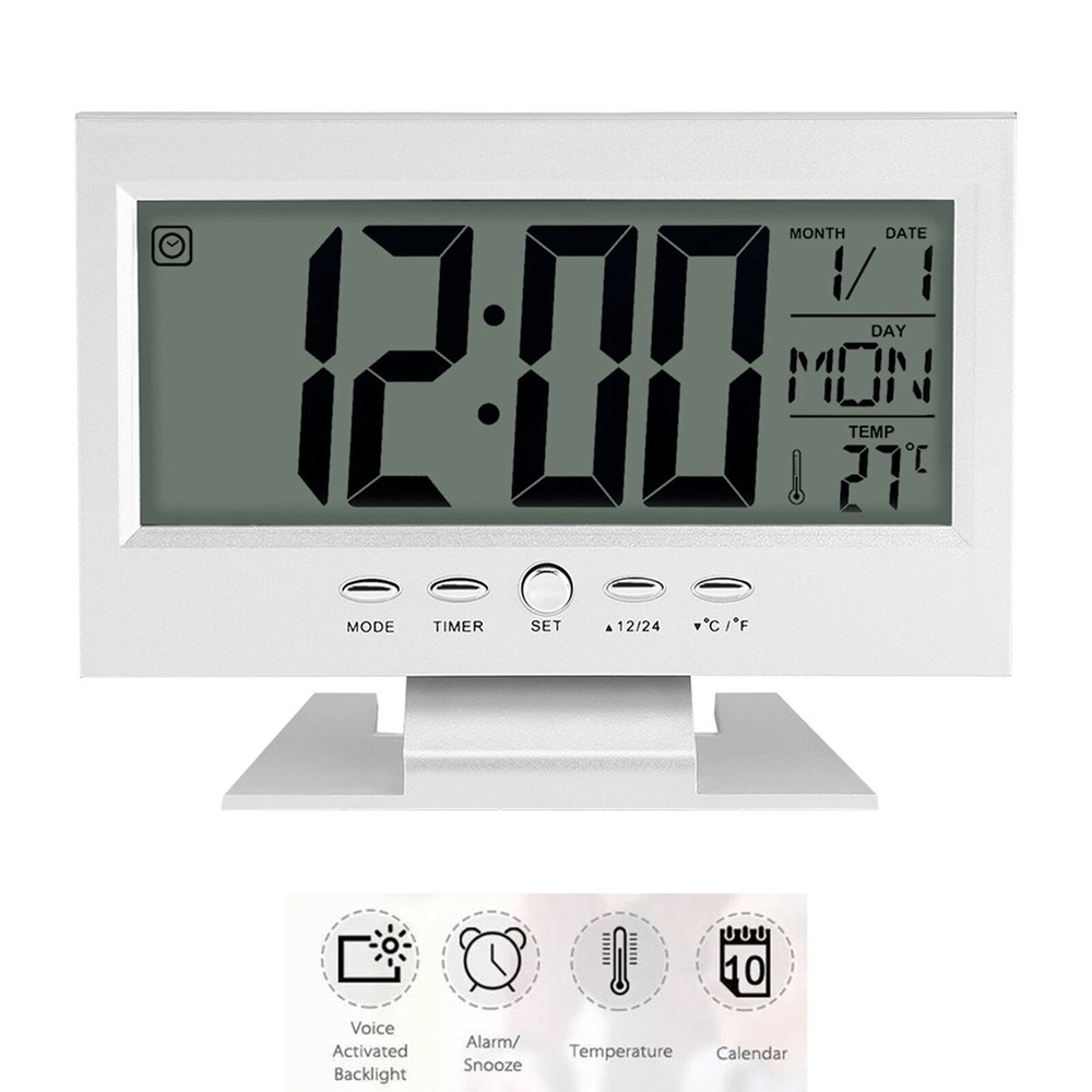 Feature: 1. Brand new and high quality multi‑functional electric clock with alarm and snooze function 2. Sound sensor light up function 3. Large LCD display will simultaneous display of date, time and week, and time can be shifted between 12:00 and 24:00 4. Real time display the temperature. °C and °F change freely for easy reading 5. Easy to use and place on the table or desk with the support bracket Specification: Features: Brand new and high quality multi-functional electric clock with alarm and snooze function. Sound sensor light up function. Large LCD display will simultaneous display of date, time and week, and time can be shifted between 12:00 and 24:00. Real time display the temperature. °C and °F change freely for easy reading. Easy to use and place on the table or desk with the support bracket. Specifications: Condition: Brand New Type: Clock Material: ABS Appearance: Rectangle Display Type: LCD Display Type: Number Display: Date, Time, Week, Temperature Battery: 2 * AAA Batteries(not included) Size: Approx. 14.5 x 11.2cm / 5.71 x 4.41'' Package included: 1 * Electric Clock Note: Please note that the new type and old type of this product will be sent randomly, and make sure you will not mind before ordering.