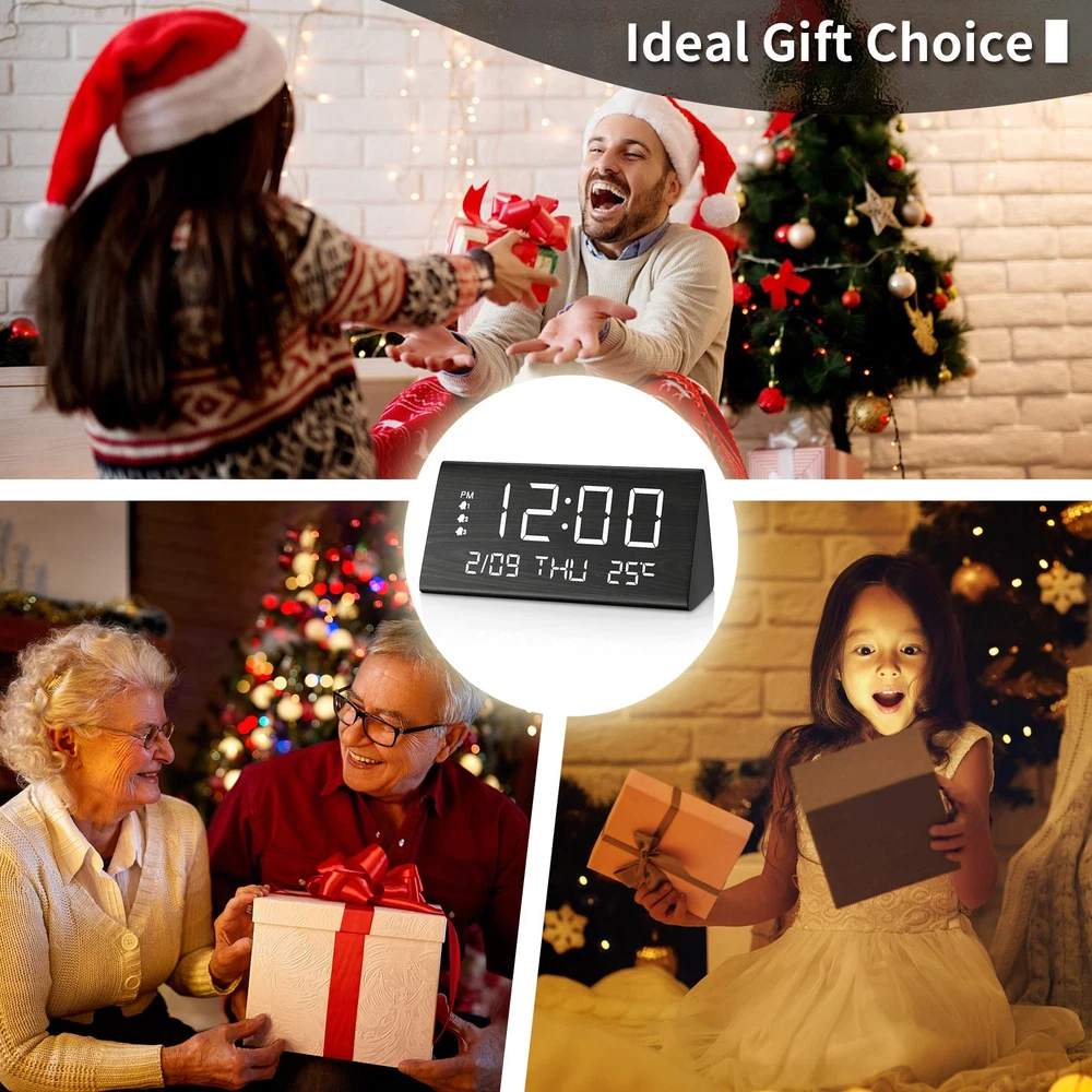 digital clock 【Sleek Display for Easy Management】- Keep your schedule on track with a glance. Our alarm clock independently displays the date, day of the week, temperature, three alarms, and AM/PM, giving you all the information you need in one place. 【Three Independent Alarms & 9 mins Snooze】- Say goodbye to generic alarm settings. Our clock allows you to set three independent alarms for daily, workday-only, or weekend-only modes. Plus, snooze for an extra 9 minutes of sweet dreams. 【Adjustable Brightness and Volume】- Personalize your experience with adjustable brightness and alarm volume. You're in control of how you wake up and start your day. 【Easy Operation】- Setting alarms has never been easier. We've optimized the process, so you can set your alarms with ease, even without the manual. 【Stylish Wooden Design for Décor】- More than just an alarm clock, it's a statement piece for your bedroom or living room. Our modern and stylish wooden design adds a touch of elegance to any space. Perfect as a gift for kids or anyone who appreciates style and functionality.