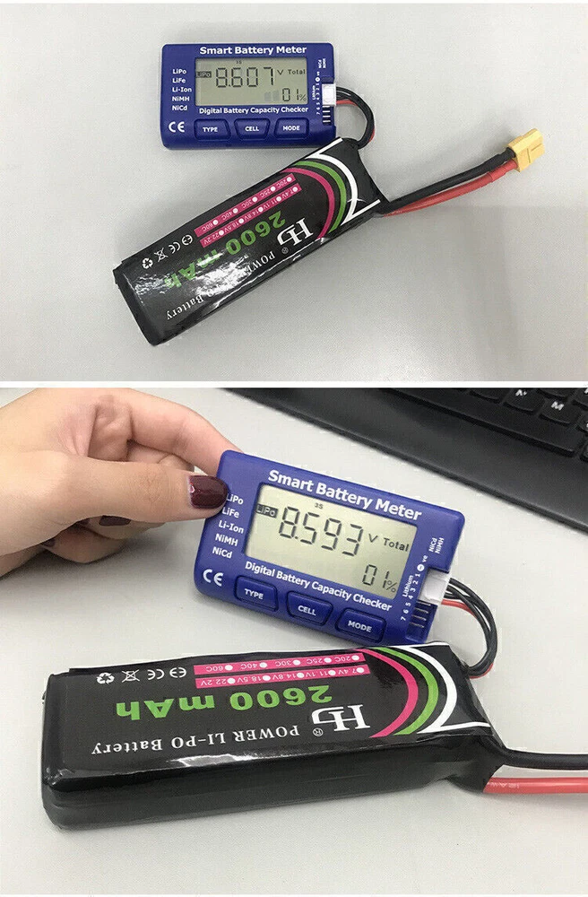 Product Description If you have any questions, please contact customer service first, do not open disputes easily, thank you! Features: Made from high quality plastic material, which is not only durable but also stable. Suitable for different battery type, including Lipo & LiFe & Li-Lon & NlMH & NiCd. Press the TYPE button to select LIPO (Lithium Polymer Battery), LIFE (Lithium Iron Battery), and LI-ION (Lithium Ion Battery). Press the CELL button to display the voltage and remaining battery capacity of each battery in turn. Press the MODE button to display the battery voltage, the monolithic voltage, the maximum voltage of the single chip, the lowest voltage of the single chip, and the highest and lowest voltage difference of the single chip. Being able to display the total number and total voltage of 1-7S Ni-MH and Ni-Cd batteries. Can be used as a steering gear tester Specifications: Product name: Digital Battery Capacity Checker Controller Material: Plastic Size: 8.5×5.1×1.7cm Color: Blue Battery type: Lipo & LiFe & Li-Lon & NlMH & NiCd Display voltage: 1-24V Package include: 1 x Digital Battery Capacity Checker Controller About Us We accept all payments authorized by eBay. powered by
