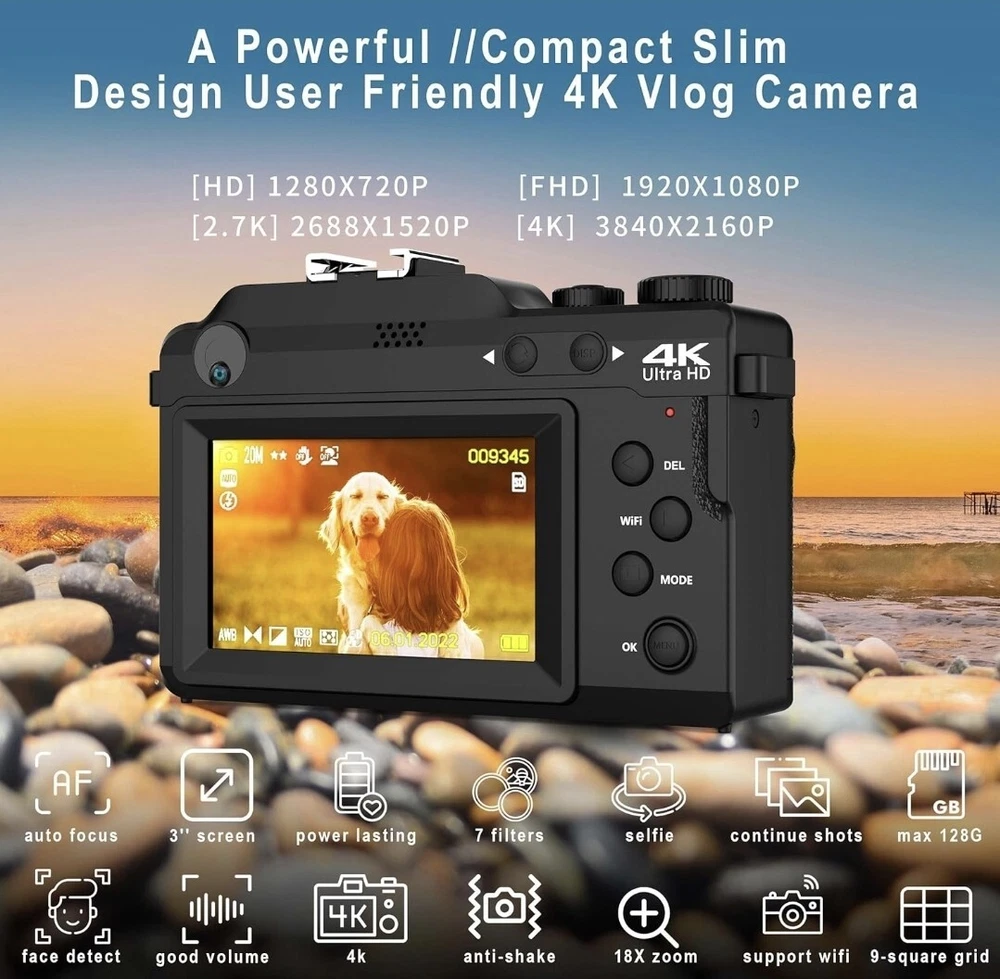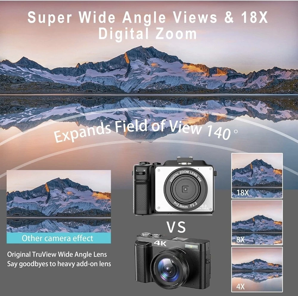 ✔【VLOGGING CAMERA WITH AUTO FOCUS & ANTI-SHAKE】Our digital camera delivers high-bit-rate 4K-resolution video and clear image at 48MP without missing any details. The 4k camera also supports 18X digital zoom. By just one-click you can take real auto focus and anti-shake photos. The free hand strap which you can wrap your finger around comfortably helps prevent dropping the video camera. ✔【A CREATIVE POINT AND SHOOT CAMERA!】The multifunction handgrip features an ergonomic design that puts important functions such as focus zoom and shutter buttons at your fingertips. There's even a scroll wheel under your index finger for making quick 7 color filters adjustments, so you get total creative freedom to make more funny pictures! ✔【TRUVIEW ORIGINAL WIDE ANGLE LENS】With the built-in wide-angle lens, this camera for photography is able to capture 45% more picture with every snap. There is no need to take heavy add-on lens, which greatly reduces your travel burden. With this 4k camera, you can shoot stunning photos of people, landscapes, selfies and more! ✔【WIFI & 9-SQUARE GRID FUNCTION】Pictures and videos can be instantly shared online with mobile phones through the Wi-Fi function, allowing friends to share your happiness in the first time without waiting any longer. The 9-square grid function enables you to take ideal pictures with better proportions, which makes you act like a professional photographers! ✔【BEST CAMERA FOR YOUTUBE】The YouTube camera for vlogging can be used as webcam for live streaming. Our vlogging camera also supports time-lapse, loop video, and slow video features. Compact but powerful for its size, this small camera is great for keeping in your pocket on those occasions when you want to travel light without having to take loads of lenses. We also offer you a 32G TF card so that you can use it the moment you receive it.