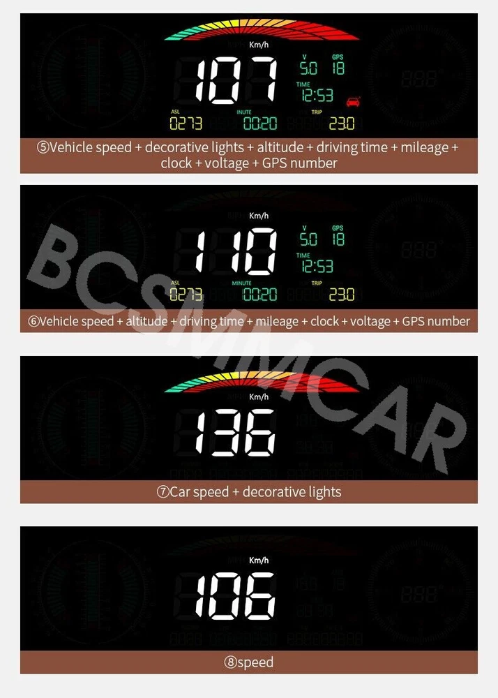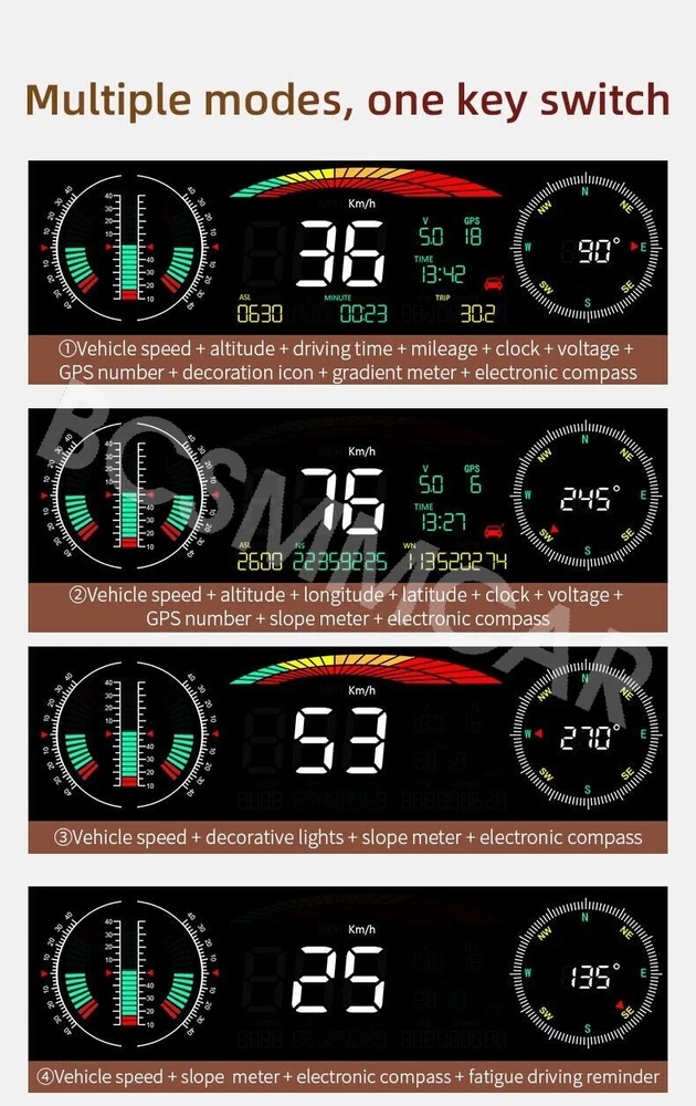 Product Description Car Compass HUD Head-Up Display Smart GPS Slope Meter Speedometer Overspeed Warning Gauge Digital Multi-Function Alarm Tool Add our listing to Watchlist Or Add to Cart , you will get more discount Main feature 1. Left tilt Slope meter 2. Front and rear Slope meter 3. Right Slope meter 4. Decorative icons 5. Voltage display 6. GPS number: flashing means searching for satellites, GPS light stops flashing and displays the number of satellites after the satellites are found 7.Driving direction: Driving direction indication:W=West, N=North, S=South, E=East when the vehicle speed >5KM / H (NW: Northwest NE: Northeast SW: Southwest SE: Southeast) 8. Altitude 9. Speed 10. Longitude display,driving time 11. The clock defaults to the UTC 8, and the time in the UTC 8 is displayed after the satellite signal is searched (adjust the local time zone according to the location) 12. Latitude display,mileage display 13. Fatigue driving icon, flashing reminder after accumulated driving for >4 hours 14. Compass direction scale Package included 1 x GPS Slope Meter 1 x Manual 1 x Suction cup holder 1 x Car Charger +USB cable Payment Returns Contact Us Shipping We accept payment by PayPal only ! Payment should be completed within 5 days after buyer places the order,or else an unpaid case will be opened in order to cancel the transaction. If you can not pay in time, please contact us. e-check from PayPal will only be processed once the payment clears. All of the items will be shipped to buyer's EBAY address,please confirm your address on Ebay before you buy.Your order will be usually shipped out the same or next business days once the payment is made and cleared. 30-day Warranty with Exchange for defective, malfunctioned, incorrect or parts-missing items. Please notify us and return the item with all parts and accessories packed and marked "FOR EXCHANGE" within 14 days of receipt. If defective, malfunctioned or parts-missing items are no longer available, a refund may be issued. All returning postage costs will be the responsibility of the buyers under all circumstances. If you encounter any problems about anything, please feel free to contact us and we will do our best to assist you solve the issue. If you are not satisfied in anyway, please feel free to let us know and give us a second chance to correct it before you decide to leave any neutral or negative feedback. Please contact us through eBay link if you have any questions. We will reply you within 24- 48 hours. Please check you spam mail if no response for 48 hours. All items will be checked before packing. All items are new and of high quality. Item will be shipped within 1 business days upon receipt of payment, excluding weekends and public holidays. If to USA,we will ship your order by USPS,it will take about 8-12 working days to you,and you can track it on line. If to other country,we will ship your order by China Post or Singapore Registered Air Mail,it will take about 14-21 working days to you,you aslo can track it on line. Delivery time is about 14-28 business days and it may take up to 8 weeks . Payment We accept payment by PayPal only ! Payment should be completed within 7 days after buyer places the order,or else an unpaid case will be opened in order to cancel the transaction. If you can not pay in time, please contact us. eCHECK from PayPal will only be processed once the payment clears. All of the items will be shipped to buyer's EBAY address,please confirm your address on Ebay before you buy.Your order will be usually shipped out the same or next business days once the payment is made and cleared. Returns 30-day Warranty with Exchange for defective, malfunctioned, incorrect or parts-missing items. Please notify us and return the item with all parts and accessories packed and marked "FOR EXCHANGE" within 14 days of receipt. If defective, malfunctioned or parts-missing items are no longer available, a refund may be issued. All returning postage costs will be the responsibility of the buyers under all circumstances. Contact Us If you encounter any problems about anything, please feel free to contact us and we will do our best to assist you solve the issue. If you are not satisfied in anyway, please feel free to let us know and give us a second chance to correct it before you decide to leave any neutral or negative feedback. Please contact us through eBay link if you have any questions. We will reply you within 24- 48 hours. Please check you spam mail if no response for 48 hours. Shipping All items will be checked before packing. All items are new and of high quality. Item will be shipped within 1 business days upon receipt of payment, excluding weekends and public holidays. If to USA,we will ship your order by USPS,it will take about 7-10 working days to you,and you can track it on line. If to other country,we will ship your order by China Post or Singapore Registered Air Mail,it will take about 14-21 working days to you,you aslo can track it on line. Delivery time is about 14-28 business days and it may take up to 8 weeks . Welcome to our Store ~