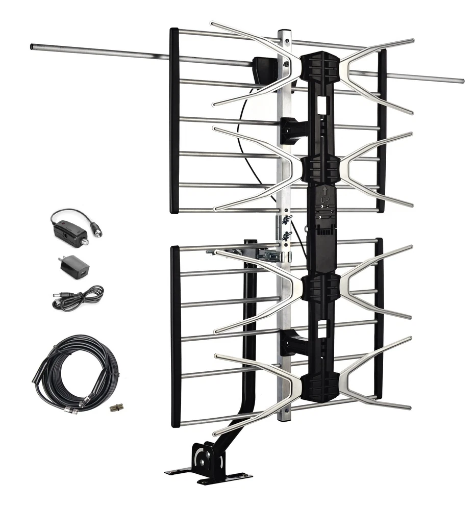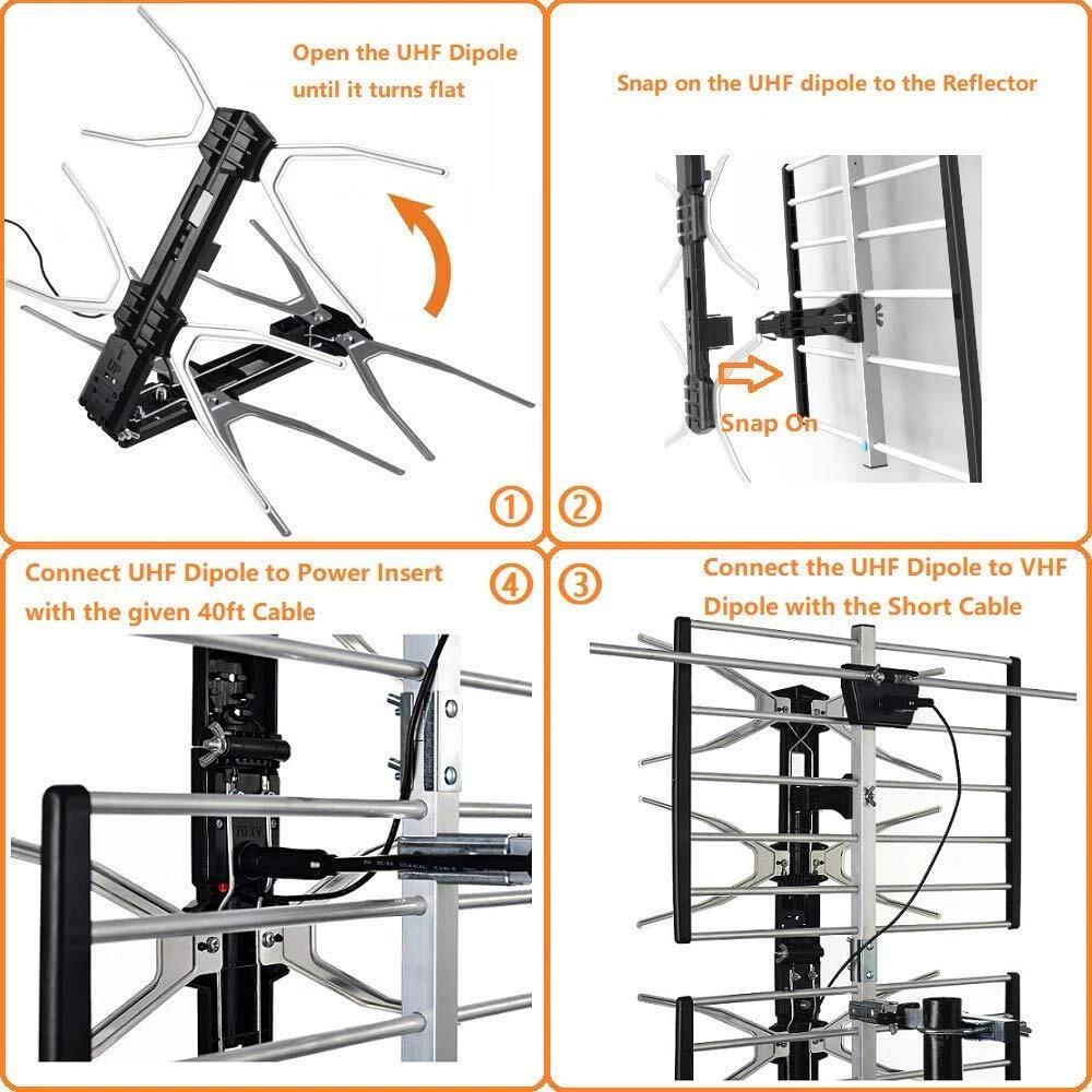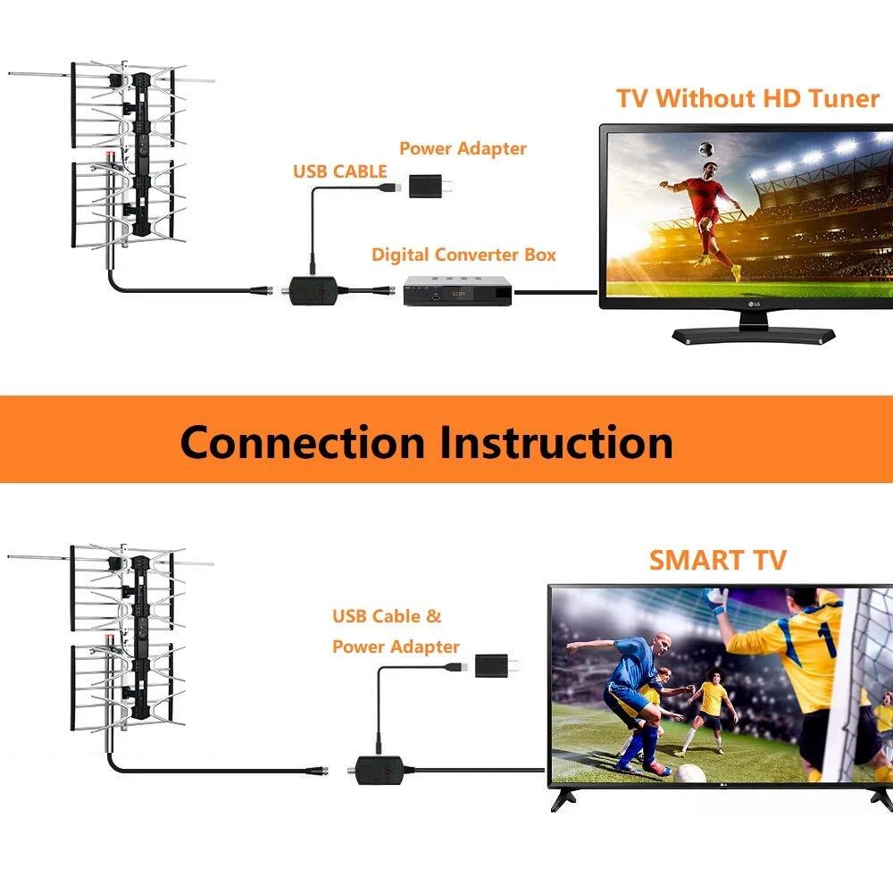 Digital HDTV Outdoor Amplified Antenna - 150 Miles Range - Mounting pole & 40FT RG6 Coaxial Cable included - Optimized Performance in UHF & VHF - Tools Free Installation This outdoor HDTV antenna is designed to received digital TV UHF/VHF signals while providing high quality HDTV pictures. You can enjoy high definition television without the high cost of cable or satellite. Note: Please do remember to connect the power insert with the antenna and amplifier. Otherwise the antenna wont work properly. Features: Receive digital and analog HDTV broadcast over the air Included power insert with indicator 4-Bay Phased Array designed Mostly pre-assembled, Easy unfolded system Superior sturdy construction to withstand tough outdoor weather conditions Included mounting pole, can be mounted in attic as well Specifications: Working Frequency: VHF 170~230MHz, UHF 470~860MHz Nose Figure: < = 3dB Antenna Gain: VHF 23dB, UHF 25dB Gain Adjustable range: VHF: 18~28dB, UHF: 20~30dB Reception Range: 150 Miles Impedance: 75Ohm Max Output Level: 105dB u V Main Voltage: AC120V +/- 10% / 60Hz Operation Temperature: -10 degree ~ 50 degree Coaxial Cable Length: 40FT Package Dimensions: 17.35*13.4*5.9 inches with 6.6 LBS Packaging Contents 1 X HDTV Yagi Antenna 1 X Power insert with indicator 1 X 40ft Coaxial Cable 1 X mounting pole 1 X 5ft USB Power Supply 1 X UL Adaptor Note: TV signal reception is immensely affected by the conditions such as antenna height, terrain, distance from broadcasting transmission antenna and output power of transmitter. Channels you can watch may vary depending on these conditions. 1. Digital HDTV 150 miles Long Range antenna: 4-Bay phased array Multi-directional TV antenna. Can pick up numerous Networks like ABC, CBS, NBC, Fox, etc. in Crystal Clear Uncompressed HD. Multi-directional Antenna: up to 180 degree reception angel. 2..High quality sound and picture you will have: This antenna will transmit over-the-air broadcasts in uncompressed full HD (1080P), ultra HD (4K) and 3D channels. Save monthly fee from cable or satellite agent: Antenna can pull in most of your local news, weather broadcast, sitcoms, kids and sports program FREE 3. Updated version in 2018: WA-2900-3D is an updated version with EASY UNFOLDED system to assemble. Tools Free installation. Added-on Light indicators will show whether the antenna is working or no. 4. ALL included: Antenna is more sturdy and with compact package, provided better protection during transportation. Mounting pole 16.5 inches and 40FT coaxial RG6 cable are included. Freely mount our antenna with pole INCLUDED on roof, attic, chimney, eave, mast or others. What you get- We stand behind our antenna with effort .Please Note: Freeview receptions are dependent upon environmental factors, we can not guarantee receptions in all conditions.