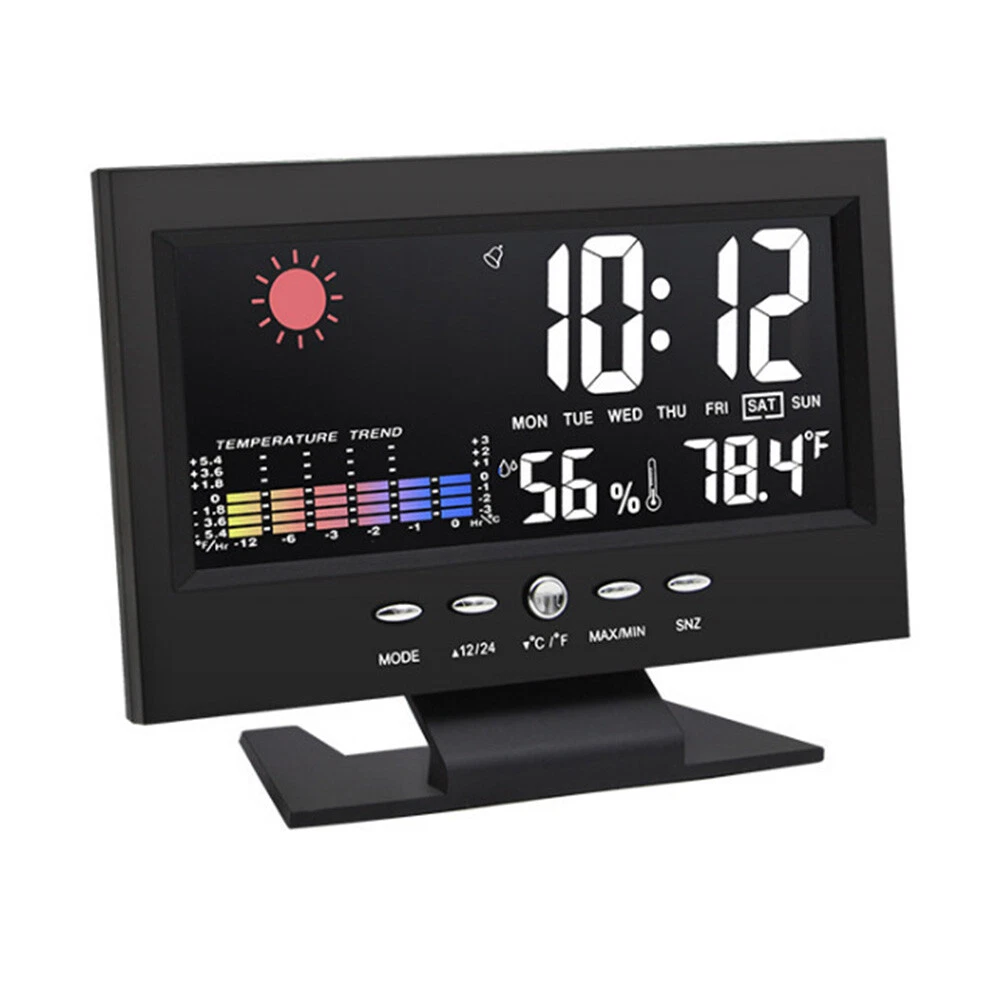 Description: 1. Clock display, 12/24 hours can be switched. 2. It can display time, weather, temperature, humidity, day of the week, temperature trend. 3. With alarm clock, snooze function, weather display, temperature trend indication, very practical. 4. Voice-activated backlight, energy-saving and convenient. You can turn off the voice-activated function through the switch on the back of the product. 5. Powered by 2 x 1.5V AAA batteries (not included). Specification: Material: ABS Color: Black Screen size: 107*58mm Temperature measurement range: -10-61°C / 14.2-140°F Humidity Measurement Range: 20%-99 Power supply: 2 * 1.5V AAA batteries (not included) Packing list: 1x Alarm clock (without battery) 1x USB charging cable Note: 1. When this product is powered by batteries, the screen backlight will not be always on (carbon batteries are recommended, please do not use high-power alkaline batteries) 2.When this product uses USB power supply, the screen will be always lit.