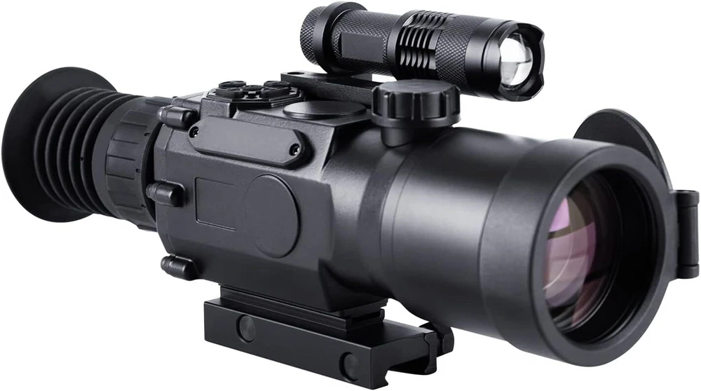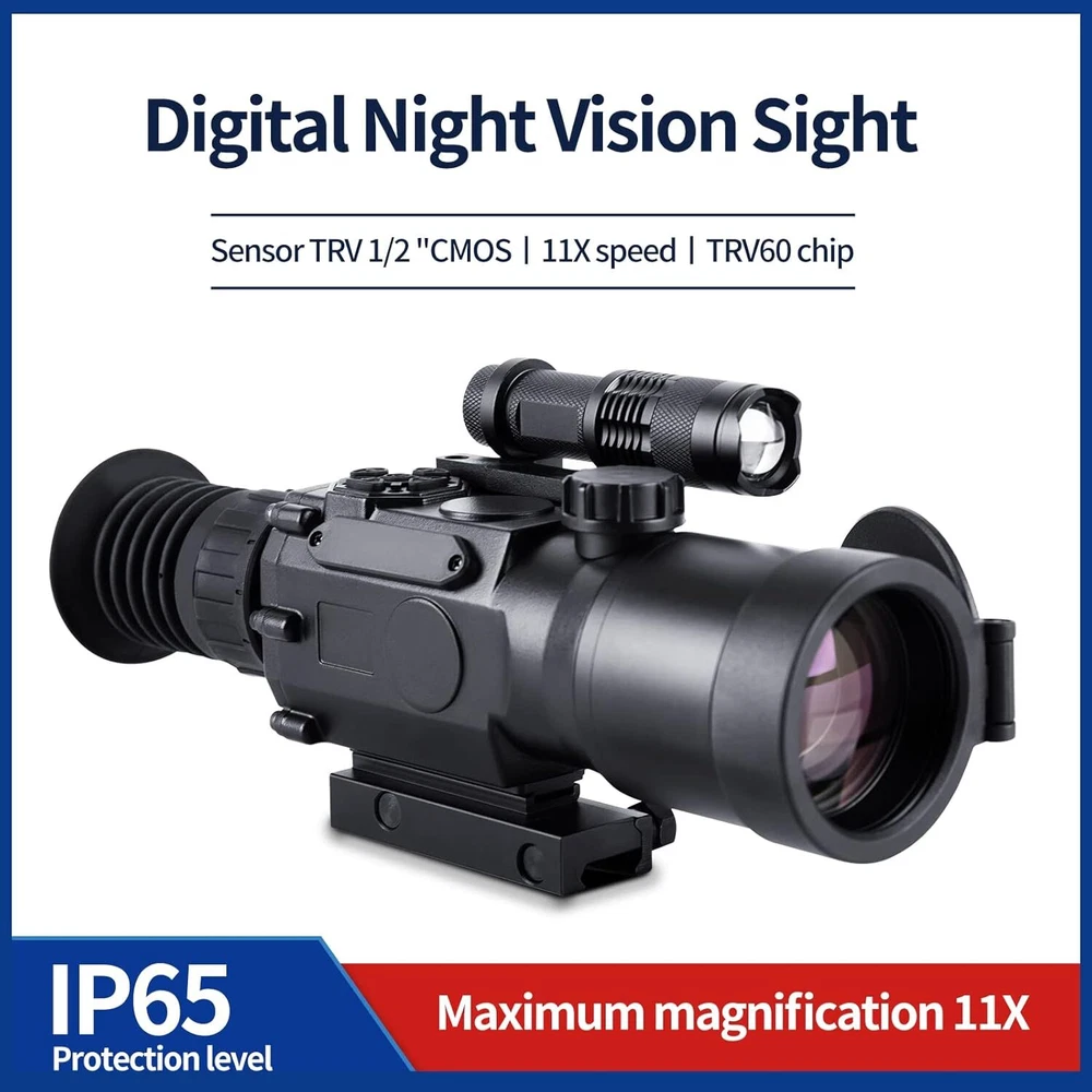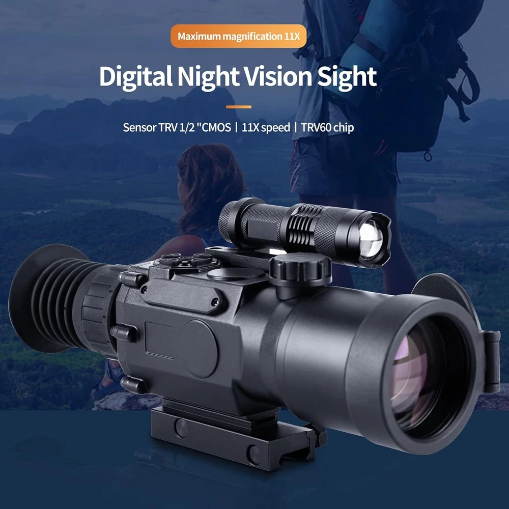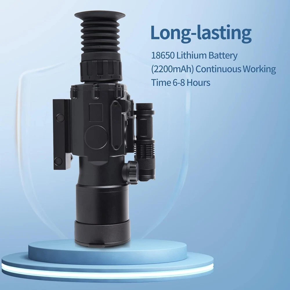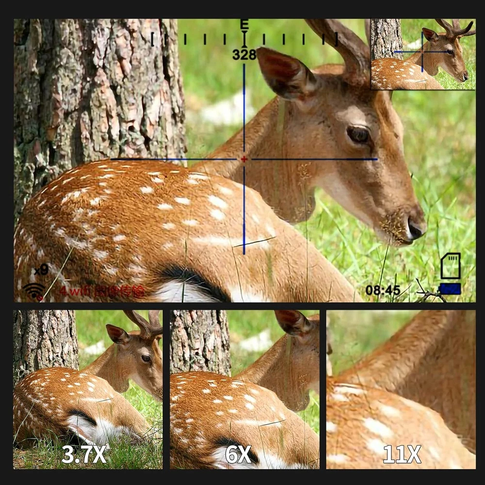 About this item Advanced Night Vision Technology: Equipped with cutting-edge night vision capabilities, this riflescope provides clear and detailed images in low-light conditions, enhancing your hunting and surveillance experiences. High-Definition Display: Enjoy a crisp and vivid viewing experience with the high-definition display, ensuring precise target identification and engagement, even in the darkest environments. Versatile Magnification Range: Offering a magnification range of 3.7X to 11X, the riflescope adapts to various shooting distances, making it ideal for a wide range of outdoor activities. Durable and Lightweight Magnesium-Aluminum Design: Crafted from a high-strength magnesium-aluminum alloy, this riflescope is engineered for resilience and durability. It withstands rugged outdoor use while maintaining a lightweight profile, ensuring ease of handling and superior maneuverability in various field conditions. Long Battery Life: Engineered for extended field use, the riflescope boasts a long battery life, ensuring reliable performance during prolonged hunting or surveillance sessions. Product Description Q: Can this scope be mounted on any rifle? A: Yes, the scope can be mounted on most rifles with standard Picatinny or Weaver rails. Q: Is the scope waterproof? A: The scope has an IP65 rating, which means it is dust-tight and can withstand A: The scope has an IP65 rating, which means it is dust-tight and can withstand Q: Can I record videos and take photos with this scope? A: Yes, the scope has a built-in video recording feature with a resolution of 1920*1080P, and it can also capture still images. Q: What is the maximum MicroSD card size supported by the scope? A: The scope supports MicroSD cards ranging from 8GB to 64GB. Q: Can I customize the reticle color and pattern? A: Yes, the scope offers multiple reticle choices and colors, allowing you to select the best option for your specific needs and preferences.