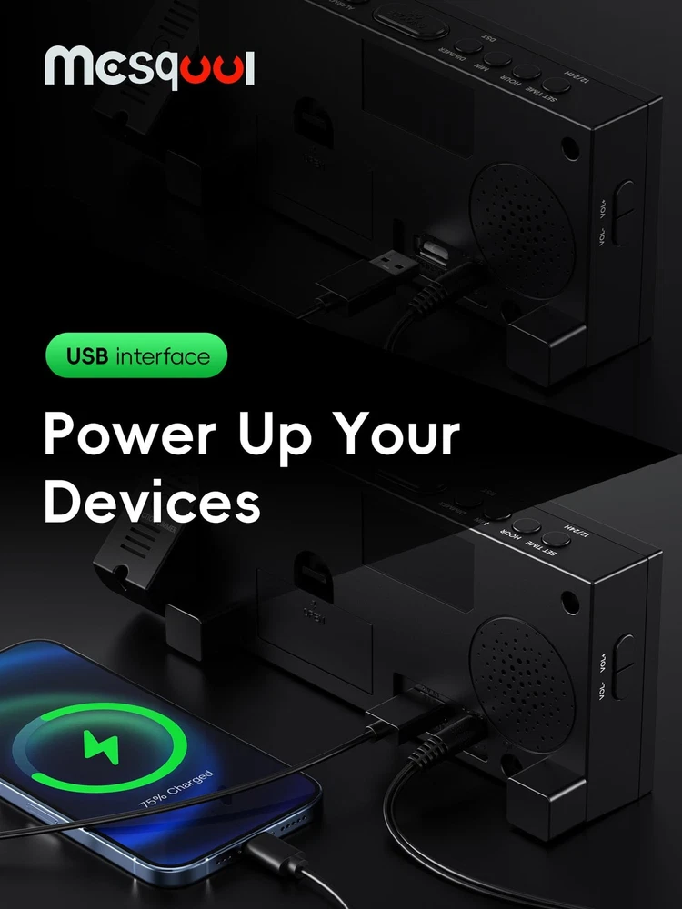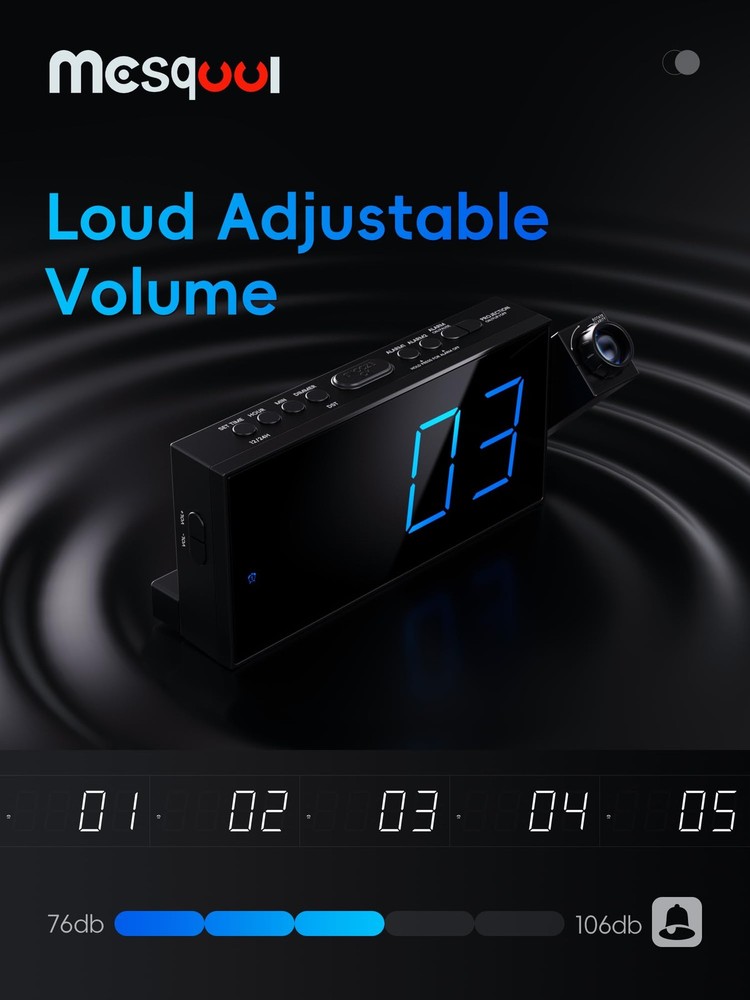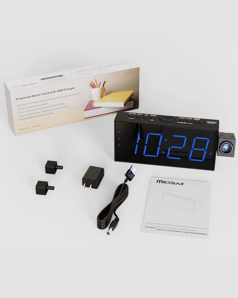 Project clear time on wall or ceiling With 350° adjustable swivel projector, this clock projects the time right onto your wall or ceiling for easy, stress free viewing - all you have to do is open your eyes. Turn on or off as needed. The best thing is that you can project the time really easy. Just repeatedly press “Projection” button and it will appear vividly on your wall. Not Too Faint, Not Too Bright--Just Right The high, medium, and low brightness settings ensure you can easily read the display during the day or night, without being distracted while trying to fall asleep. Charge While You Listen--or While You Sleep Your iPad, iPhone and your smartphone will charge while docked to help you avoid a drained battery, whether you're listening or not. Wake up with a smile and your mobile devices always fully charged! Package Contents: 1* alarm clock 1* US Plug 1* User Manual 2* Black Holders Important: Q: What should I do if this projection numbers on the ceiling is fuzzy? A: Please rotate the focus ring for proper angle to adjust it from fuzzy image to be clear as you desire. Q: How to adjust time numbers from reversed to be normal? A: please press the Projection button once again until make projection numbers to be normal. controller_type: Auto&Manual age_range_description: Over 3 years old 🥰180° 𝗥𝗢𝗧𝗔𝗧𝗔𝗕𝗟𝗘 𝗦𝗪𝗜𝗩𝗘𝗟 𝗣𝗥𝗢𝗝𝗘𝗖𝗧𝗢𝗥✨--Designed with 180° rotatable swivel projector and projects ultra-clear time onto wall or ceiling within the optimum projection distance 1.6-9.8ft, allowing you easily read it even lying on the bed. For more clarity of projection image, you can rotate focus ring🔄 of the ceiling clock by proper angle. Press Projection Mode button to flip the orientation of upside down projection images so the numbers are always right-side-up. 🆕𝗨𝗟𝗧𝗥𝗔 𝗖𝗟𝗘𝗔𝗥 𝗣𝗥𝗢𝗝𝗘𝗖𝗧𝗜𝗢𝗡 𝗪𝗜𝗧𝗛 𝟱-𝗟𝗘𝗩𝗘𝗟 𝗔𝗗𝗝𝗨𝗦𝗧𝗔𝗕𝗟𝗘 𝗕𝗥𝗜𝗚𝗛𝗧𝗡𝗘𝗦𝗦 𝗗𝗜𝗠𝗠𝗘𝗥--The projection part has a dimmer switch with 5 levels, which can be adjusted to your preference. This is helpful for people who are sensitive to light at night and want to reduce the brightness of the bright projection shines on the ceiling. ⏰ 𝗗𝗨𝗔𝗟 𝗔𝗟𝗔𝗥𝗠𝗦 𝗪𝗜𝗧𝗛 𝗖𝗢𝗡𝗩𝗘𝗡𝗜𝗘𝗡𝗧 𝗕𝗜𝗚 𝗦𝗡𝗢𝗢𝗭𝗘 𝗕𝗨𝗧𝗧𝗢𝗡--The projection clock can be set two separate alarms for couples with different routines or a backup for waking up heavy sleepers. The snooze button 💤 is in a convenient central location to turn off alarm to get extra 9 mins sleep before alerting you again. 🔊𝗔𝗗𝗝𝗨𝗦𝗧𝗔𝗕𝗟𝗘 𝗔𝗟𝗔𝗥𝗠 𝗩𝗢𝗟𝗨𝗠𝗘--The alarm volume of this loud alarm clock can be adjusted to your preference by pressing "V+" or "V-" buttons, with levels ranging from 1-5. The incremental increase in volume ensures that the alarm sound gradually gets louder, making it less jarring to wake up to. 🔆𝟳" 𝗟𝗔𝗥𝗚𝗘 𝗦𝗨𝗣𝗘𝗥-𝗖𝗟𝗘𝗔𝗥 𝗧𝗜𝗠𝗘 𝗗𝗜𝗦𝗣𝗟𝗔𝗬 𝗔𝗟𝗔𝗥𝗠 𝗖𝗟𝗢𝗖𝗞 𝗪𝗜𝗧𝗛 𝟱-𝗟𝗘𝗩𝗘𝗟 𝗗𝗜𝗠𝗠𝗘𝗥--7" ultra-large display of the ceiling projection alarm clock enables you to easily view the time even across the room even with glasses👓 off and perfectly for elders. You can dim the display if you are sensitive to light at night by repeatedly pressing "DIMMER" switch with 5 levels, which is also good for protect your eyes. 🔌𝗖𝗢𝗥𝗗𝗘𝗗 𝗖𝗟𝗢𝗖𝗞/𝗕𝗔𝗧𝗧𝗘𝗥𝗬 𝗕𝗔𝗖𝗞𝗨𝗣/𝗨𝗦𝗕 𝗖𝗛𝗔𝗥𝗚𝗜𝗡𝗚 𝗣𝗢𝗥𝗧--This electric alarm clock should always connect with the AC Power for all functions work. It also offers memory backup functionality using 2x AAA batteries (NOT included) to remember the time and clock settings. (When power outage, you don't need to set the time and alarm again.) Besides, the plug-in clock has a built-in 5V/1.0A USB output interface, allowing you to charge Android and iOS cellphones and tablets while asleep. 🎁𝗘𝗔𝗦𝗬-𝗧𝗢-𝗦𝗘𝗧&𝗦𝗧𝗬𝗟𝗜𝗦𝗛--This projection clock's user-friendly and intuitive buttons make setting the time a breeze, even for tech novices like children or seniors. By hold pressing the "DST" button, the DST function is activated. And the time format can be easily customized by long-pressing the 12/24H button to suit individual preferences. This clock makes for a practical and stylish gift that can be cherished by all your loved ones on special occasions. Projection distance and its ceiling size: 3.28ft = 9x 3.54 inch; 6.56ft = 18.9x 7.09 inch; 9.84ft = 25.59x 10.24 inch