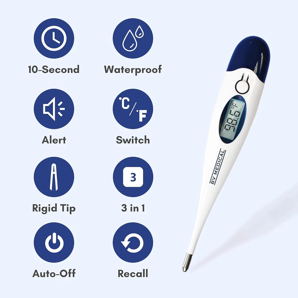 Store New Arrivals Add to Favorite View Feedback Contact Digital Thermometer Rigid Tip 10Sec. W/100 Probe Covers Pack Description Unit Count 1.0 Count Display Type Digital Power Source Battery Powered Color White Special Feature Waterproof Country of Origin China Batteries 1 LR44 batteries required. (included) Age Range (Description) Adult, Child, Senior, Teen Specification Met FDA Package Dimensions 7.72 x 3.43 x 2.36 inches; 5.29 ounces Included Components Battery, Probe covers A 10-second rigid tip digital thermometer which can be used for oral, rectal, or underarm use The thermometer beeps when peak temperature is reached, is able to recall last reading, and will automatically shut-off when idle Able to switch temperature reading from Celsius to Fahrenheit and vice versa Comes with digital thermometer, storage case, one battery, instruction manual, and 100 probe covers Easy-to-use one button operation and easy-to-read display Product Description Digital Thermometer Rigid Tip 10-Second with 100 Probe Covers Pack A 10-second rigid tip digital thermometer which can be used for oral, rectal, or underarm use. The thermometer beeps when peak temperature is reached, is able to recall last reading, and will automatically shut-off when idle. Comes with storage case, one battery, and 100 probe covers. Product Includes: Digital Thermometer, Storage Case, Battery (LR41), and 100 Probe Covers Digital Thermometer Features This thermometer gives a readout in 10 seconds and is able to recall the last temperature reading. Other features include waterproof, fever alarm, switch from Celsius to Fahrenheit, auto-off when idle, and may be used for axillary, rectal, or oral use. Easy-to-Use The simple rigid thermometer is simple to use with one button operation. The thermometer comes with a storage case. May be used for personal or professional use. Display makes it easy to read temperature. 100 Probe Covers Includes 100 probe covers, so you are prepared and don't need to buy it separately. Includes one digital thermometer, storage case, 100 probe covers, battery (LR41), and instruction manual. All in one! About Us Since 1989 BV Medical has been rapidly delivering diagnostic, respiratory, and medical instruments with the right quality, right quantity, and at the right time. Small Business To enhance customers' health Digital Thermometer Rigid Tip 10-Second with 100 Probe Covers Pack A 10-second rigid tip digital thermometer which can be used for oral, rectal, or underarm use. The thermometer beeps when peak temperature is reached, is able to recall last reading, and will automatically shut-off when idle. Able to switch temperature reading from Celsius to Fahrenheit and vice versa. Comes with digital thermometer, storage case, one battery, instruction manual, and 100 probe covers. 10-second reading Auto shut off once idle Able to recall last temperature Waterproof Comes with 100 probe covers May be used for axillary, rectal, or oral ABOUT US We offer the best prices around on high quality products. Our E-store includes media such as books, movies, music and games while offering electronics, toys, sporting apparel, clothing, tools, general home, garden items and more. SHIPPING We are always working hard to ensure your package arrives as soon as possible. Please understand that some factors like weather, high postal traffic, and the performance of shipping companies are outside of our control. We offer free shipping to the lower 48 states and ship within 2 business days of payment, usually sooner. We do not accept P.O. Boxes. Please provide a physical address. For shipping outside of the continental USA, we only use eBay's Global Shipping Program.The item is shipped to KY and then sent to the rest of the world. International customers are responsible for all duties and taxes. Continue to check out in order to calculate costs for shipping the item to your country. Messages regarding eBay's Global Shipping Program MUST be directed at eBay EXCLUSIVELY. RETURNS We offer a 30-Day Return Policy on items which you are not completely satisfied with. You have the option for a full-refund or an exchange of the item. No returns are available on items shipped outside of the USA. PAYMENT We accept PayPal. CONTACT US This page content is yet to come Please ad us to your favorite seller and visit again later Thank You CUSTOMER SATISFACTION We try our very best to make sure every customer is completely satisfied. If there's a problem, message us! We're happy to help. WE ACCEPT Copyright © 2021 AutoDS. | All Rights Reserved