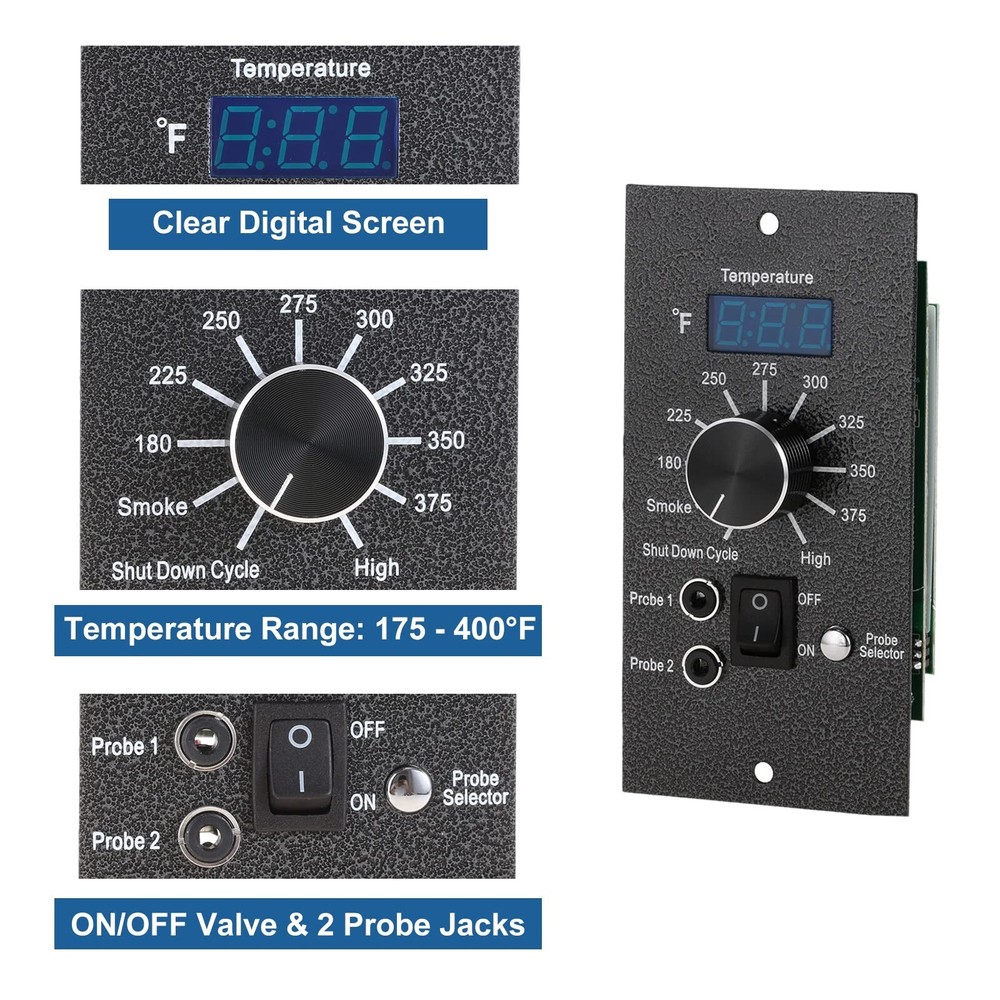 Digital Grill Controller Thermostat Kit Replacement for Traeger Pro 20/22/34 Wood Pellet Grills, BAC365 Thermostat Control Panel with RTD Temperature Sensor and 2 Meat Probe Product Details Brand: DRELD Special Feature: High Accuracy Age Range (Description): Adult Included Components: 1 x digital TR temperature control panel, 1 x temperature probe sensor, 2 x meat probes, 2 x probe clips See more Outer Material: Plastic Specification Met: Oem Display Type: Digital Product Care Instructions: Wipe Clean Power Source: Battery Powered Item Length: 9.84 Inches Package Dimensions : 10 x 3.7 x 3.03 inches; 15.52 ounces Item model number : d016b240-02bb-4346-a0a8-41c0d1861e7f Date First Available : July 29, 2021 Manufacturer : DRELD Best Sellers Rank: #540,644 in Patio, Lawn & Garden (See Top 100 in Patio, Lawn & Garden) #942 in Grill Thermometers #942 in Grill Thermometers Customer Reviews: 3.9 3.9 out of 5 stars 14 ratings [COMPATIBILITY]: Perfect replacement for traeger pro 20/22/34 bac365 pro series wood pellet smoker grills controller. [MULTIPLE SETTINGS]: The grill thermometer board boasts eight cook temperature settings (180 through 375 degrees) and high (up to 450), you can choose the best barbecue temperature easily, which could meet your various delicious needs. [DISPLAY]: It's easy to display accurate temperature, and also you can read it directly under the sunlight through our digital temperature controller kit. [PREMIUM QUALITY]: Strict quality control standards to Build and test. Pretty easy to snap into place. Not OEM but fits OEM Standards, the quality is equivalent to OEM requirements. this digital thermostat kit will bring you a great convenience. [GUARANTEE AND SERVICE]: This set of grill temperature controller comes with a six-month warranty. If the product failure, simply contact us, our customer service will reply you within 24 hours.