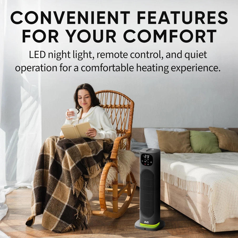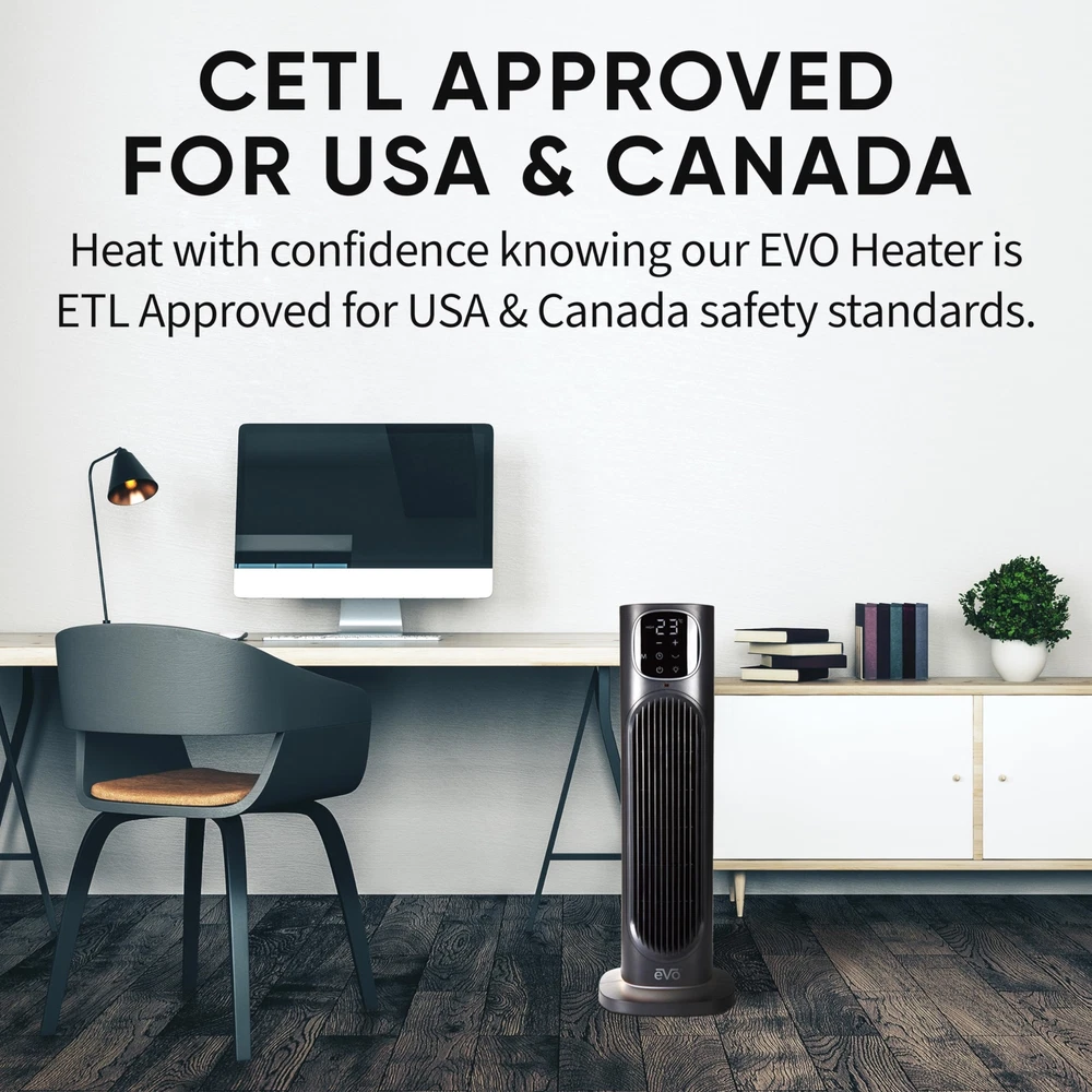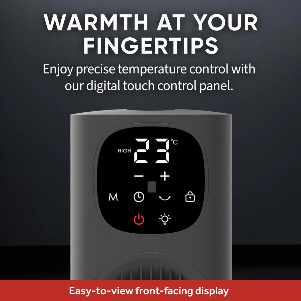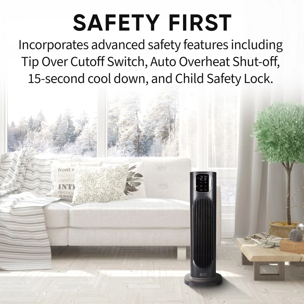 The Digital Tower Ceramic Heater provides warm, comfortable, and energy-efficient heating with its wide-angle heat dispersion, precise temperature control, smart Heat Logic Technology, convenient features, and safety features. WARMTH AT YOUR FINGERTIPS – Enjoy wide-angle heat dispersion and precise temperature control with our Heater's 23” oscillating ceramic tower design and digital touch control panel. SAFETY FIRST – Our Heater incorporates advanced safety features for your peace of mind, including Tip Over Cutoff Switch, Auto Overheat Shut-off Protection, 15-second cool down, and Child Safety Lock. SMART ENERGY SAVINGS – Our Heat Logic Technology intelligently adjusts power levels based on room temperature, ensuring energy efficiency and day or nighttime comfort. CONVENIENT FEATURES FOR YOUR COMFORT – Enjoy independent oscillation control, an LED night light, a remote control, and quiet operation for a comfortable and personalized heating experience. ETL APPROVED FOR USA & CANADA – Our Heater is CETL Approved for USA & Canada safety standards, ensuring you can use it with confidence.