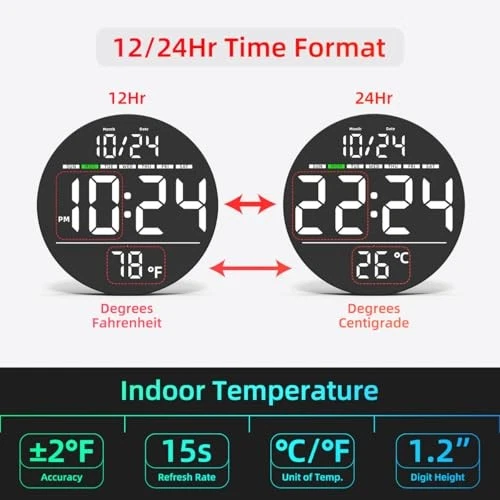 Return Policy Fast Delivery Trusted seller Digital Wall Clock with Large LED Display, Auto-Brightness, Temperature, Low-Reflectivity, Small Silent Non-Ticking Modern Electric Wall Clock for Bedroom, Living Room, Office, Classroom, Farmhouse Product Description 8-INCH LARGE LED DISPLAY: The full screen LED display (with up to 2.7-inch big digits) allows you to read clearly in a far distance. Especially user friendly for those who with eyesight problems. 3-LEVEL AUTO-BRIGHTNESS: Preset an ambient light sensor to automatically change its displaying brightness, make it comfortable for human eyes at any time. LOW-REFLECTIVITY SURFACE: Printed with low reflective coating, which means it can be viewing from any angles in the most demanding ambient lighting environments. INDOOR TEMPERATURE: Built-in temperature sensor features an accuracy of ±2°F and the data refreshes every 15 seconds, making it ideal for measuring dynamic temperature of the indoor places, just like warehouse, gym, etc. SUITABLE FOR DIFFERENT PLACES: It fits perfectly for bedroom, living room, garage, office, warehouse, farmhouse, kitchen, classroom, gym and any other places. Ideal gift for family and the elderly. VERY EASY TO USE: This PLUG-IN wall clock is extremely easy to set up and the 10Ft long USB Cable makes it possible for you to hang it wver you want. ATTENTION: It is a PLUG-IN electric wall clock, NOT a battery-operated clock. The backup battery can only help to preserve time in case of power outage. Shipping Returns Payment Shipping Shipping is FREE to all addresses other than APO/PO boxes in the lower 48 states. All our stock ships from US-based warehouses. Shipped via USPS or UPS (depending on location and package weight) Unless stated otherwise, all orders will ship within 24-72 hours of your payment being processed. Check our feedback to see the great reviews of FAST shipping we offer. Returns Seller does not accept returns Payment We currently accept payment via eBay managed payments only. Once payment is cleared, we will dispatch your shipment within 1-3 business days. Please refer to the "Shipping" tab for more information regarding shipping speed to your destination.